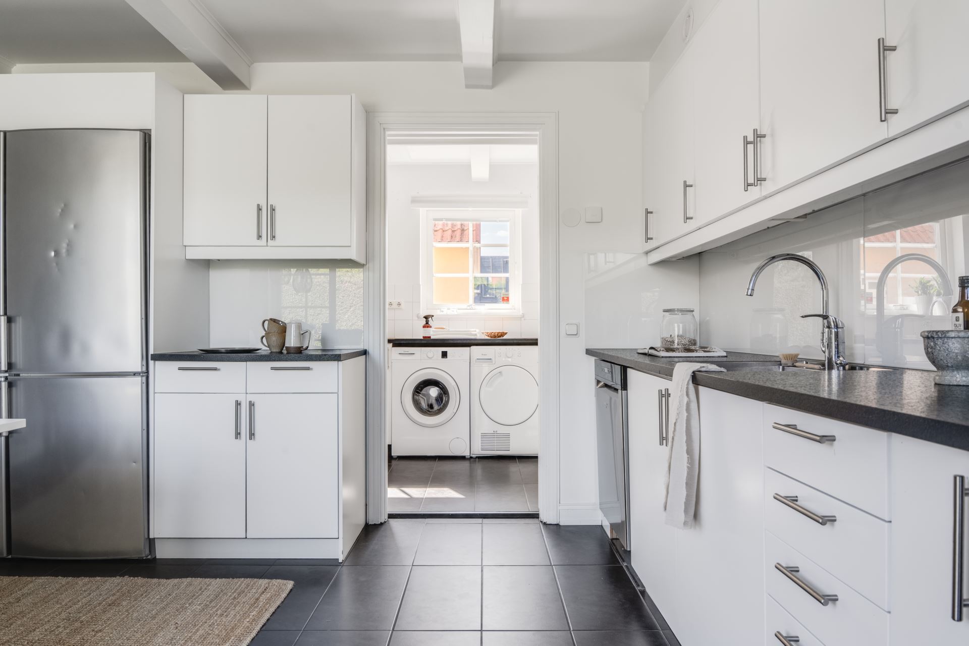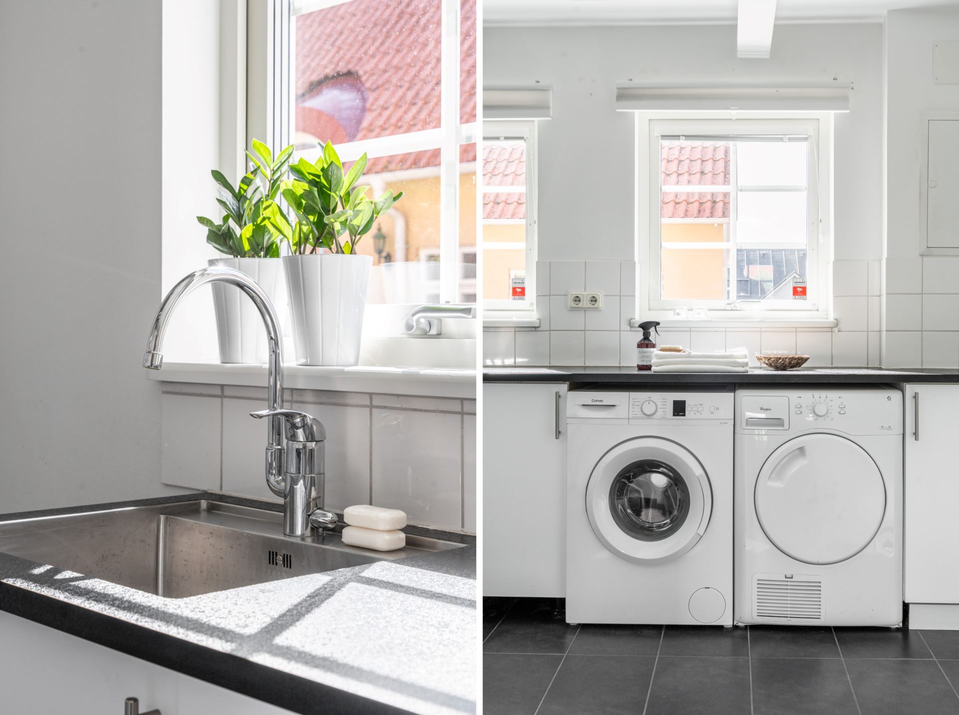 Från köket når vi husets tvättrum, av god storlek med praktiskt svart klinker på golv, stänkskydd i vitt kakel som ackompanjeras med vita väggar. Tvättmaskin från Cylinda (2024) och Torktumlare från Whirlpool (2013), förvaringsmöjligheter nedtill, arbetsytor i svart och infälld vask med fönster som skänker ljus ovanför.