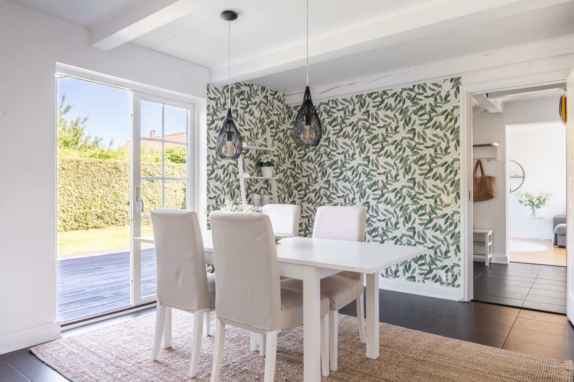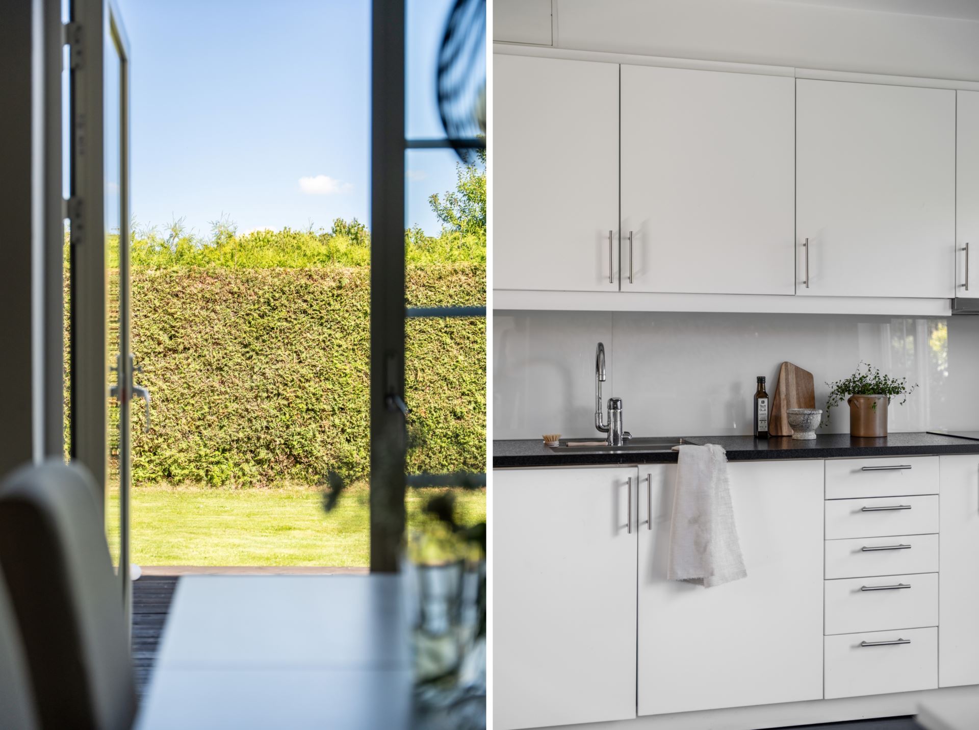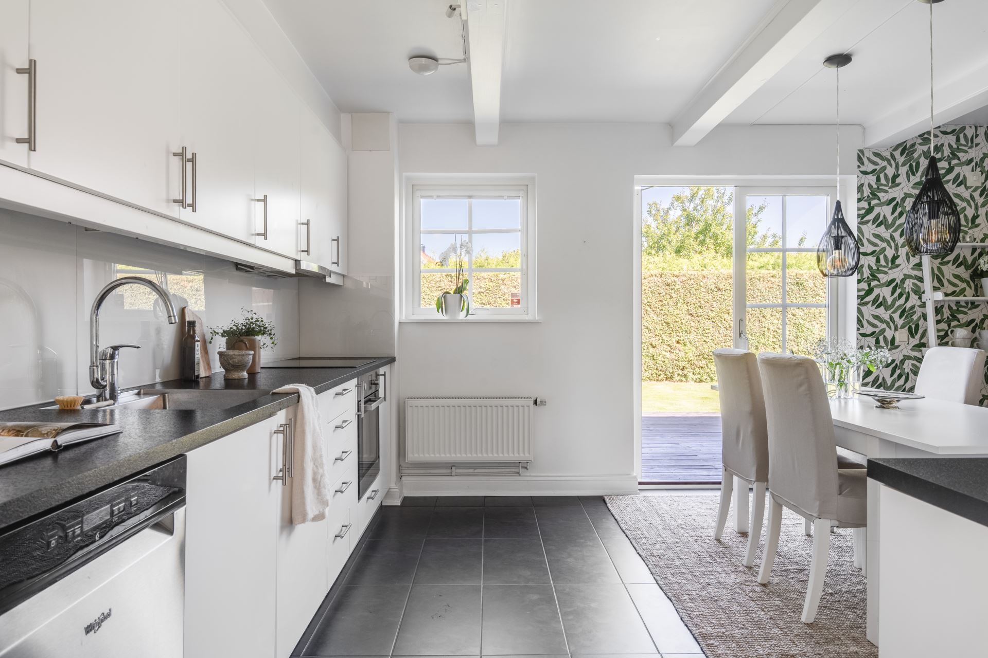 Mitt emot vardagsrummet når vi köket, med svart klinkergolv, vita väggar, och fondtapet i vitt och grönt, samt vitmålade takbjälkar. Interiören är tidlös och består av stommar i trä, och har goda förvaringsmöjligheter bakom vita släta luckor, som stilsäkert möter bänkskiva i samma kulör som golvet, och som bryts av med stänkskydd i en ljusgrå ton.