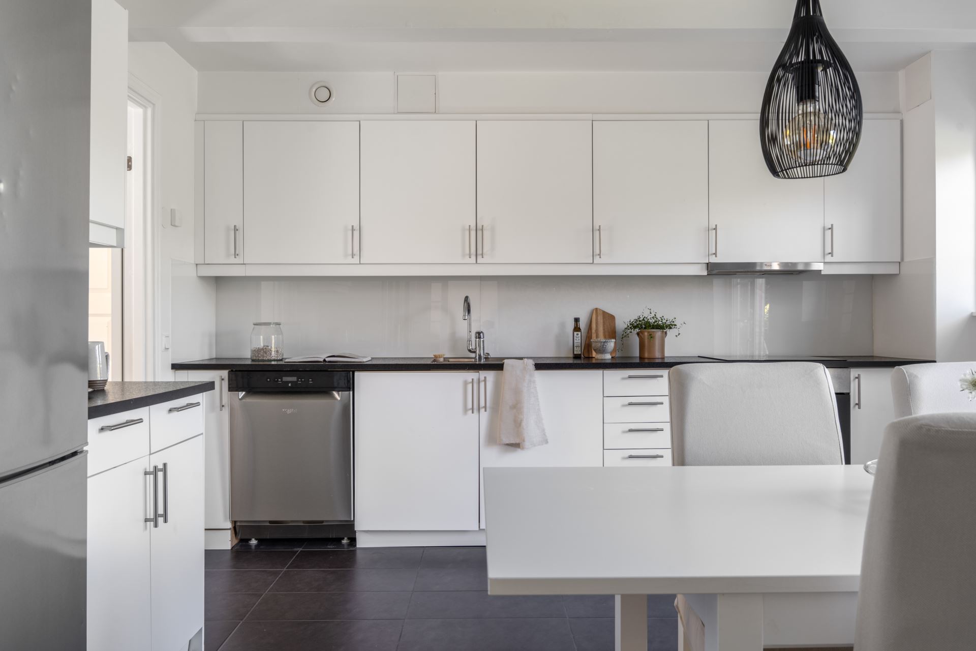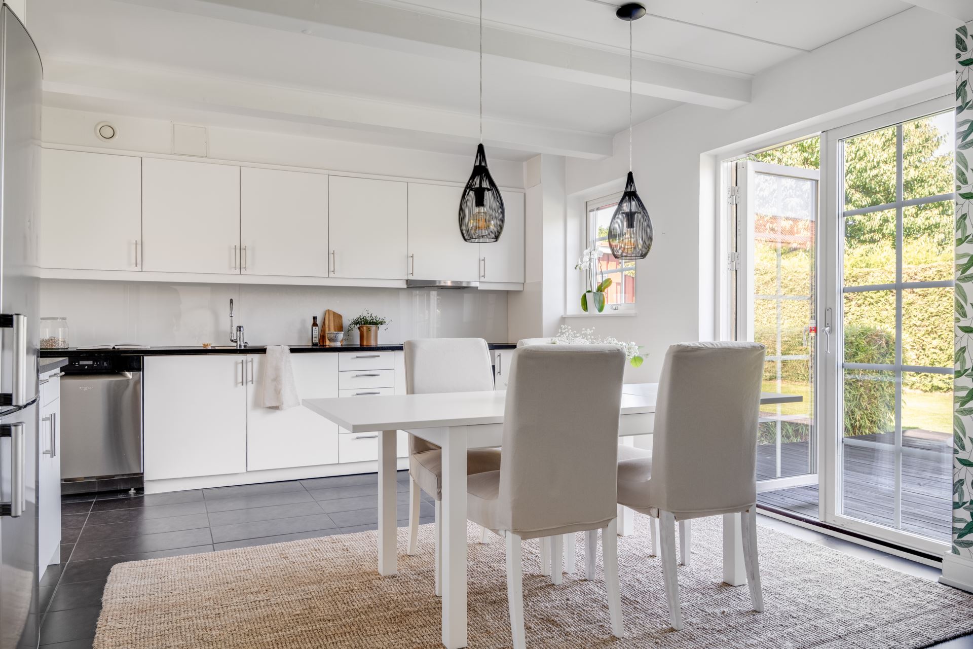 Maskinparken består av delad kyl och frys från Whirlpool (2013), diskmaskin (2019), induktionshäll (2021) och ugn (2013), samt fläkt från Whirlpool (2013). Pricken över i är det naturliga ljusinsläppet från glasdörrspartier, ut mot uteplatsen, som blir den perfekta förlängningen av köket, och den ultimata platsen för umgänge.