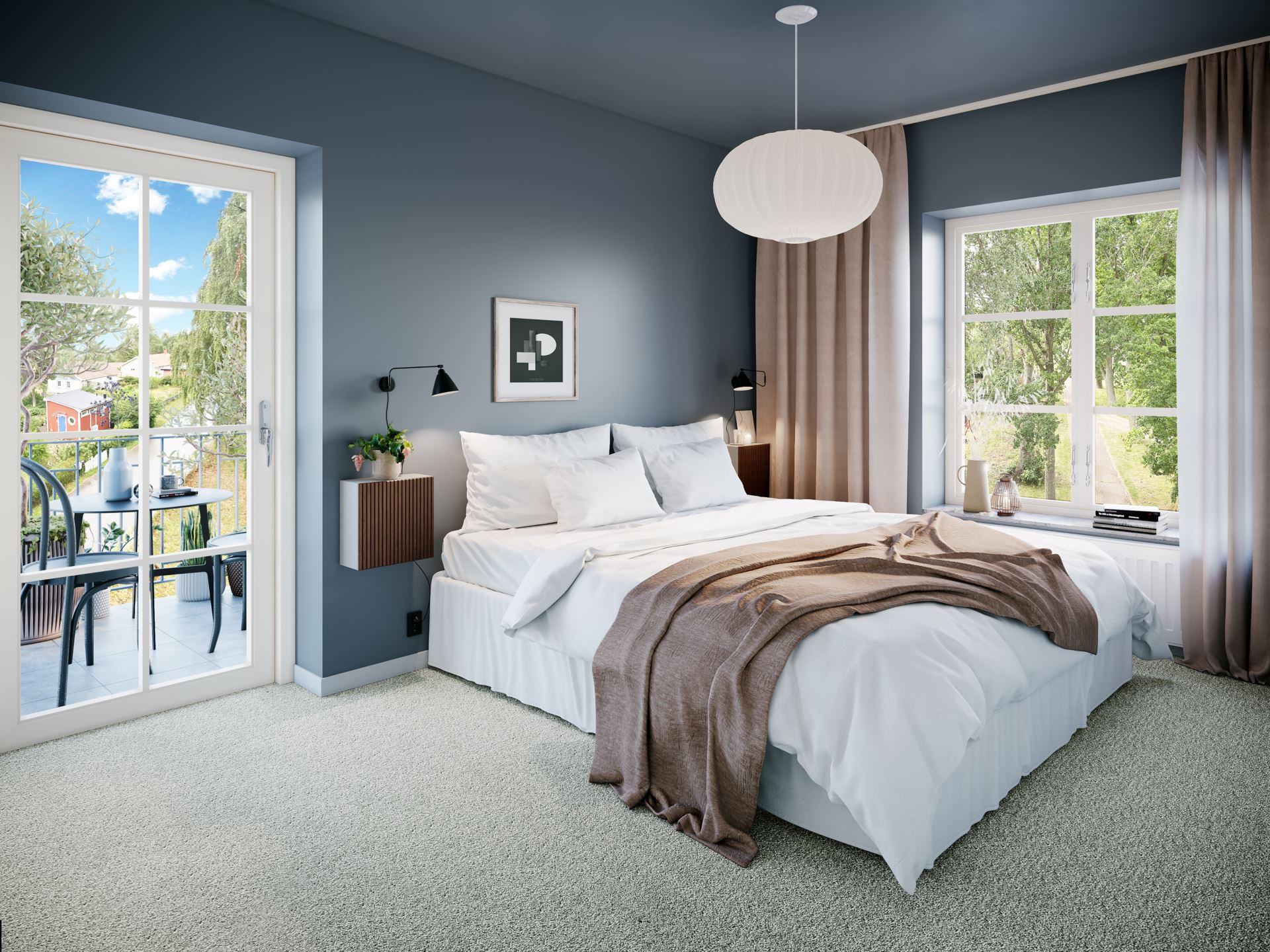 Master bedroom kommer att inredas med en härlig heltäckningsmatta i grå/beige ton. Väggar och tak kommer att målas i en mörkare färg i blå/grå ton för att höja mysfaktorn i rummet.