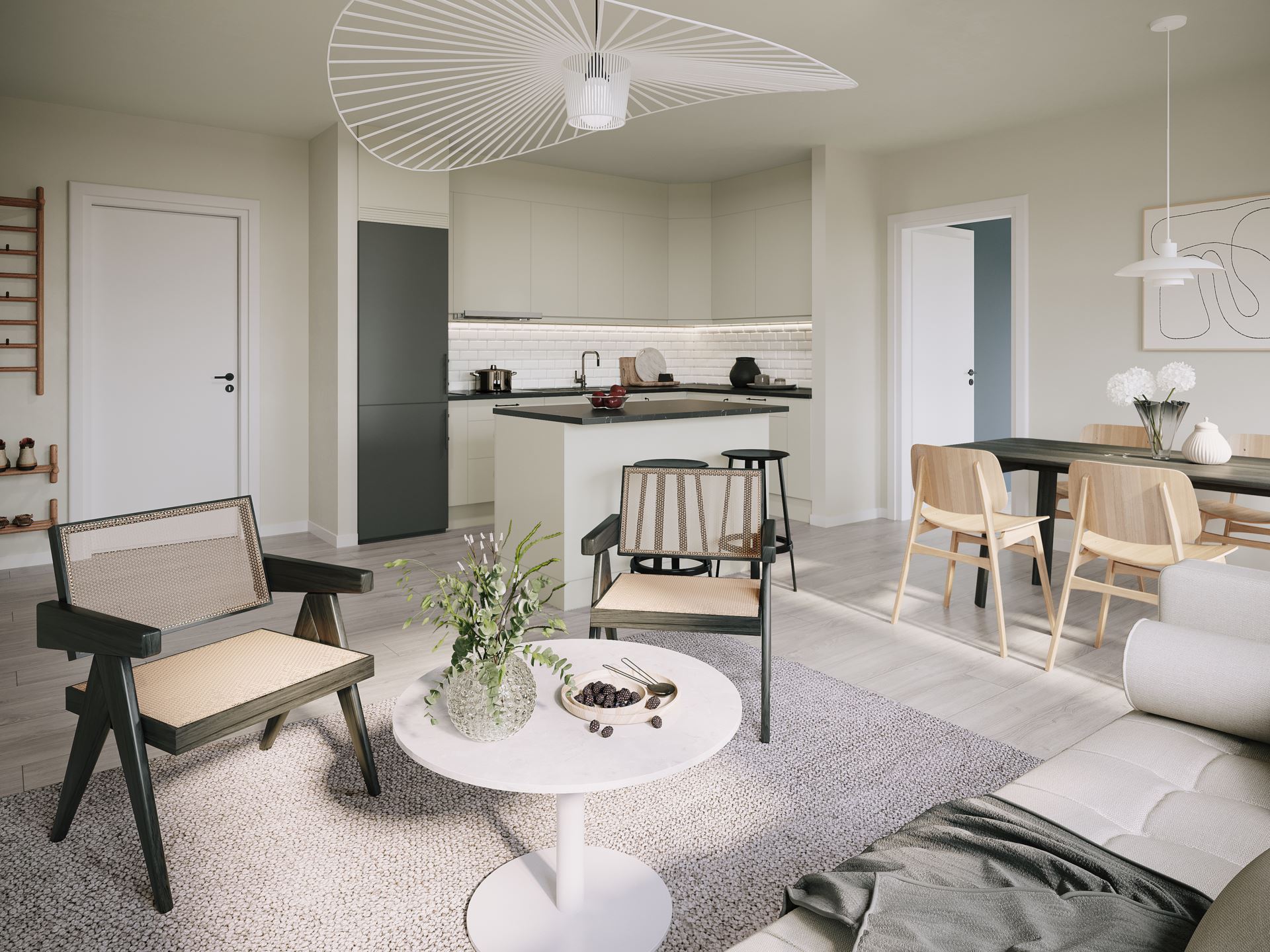 Kök och vardagsrum planeras modernt i öppen planlösning. Ett rum att umgås i! Här kommer det att bjudas på ett stilrent kök i en beige färg, detta matchas med samma färg på väggar och tak. Beslagen går i svart tillsammans med den svarta maskinparken, diskhon och vask. Ovan den mörka bänkskivan ser vi vitt kakel och under köksskåpen finns spotlights med dimmer. Under våra fötter vilar ett ljust parkettgolv i ek.