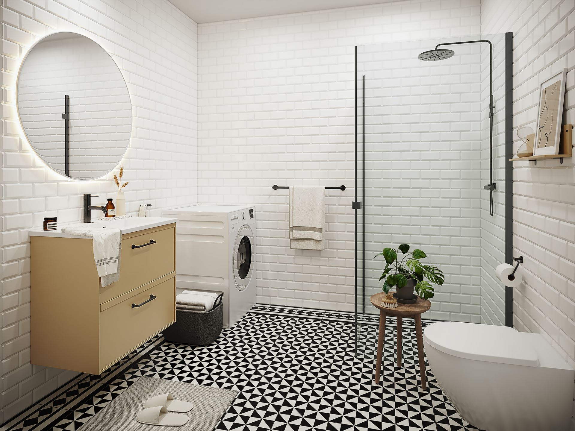 Ett badrum där inget finns att sakna. Stilrent svart/vitt golv matchas med blankt vitt kakel på väggarna som man även ser i köket. På väggen hängen en rund spegel med inbyggd belysning och under denna finns en rymlig kommod i samma färg som köksluckorna. Såklart bjuds på en kombinerat tvättmaskin/torktumlare. För att skapa en enhetlig stillinje i lägenheten ser vi även här svarta detaljer som t.ex. blandare, dusch, handtag/krokar , handdukshållare och duschvägg med svart industriglas. Här finns även golvvärme och spotlights i taket med dimmer. Vägghängd WC.