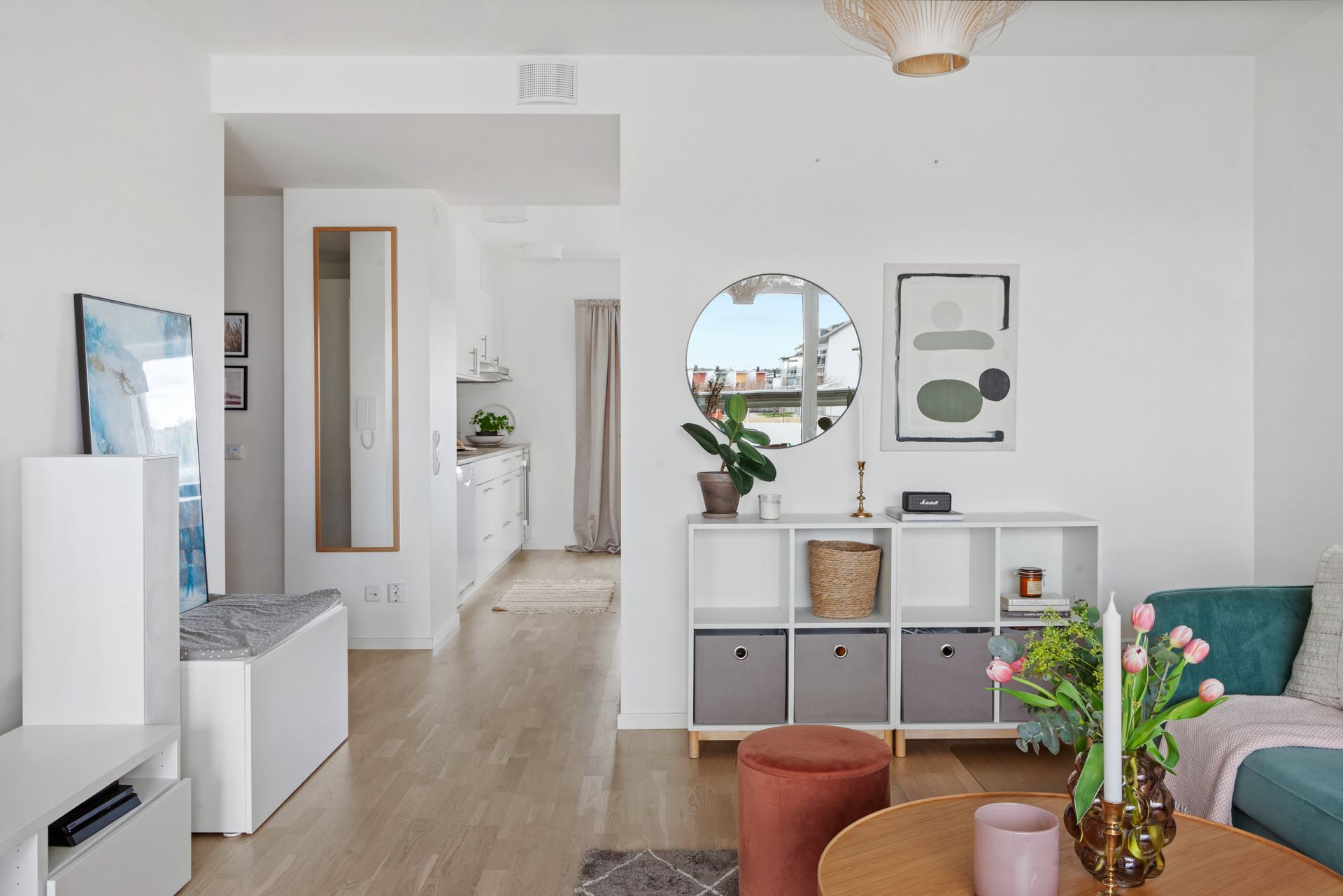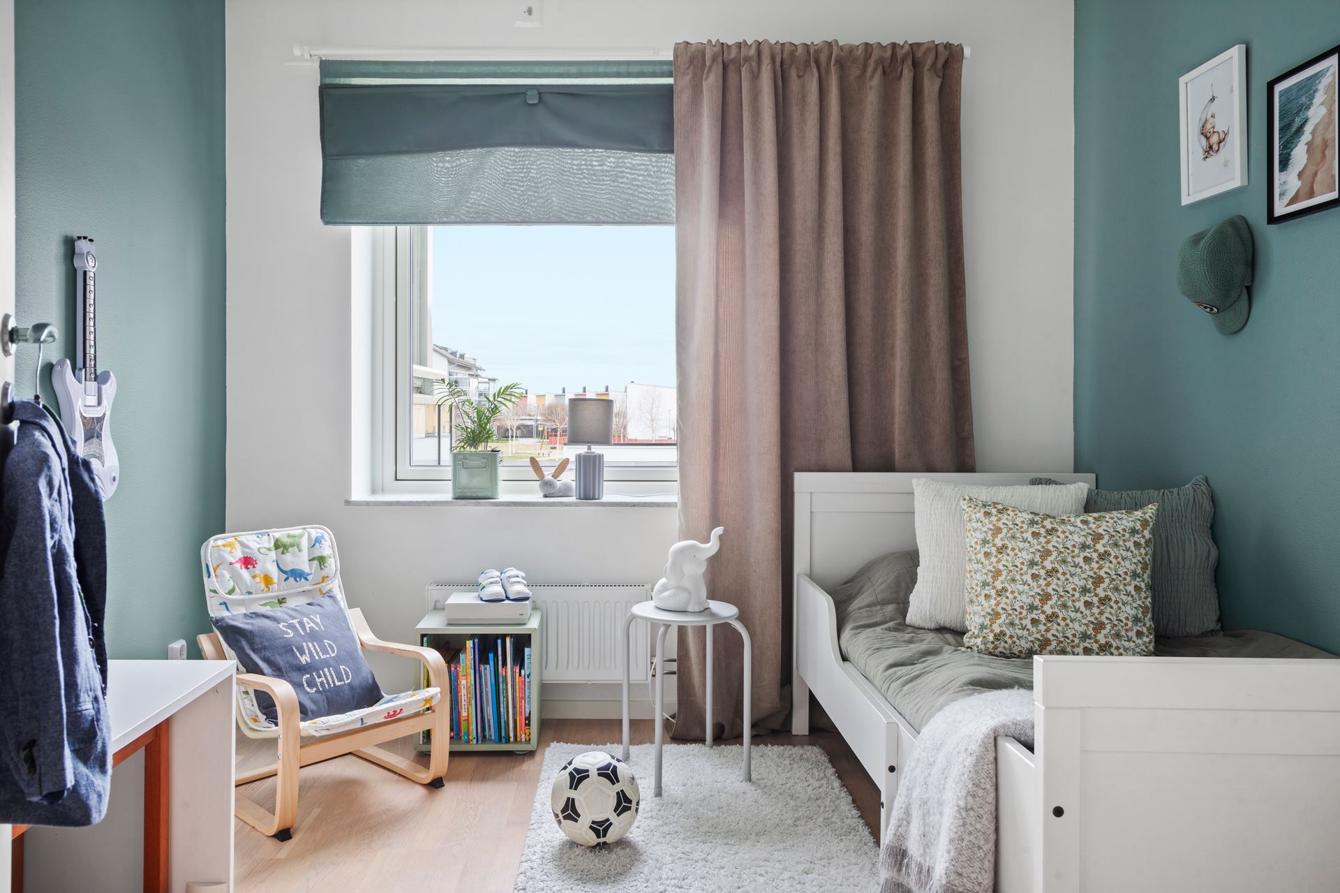 Väggar: Vita målade väggar. Målad fondvägg