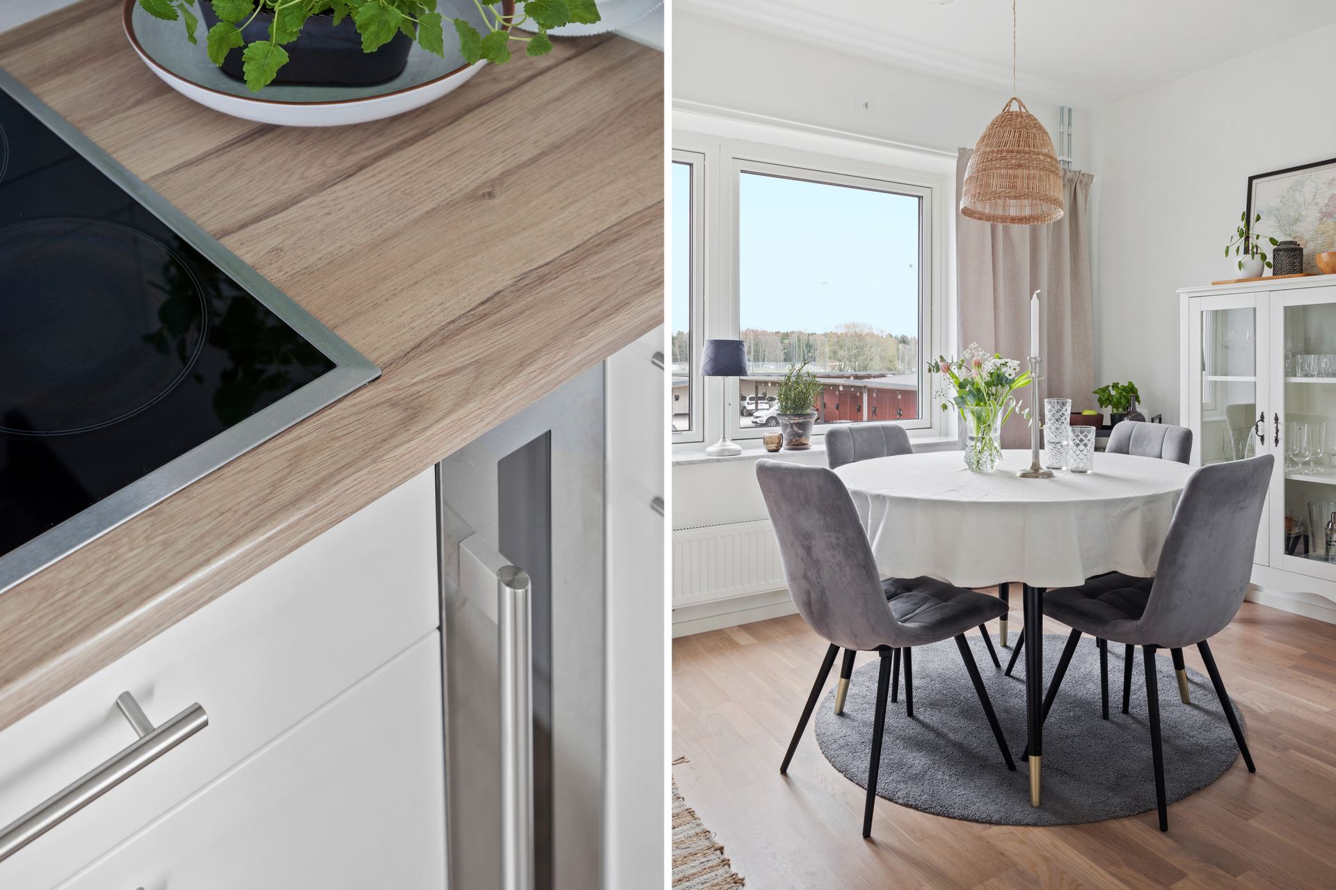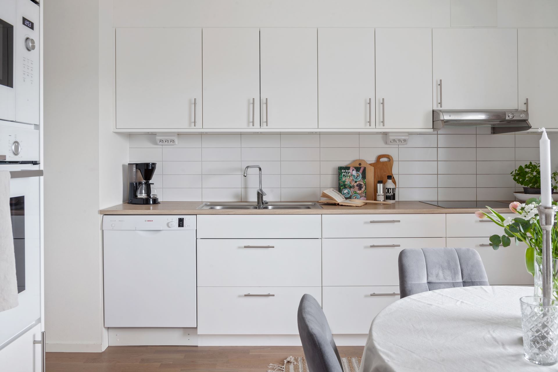 Inredning: Vitt kök från Kungsäterkök med överskåp samt lådor undertill. Vita helskåp kyl och frys samt vit micro och ugn. Vit diskmaskin samt rostfri vinkyl för ett fyra-fem flaskor. Rostfri fläkt. Ljus laminatbänkskiva