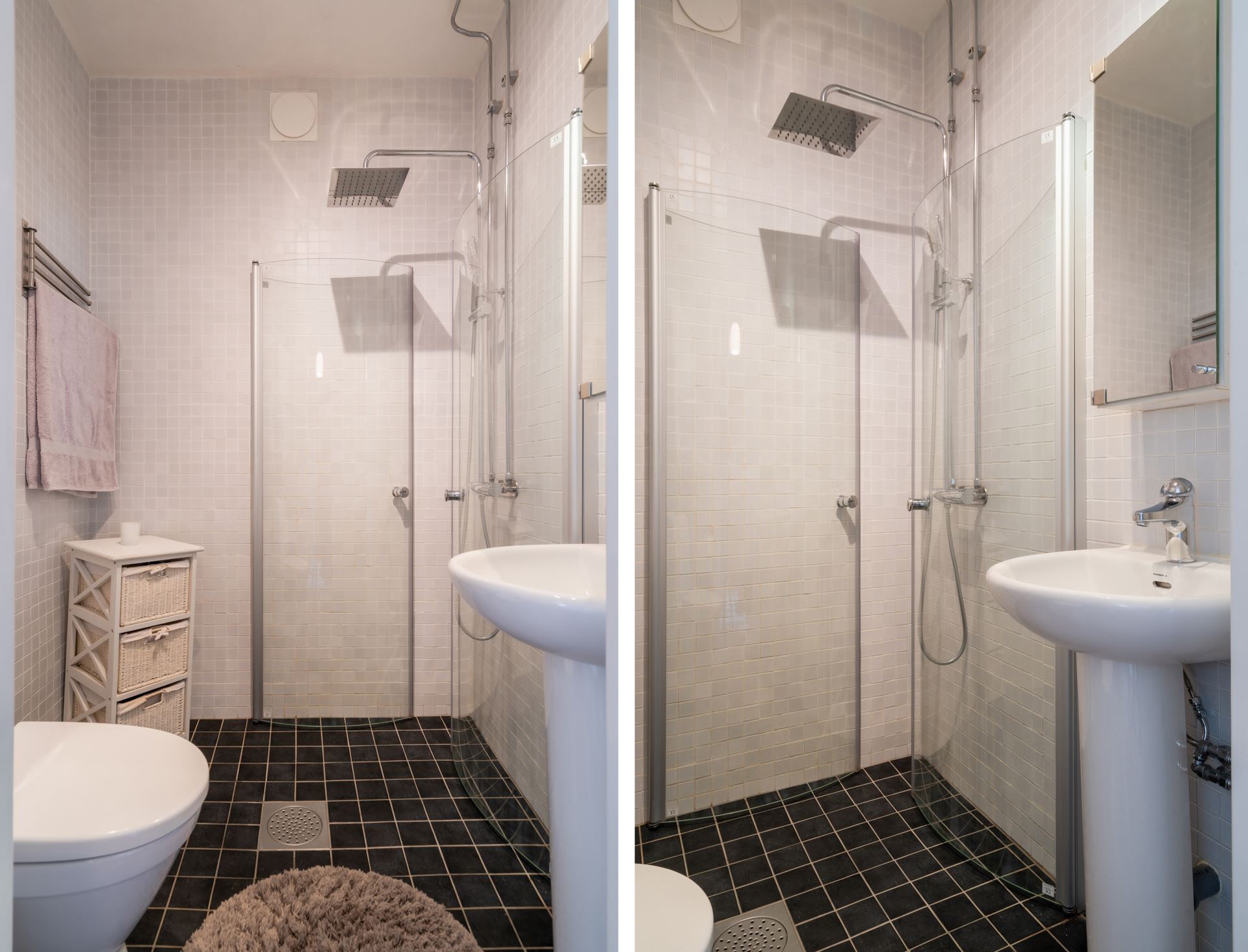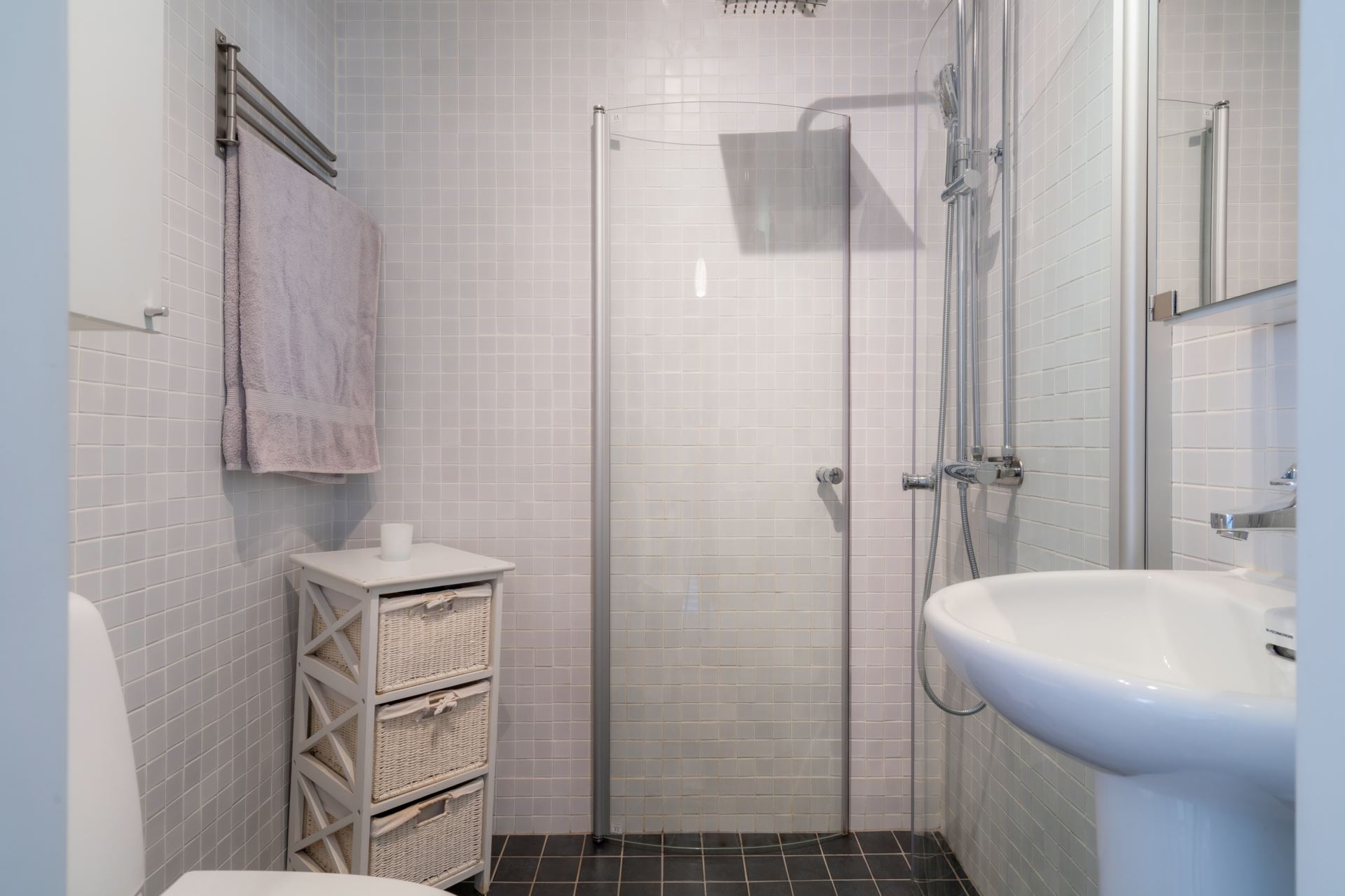 Övrigt: Dusch med glasväggar, handfat med spegelskåp, WC, väggfast vitt skåp