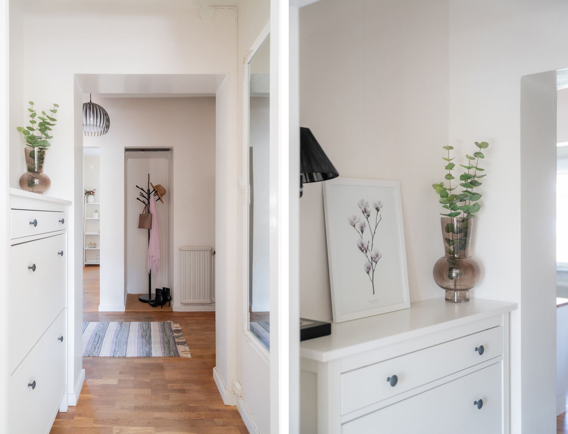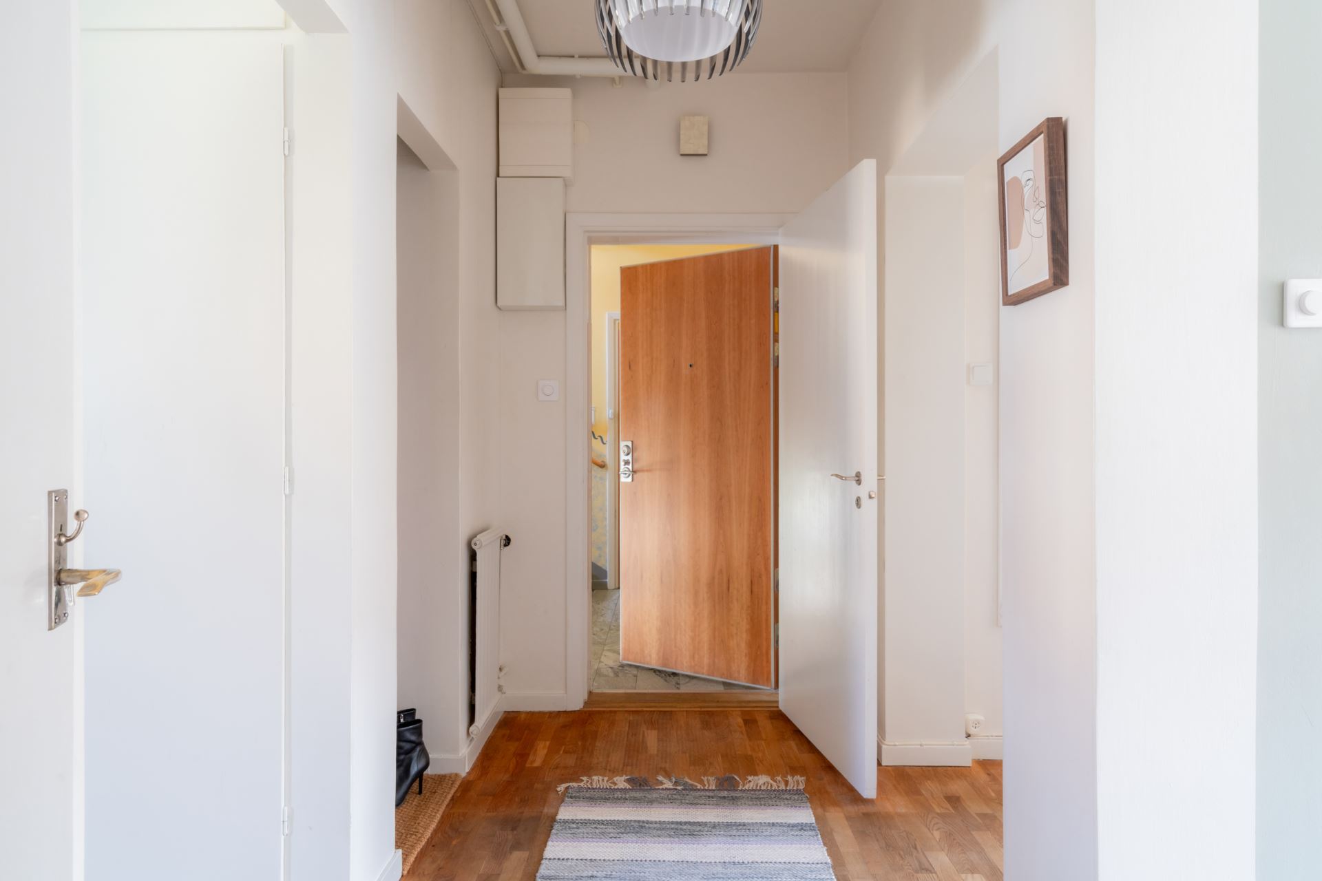 Övrigt: Plats för avhängning, hallen går i vinkel där en del leder till sovrum och den andra till resten av bostaden