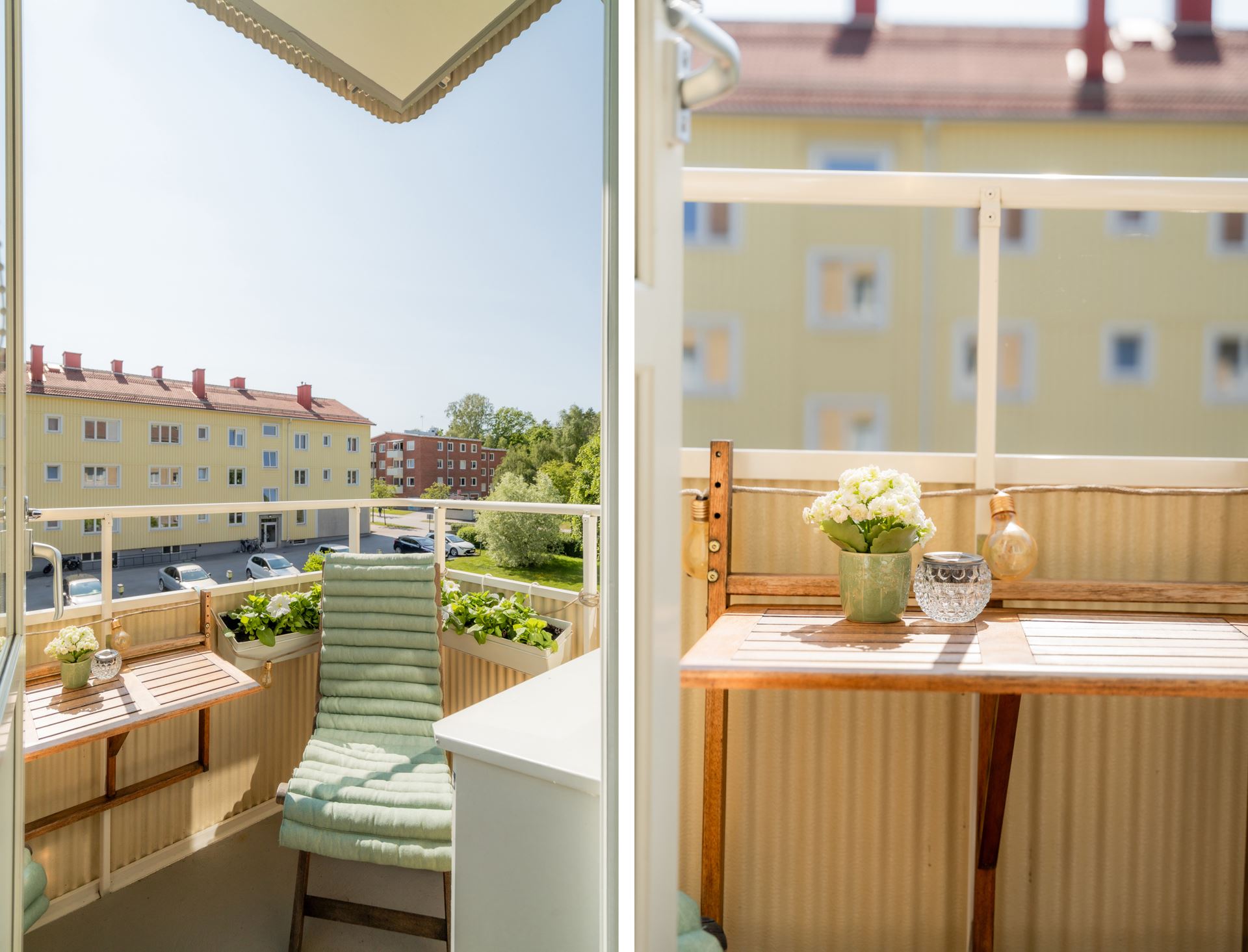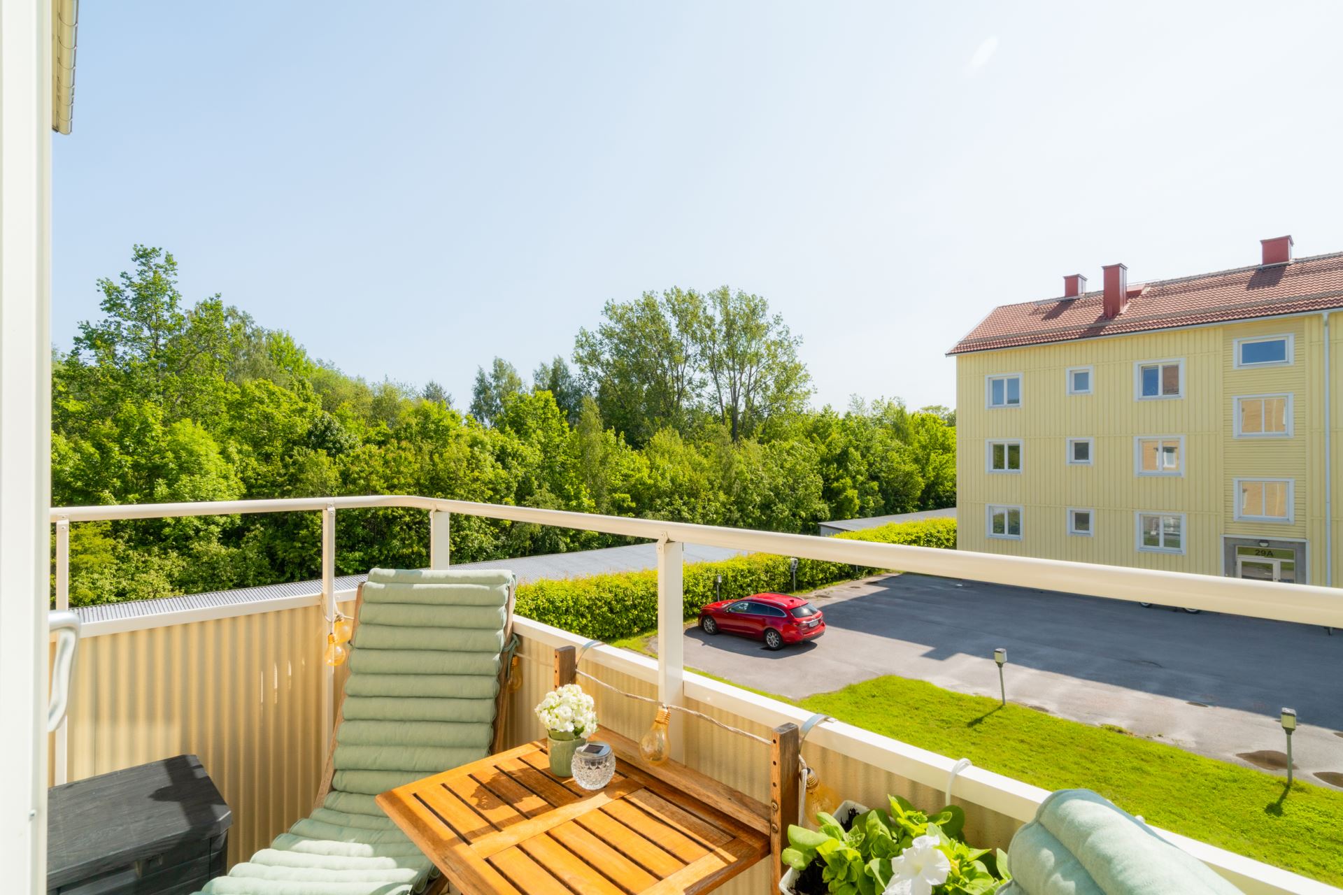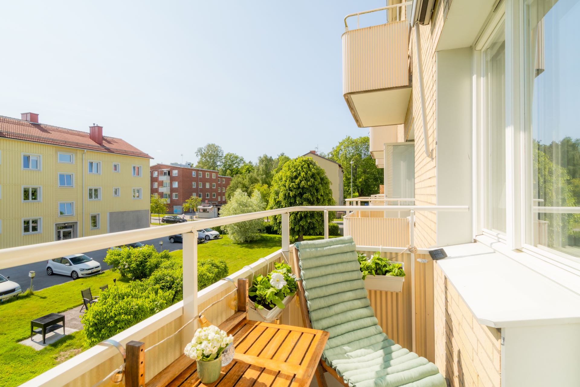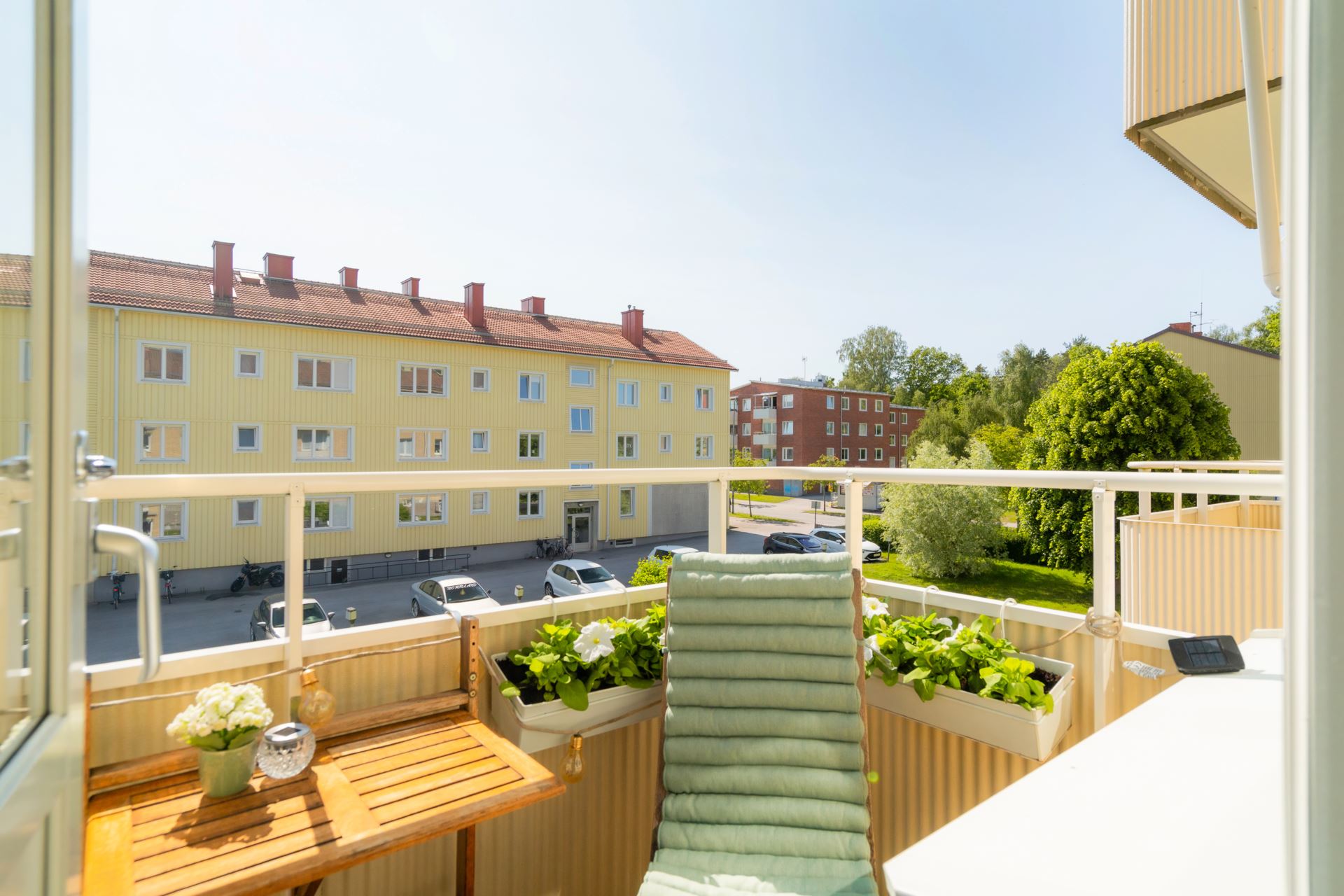 Till lägenheten hör en anvisad parkeringsplats, och det finns dessutom två gästparkeringar för besökande. Balkongen i söderläge vetter mot en grönskande innergård med fruktträd, blomsterplanteringar, uteplats och gräsmatta – en idyllisk plats att njuta av sommarens soliga dagar.