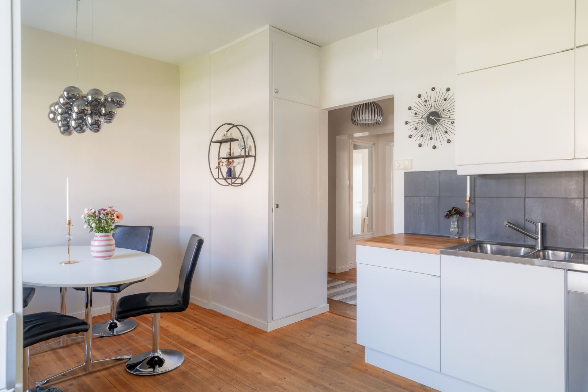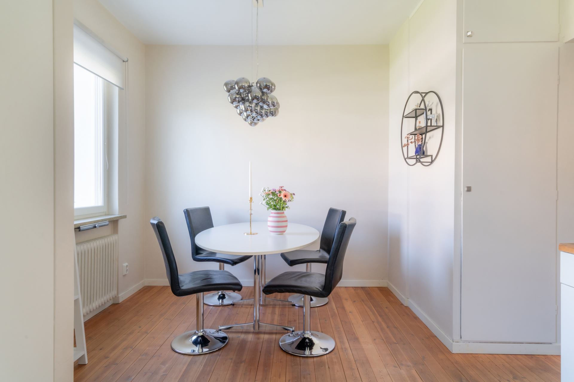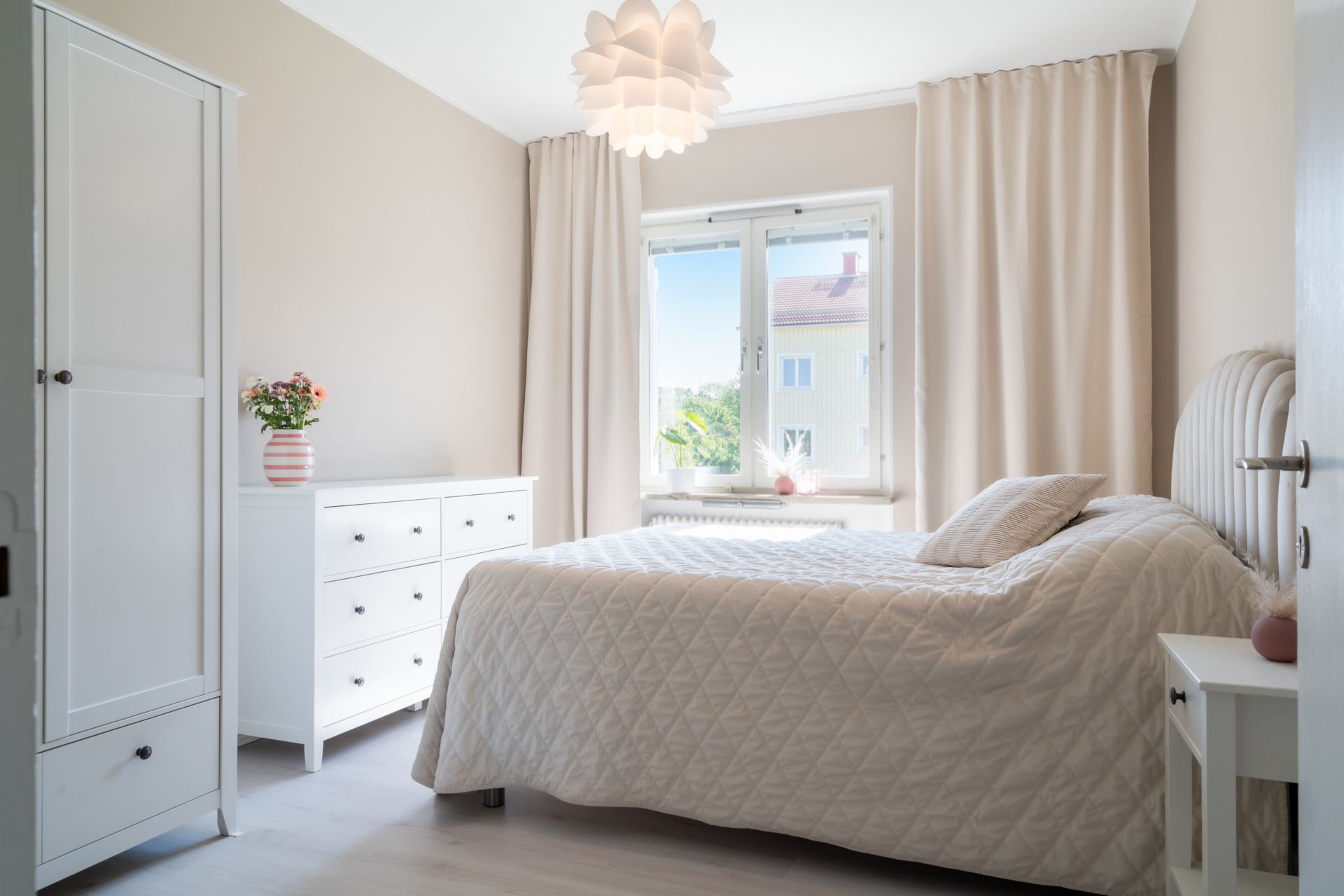 Det luftiga vardagsrummet bjuder på elegant ekparkett, medan sovrummet döljer en fin detalj i form av originalträgolv bevarade under det nuvarande laminatgolvet – en möjlighet för dig som vill återställa den äldre charmen. Här finns även gott om förvaring i form av garderober och en klädkammare i full takhöjd.