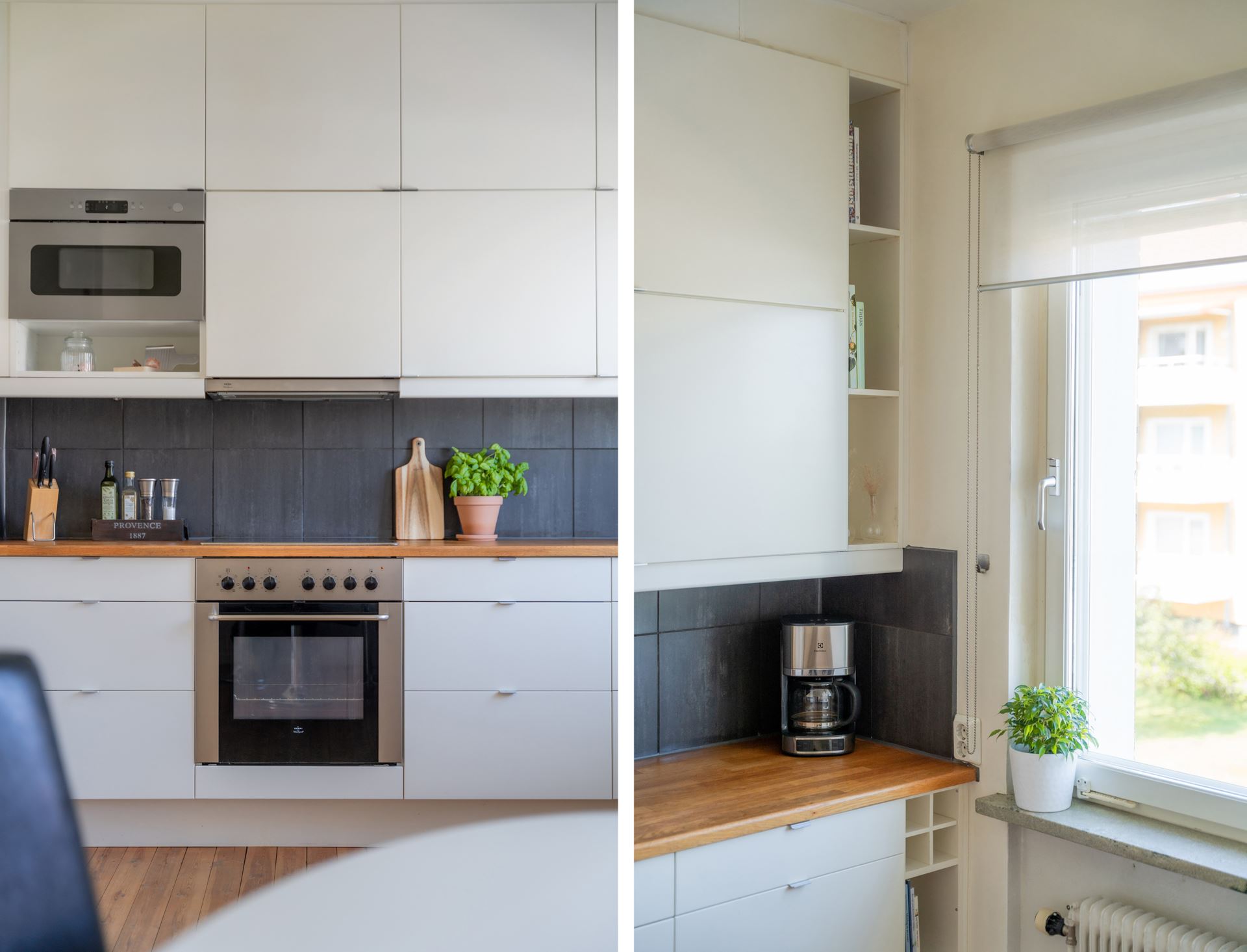 Övrigt: Ljusa snickerier med gott om förvaring, träbänkskiva med grå kakel ovan, skafferi, diskmaskin Bosch, fläkt IKEA, ugn IKEA, integrerad kyl/frys IKEA.