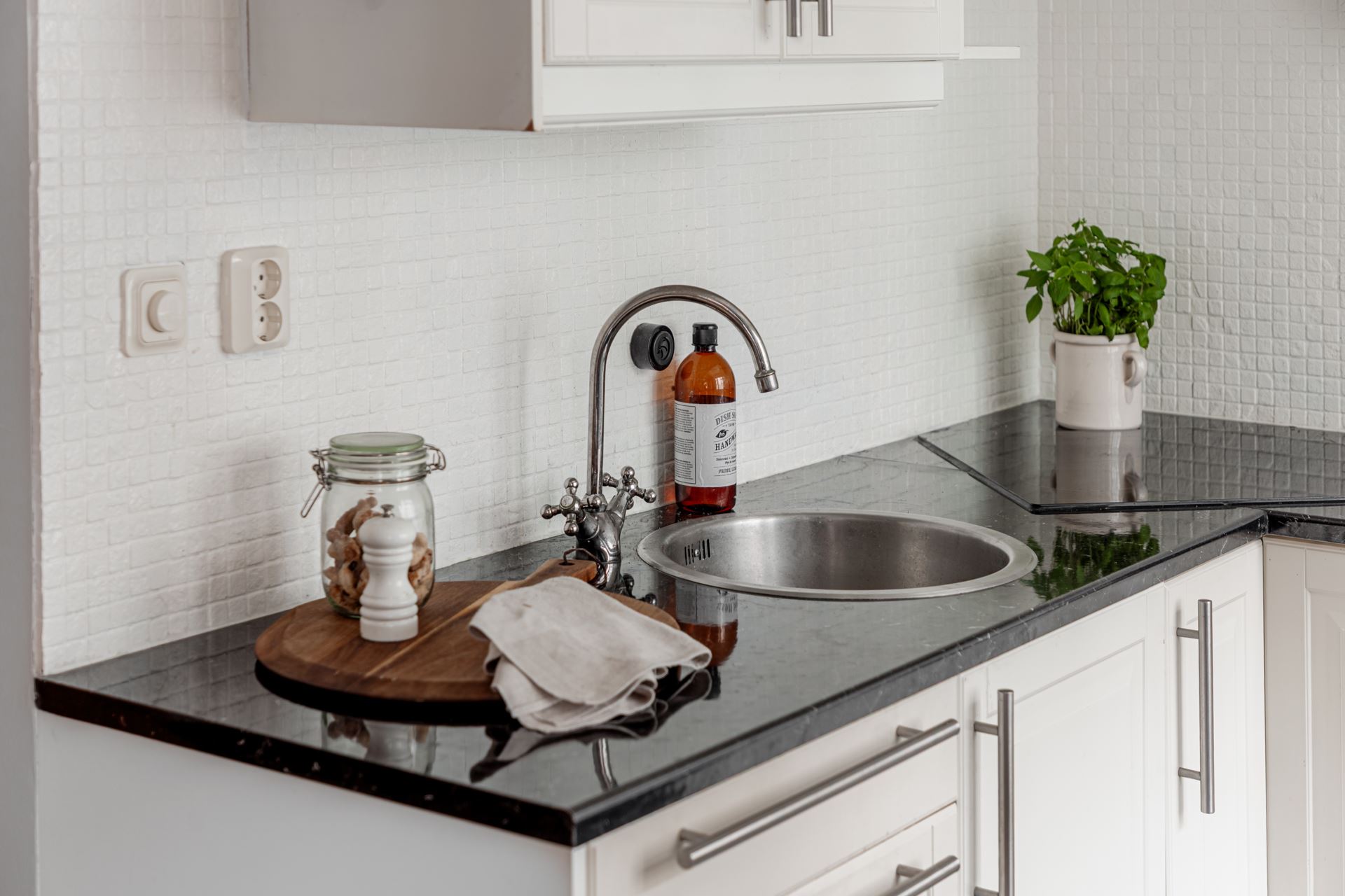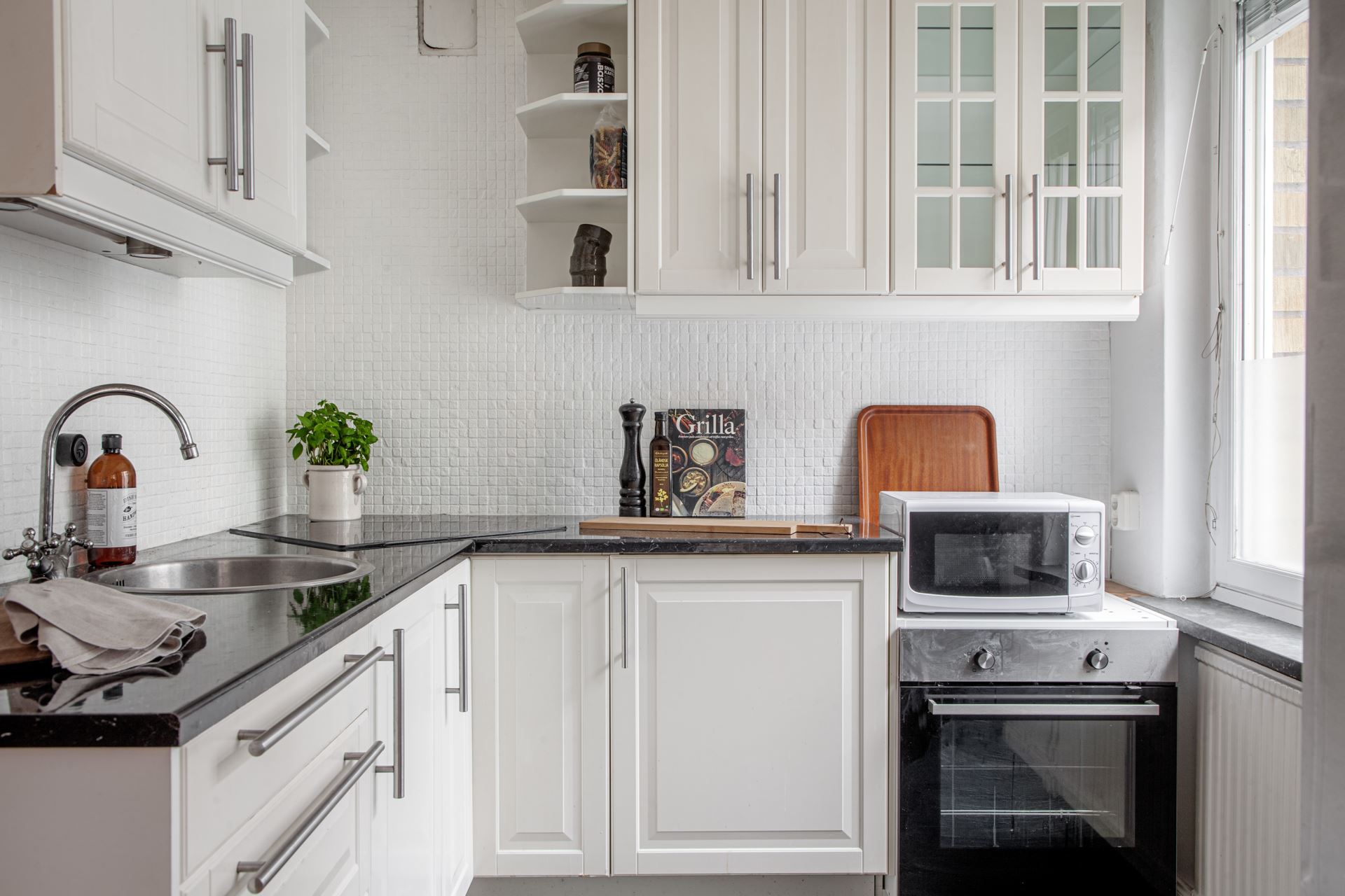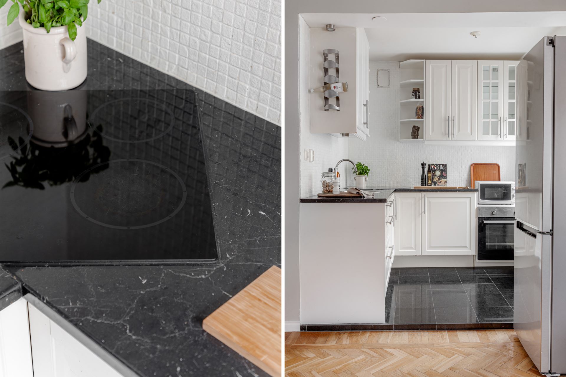 Övrigt: Vita snickerier med vitt kakel ovan en svart bänkskiva, spishäll, ugn