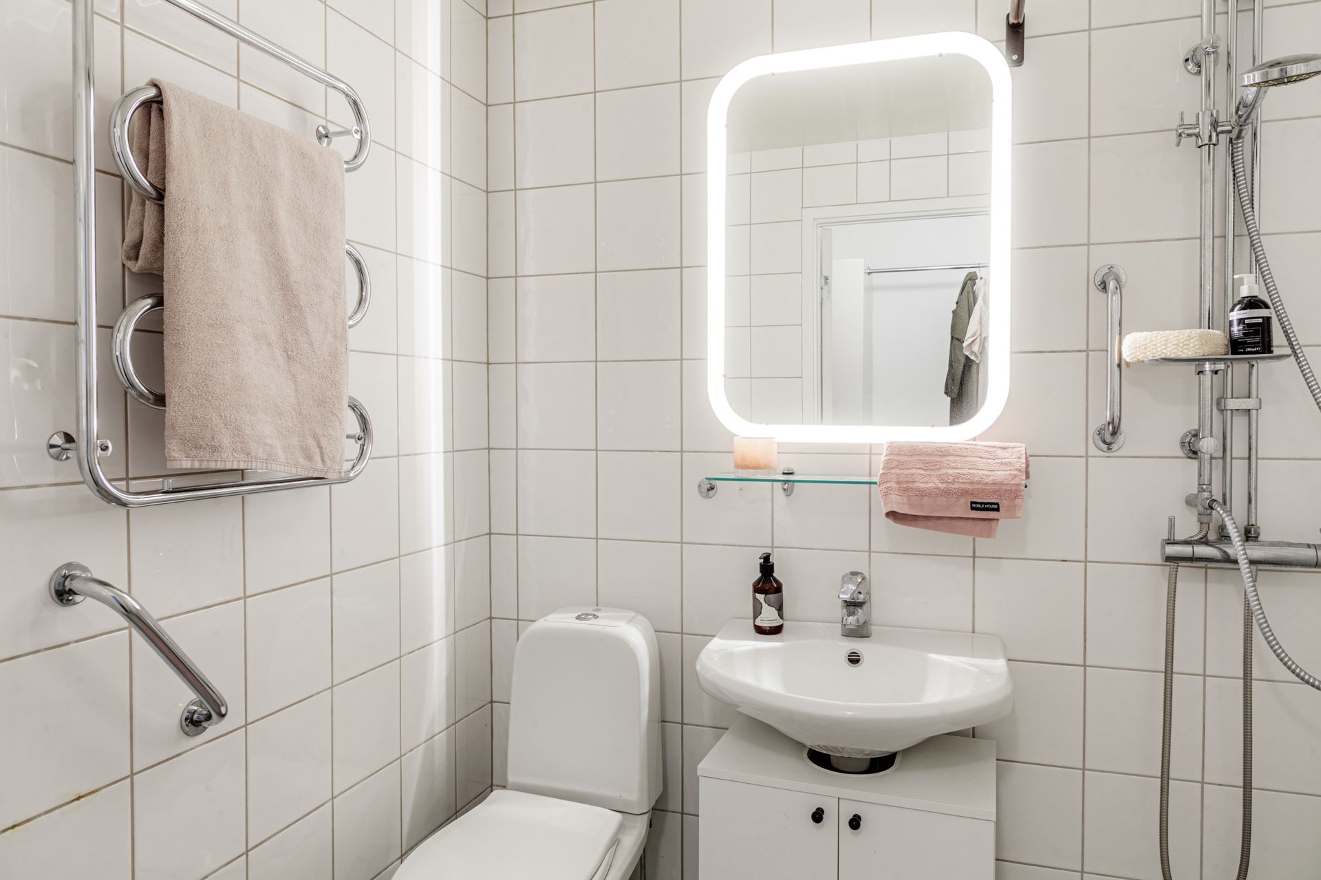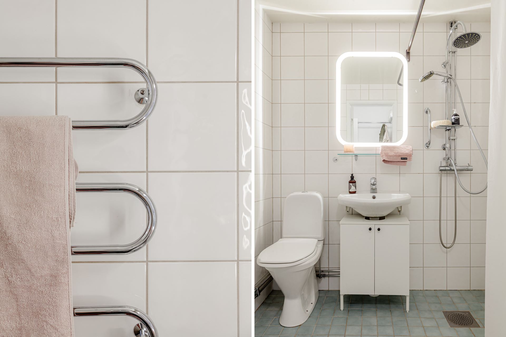 Övrigt: Dusch, vit kommod med handfat, WC, spegel med ljusrand, handdukstork