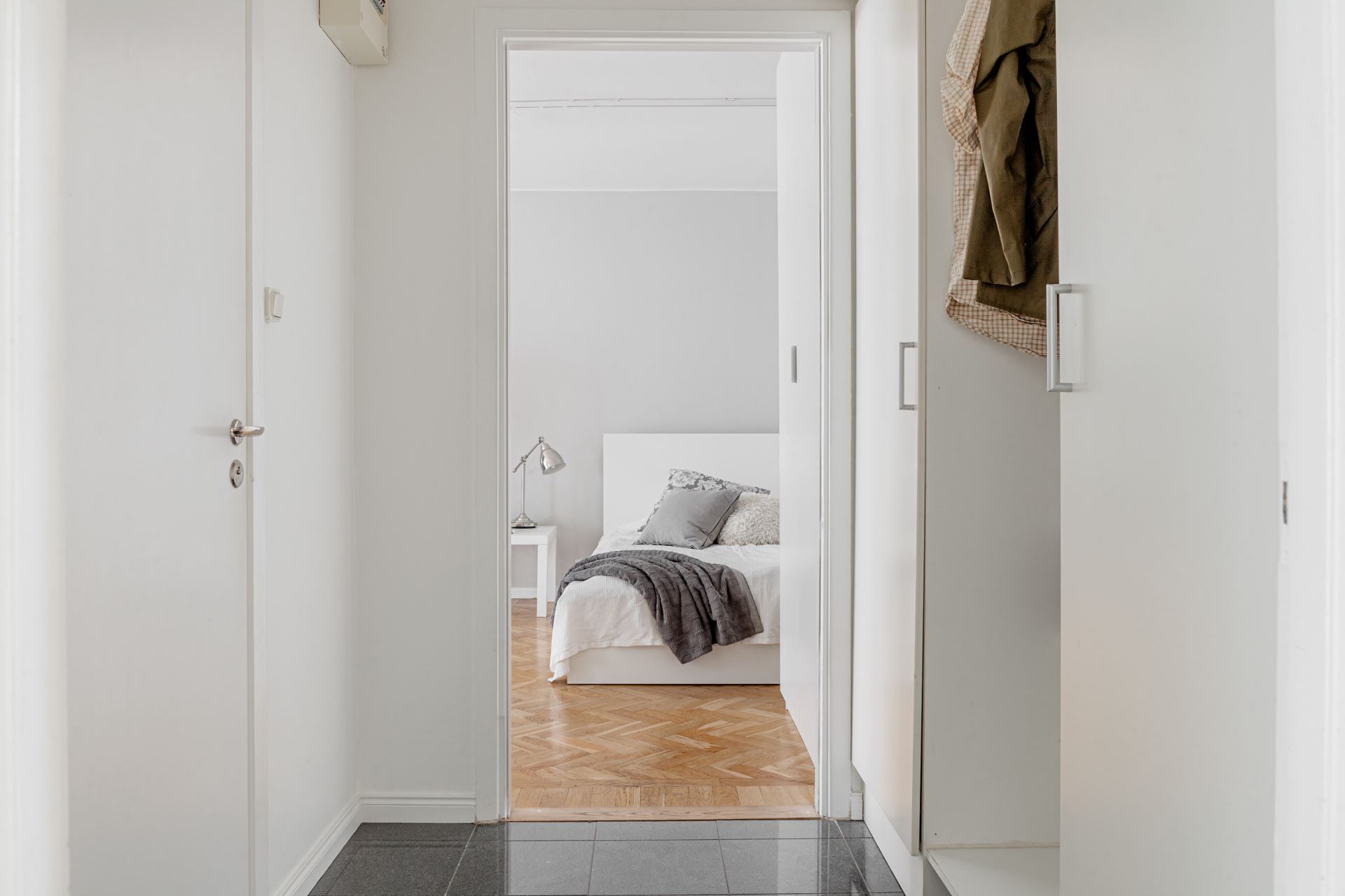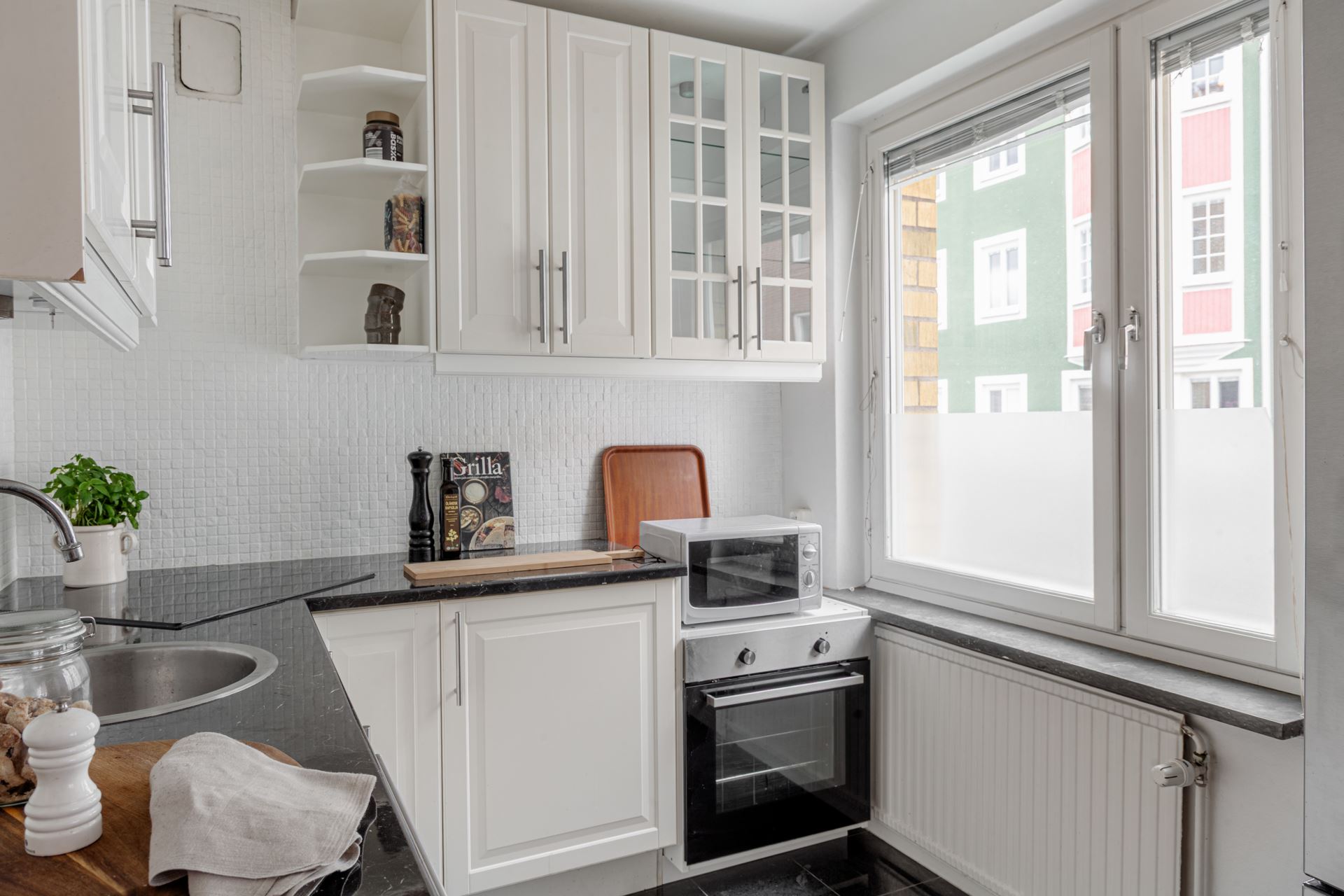 Bostaden är perfekt planerad med allt du behöver på få kvadratmeter – idealisk för dig som söker ditt första boende eller en mindre bostad med det optimala läget. I rummet finns en skena i taket där ett avgränsande draperi kan hängas upp så rummet delas av för tex säng.