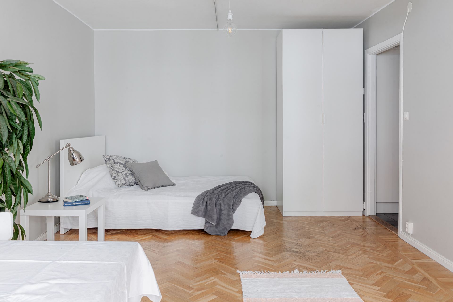Övrigt: 2 garderober, utgång till balkong, skena i taket där avgränsande draperi kan hängas