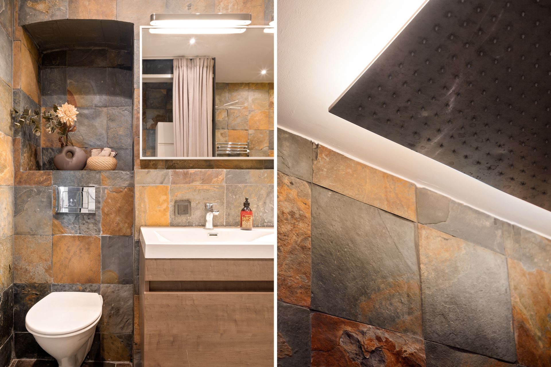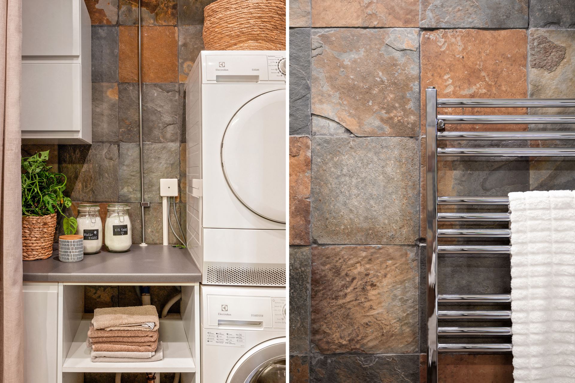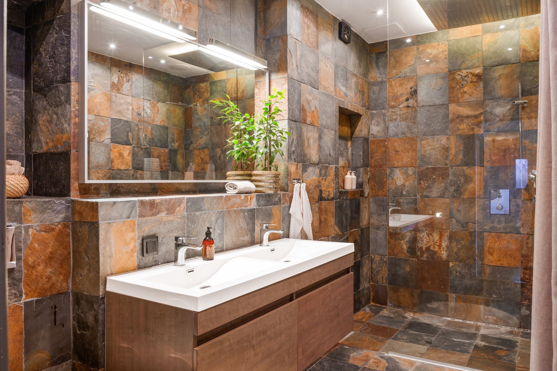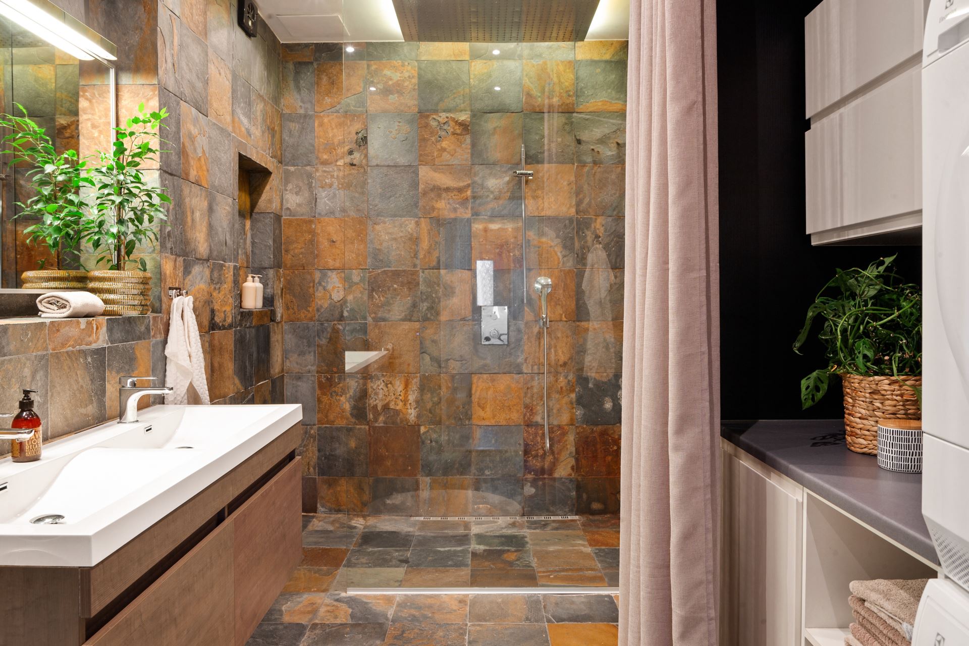 Inredning: Bred kommod med dubbelhandfat och inbyggd spegel med belysning samt hylla. Stor dusch med glasparti och takdusch samt inbyggd förvaringshylla. Tvättmaskin och torktumlare samt bänk med över- och underskåp.