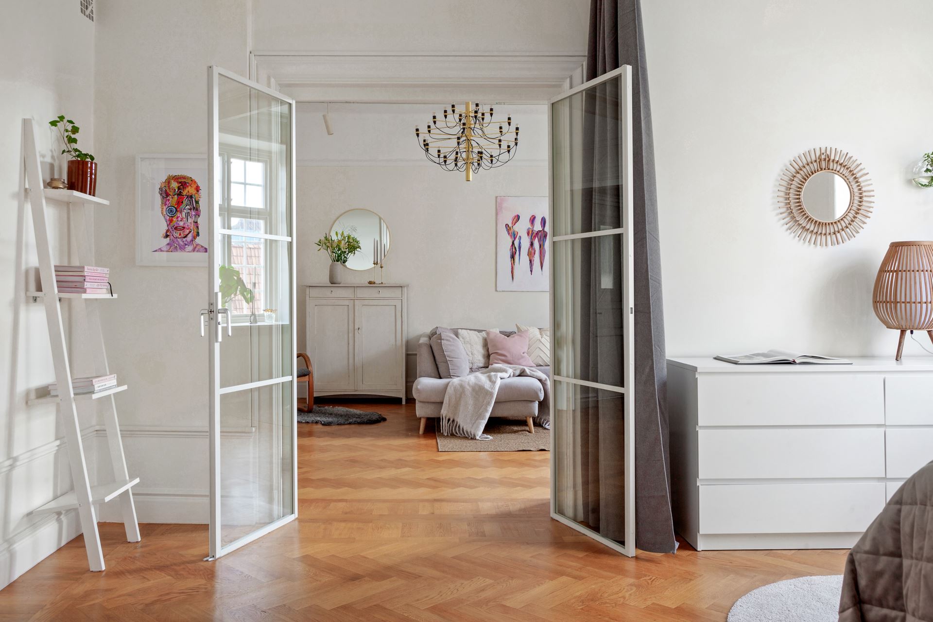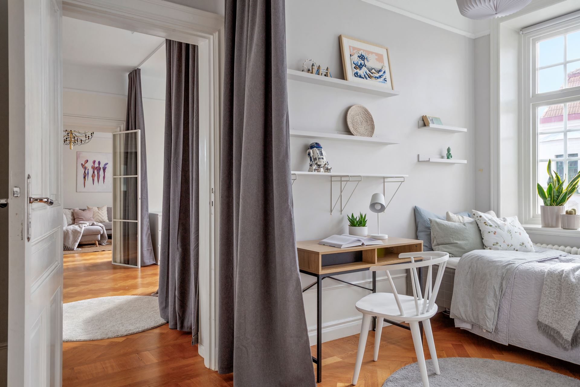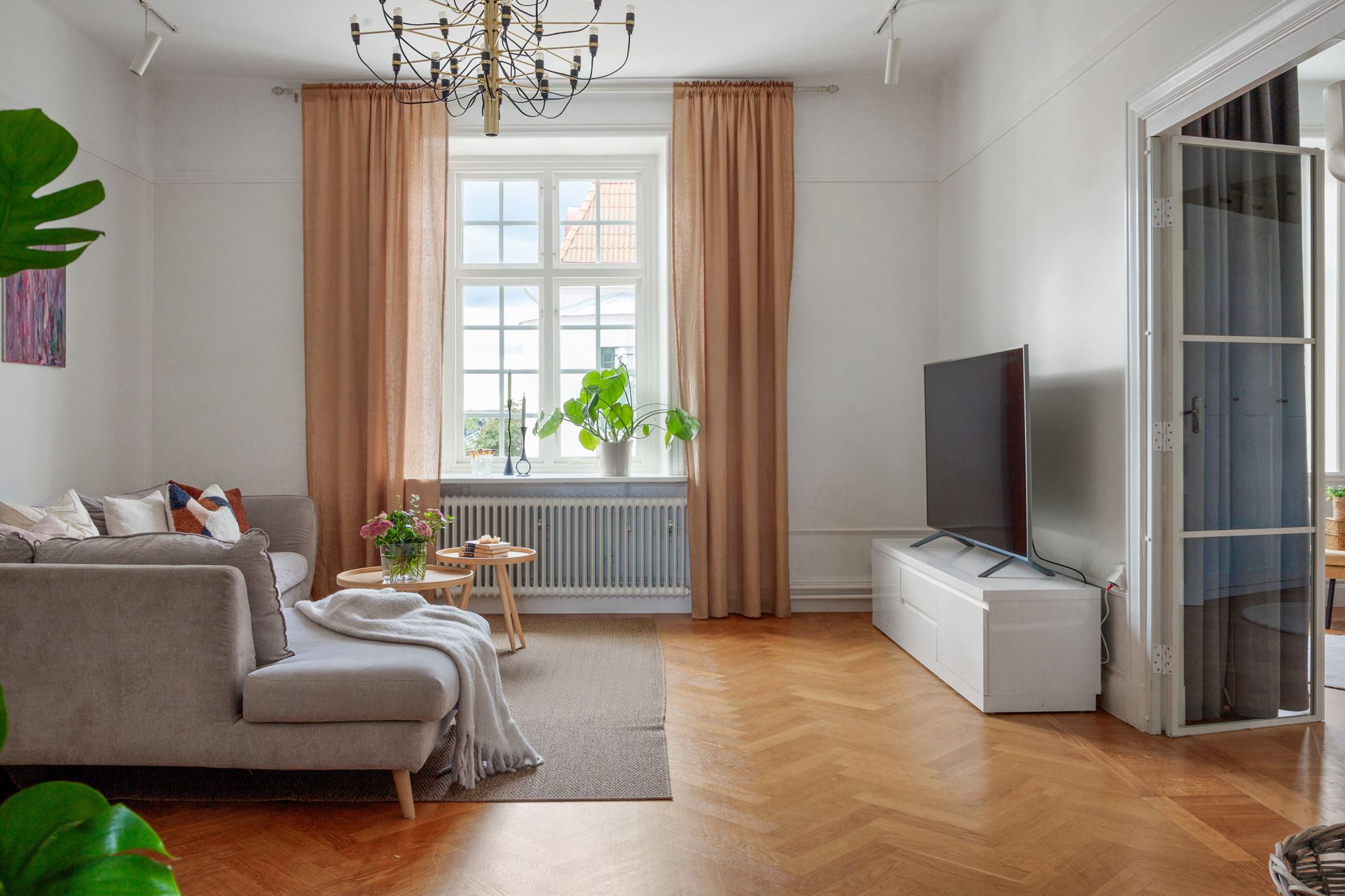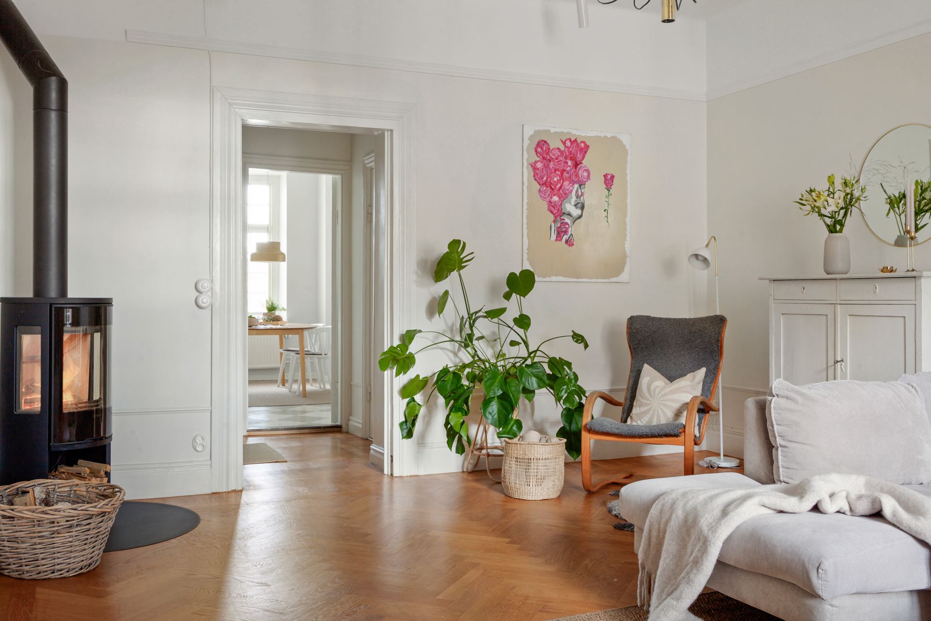 Bostaden är belägen två trappor upp i en vacker fastighet och erbjuder ett representativt hem med tre rum i fil – perfekt för både sociala tillställningar och avkopplande hemmakvällar. Den generösa hallen i vinkel välkomnar dig in med fiskbensparkett som löper vidare genom bostadens centrala delar. Takhöjden skapar en härligt luftig känsla och rymden förstärks ytterligare av de stora spröjsade fönsterpartierna.