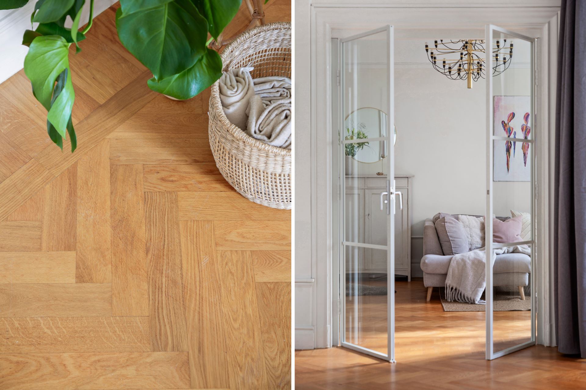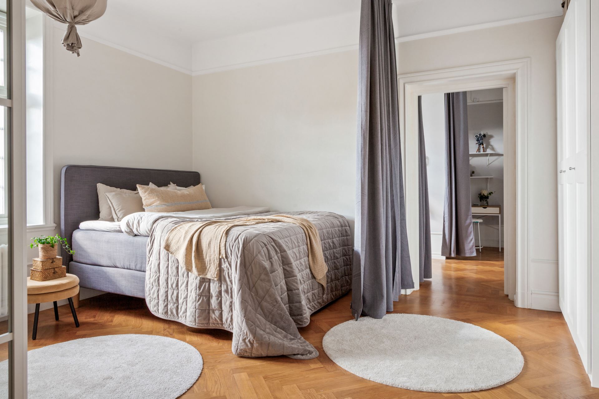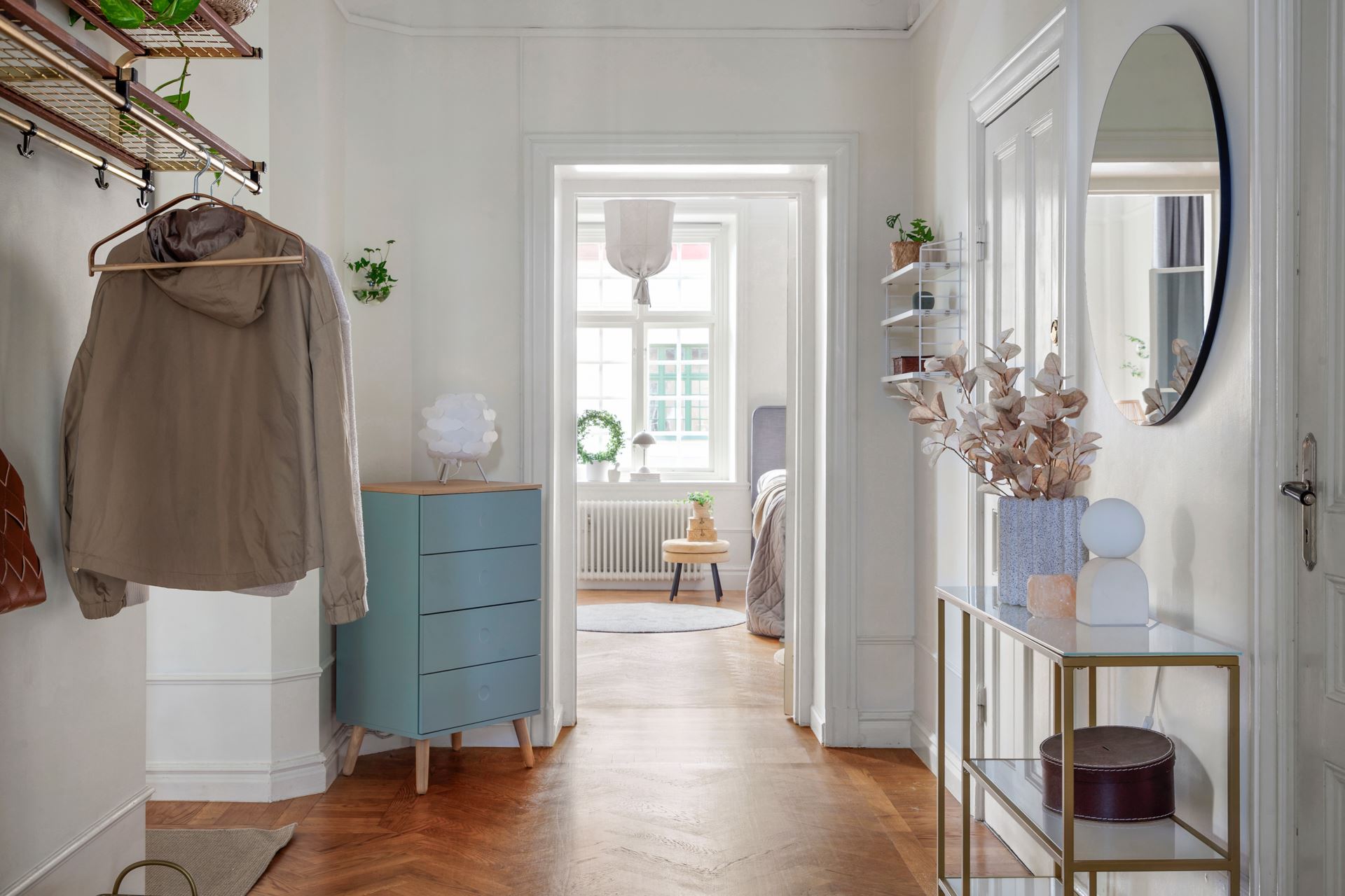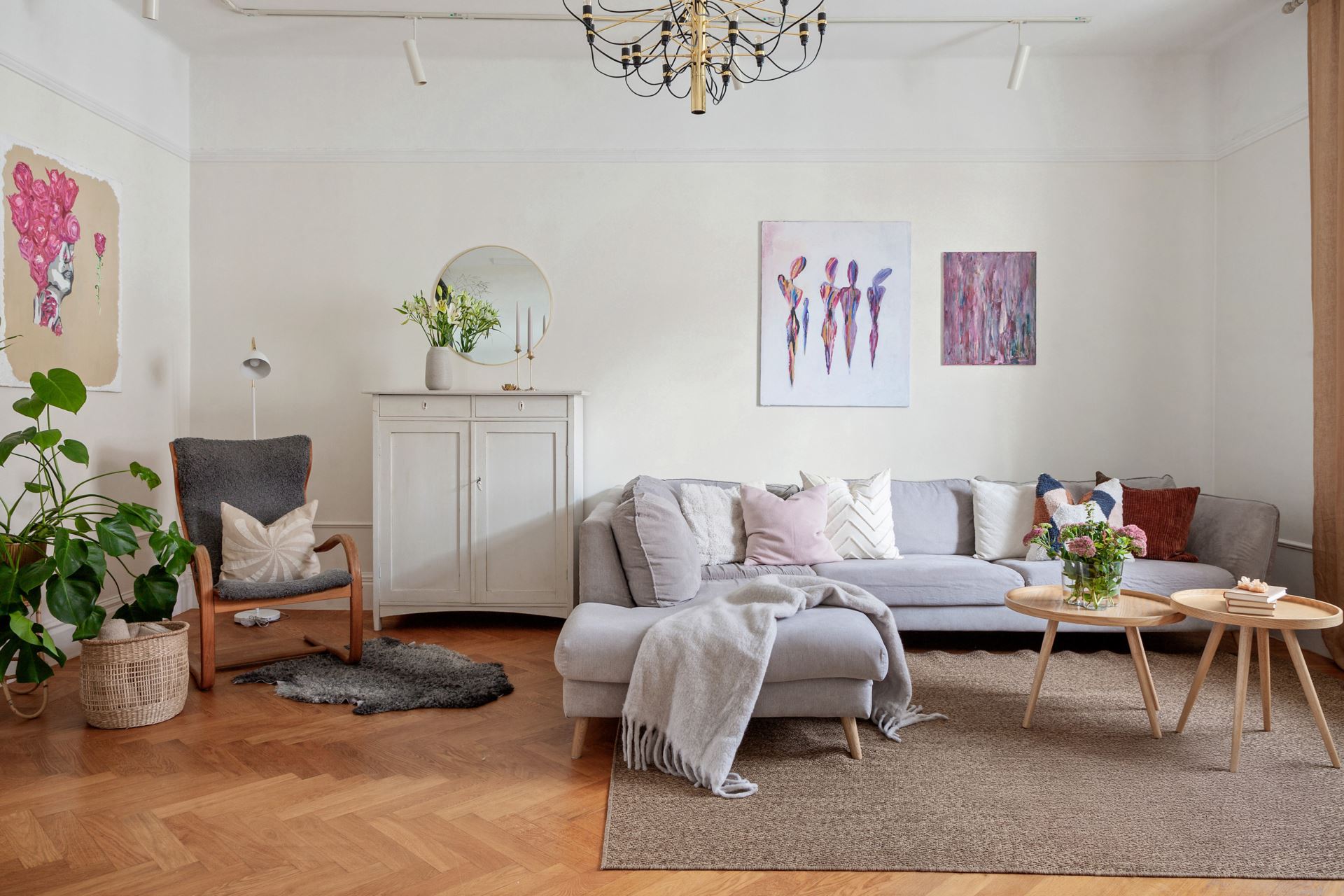 Bostaden är belägen två trappor upp i en vacker fastighet och erbjuder ett representativt hem med tre rum i fil – perfekt för både sociala tillställningar och avkopplande hemmakvällar. Den generösa hallen i vinkel välkomnar dig in med fiskbensparkett som löper vidare genom bostadens centrala delar. Takhöjden skapar en härligt luftig känsla och rymden förstärks ytterligare av de stora spröjsade fönsterpartierna.