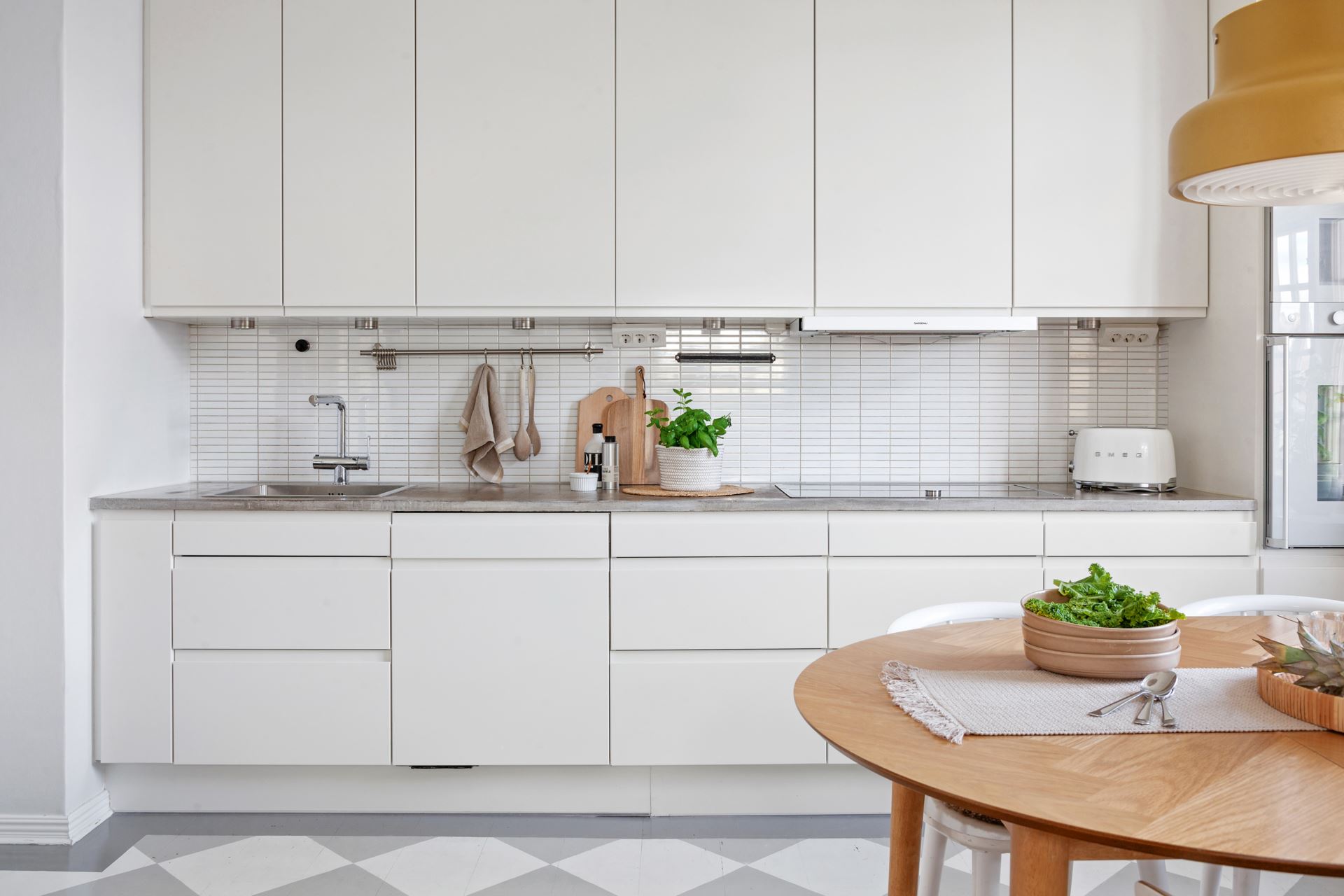 Inredning: Ljust kök med släta luckor från HTH. Vitvaror från Gaggenau samt ny extra bred kyl och frys från Bosch. Integrerad diskmaskin från Asko.