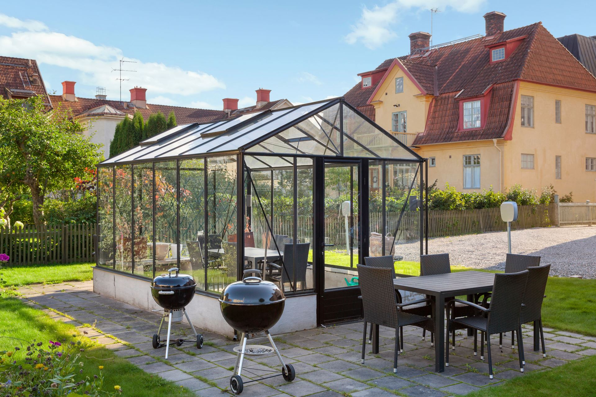 Grusad innergård med plats för parkering för bil. Del av innergården med gräsytor med orangeri med infravärmare samt belysning och grillplats som får nyttjas av bostadsrättshavarna.