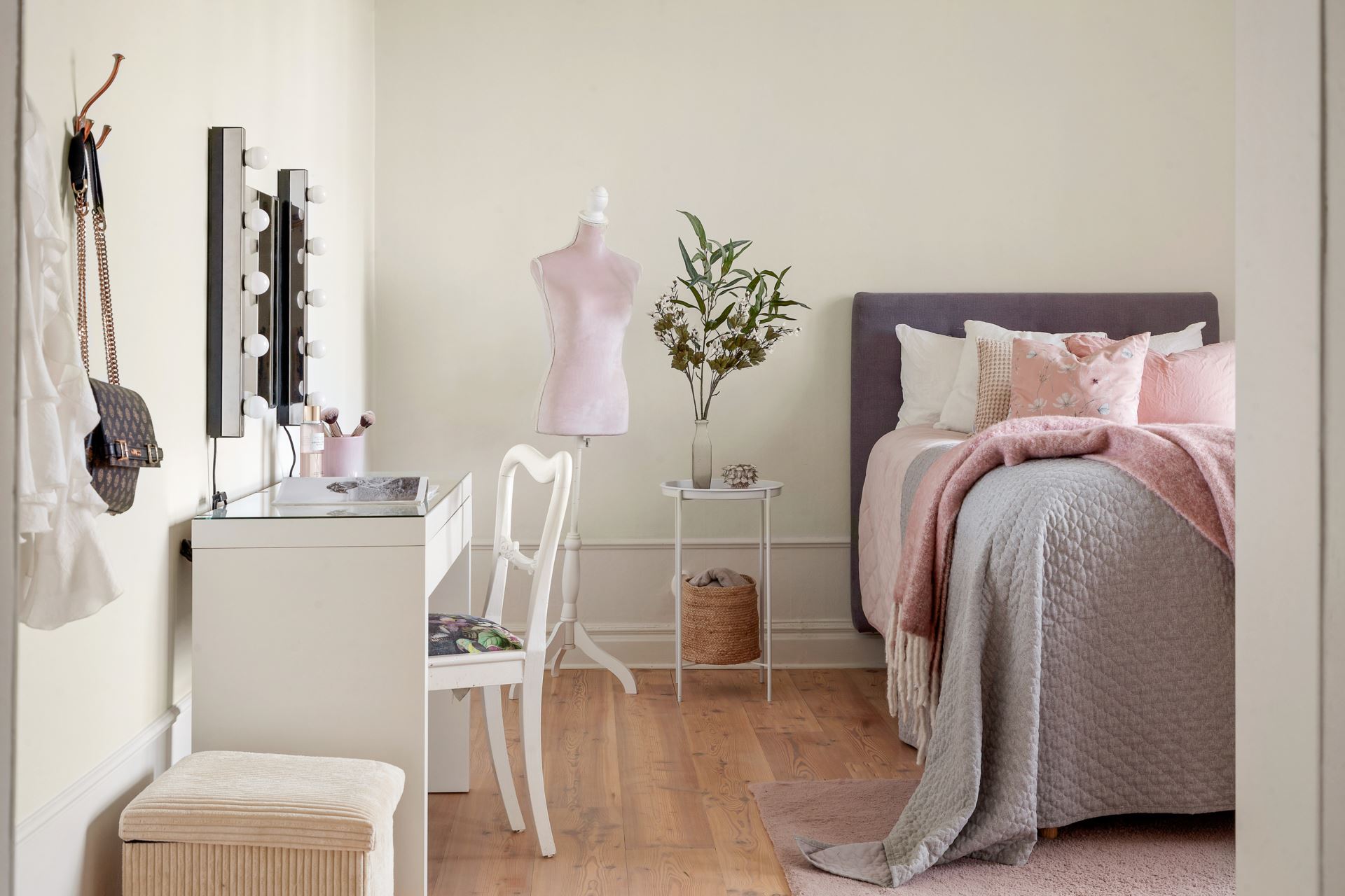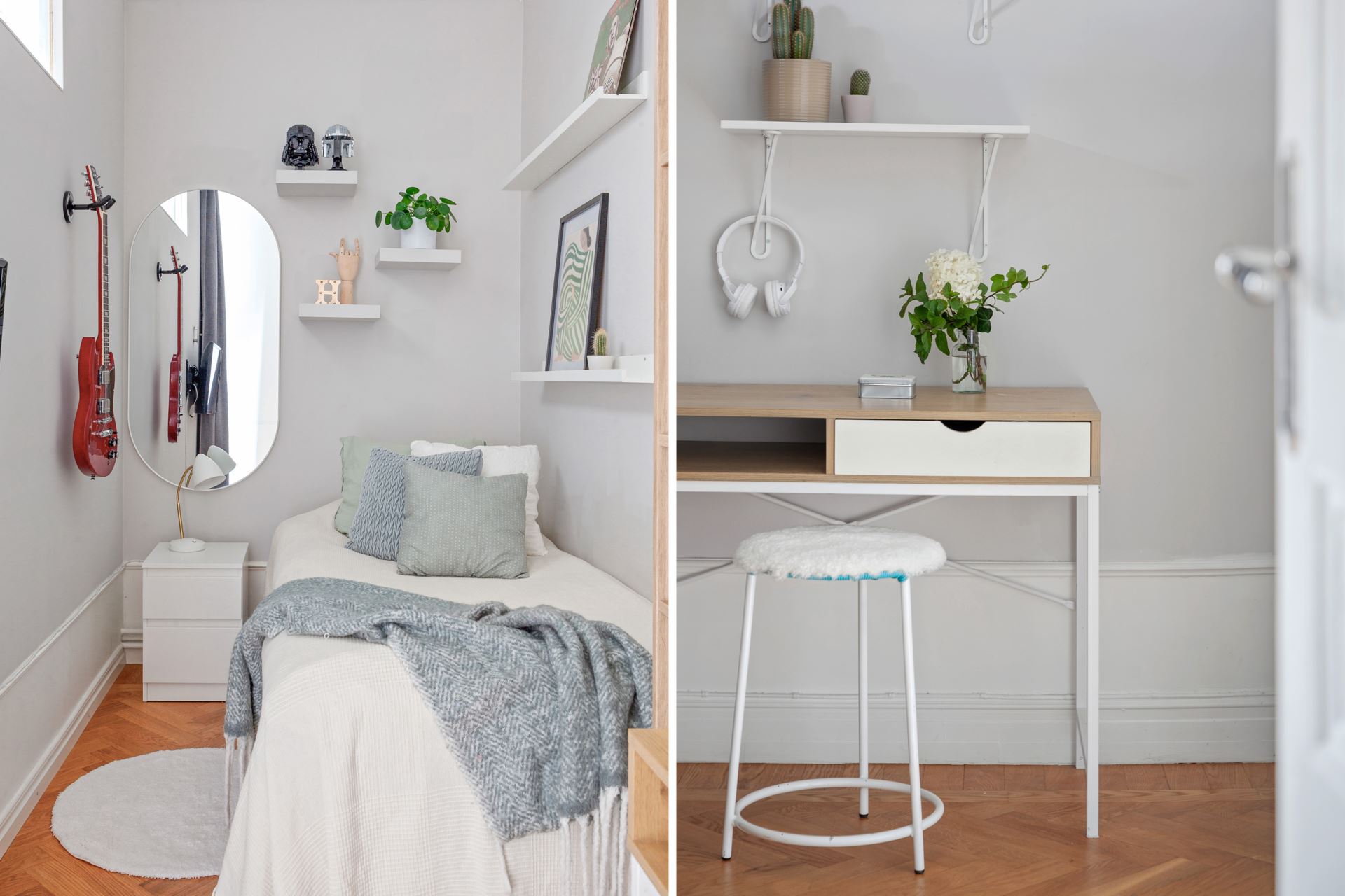 Inredning: Vägg uppsatt som avdelare i rummet men som är enkel att ta bort om man skulle vilja nyttja rummet på annat sätt. Skjutdörrsgarderober med inredning.