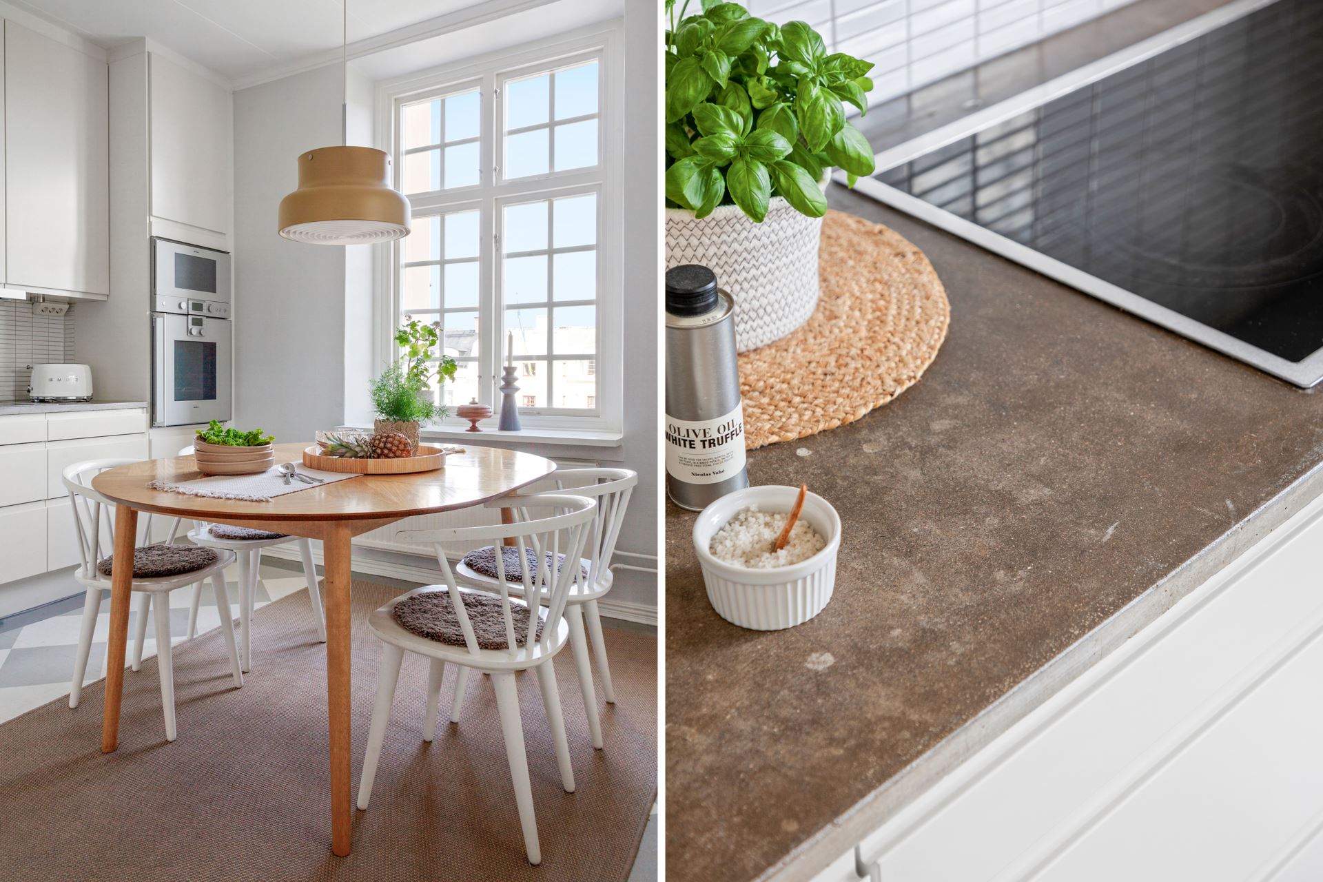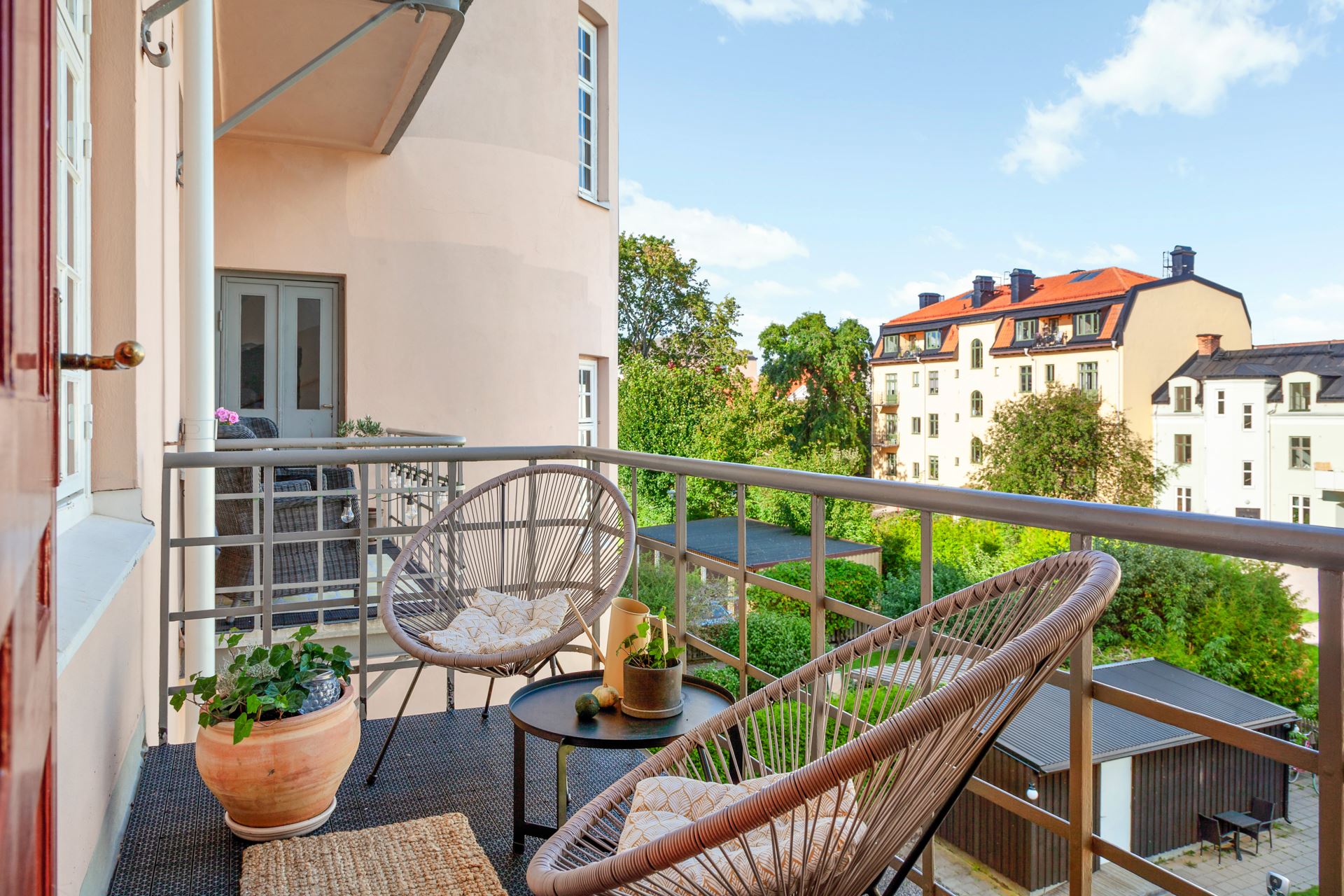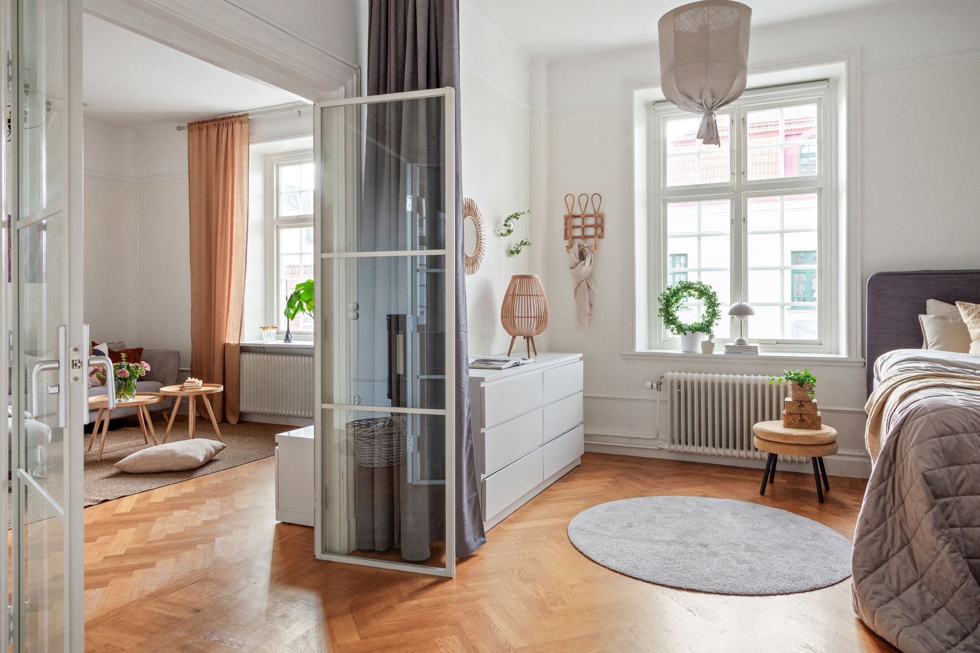 De tre rummen i fil fungerar utmärkt som vardagsrum, matsal och kontor/gästrum och det inre rummet är idag uppdelat i två delar. I vardagsrummet finns en modern braskamin som ger både värme och stämning under årets kallare månader och rummet knyter an till det mittersta rummet i fil genom moderna glasdörrar. Köket som vetter mot den lugna innergården, är renoverat i stilren och modern tappning med släta luckor, integrerade vitvaror och ett platsbyggt skafferi. Därtill nya kyl och frys i extra bred modell. Det målade rutiga trägolvet i grått och vitt knyter an till bostadens karaktär men tillför samtidigt en modern twist. Sovrummet har även det med utsikt mot innergården och erbjuder gott om förvaring bakom skjutdörrsgarderober. Badrummet är smakfullt renoverat med kakel och klinker i brun- och gråtoner med oregelbunden ytfinish, vilket ger en lyxig hotellkänsla. Här finns även en generös takdusch. I bostaden finns även ett nyligen iordninggjort hemmakontor.