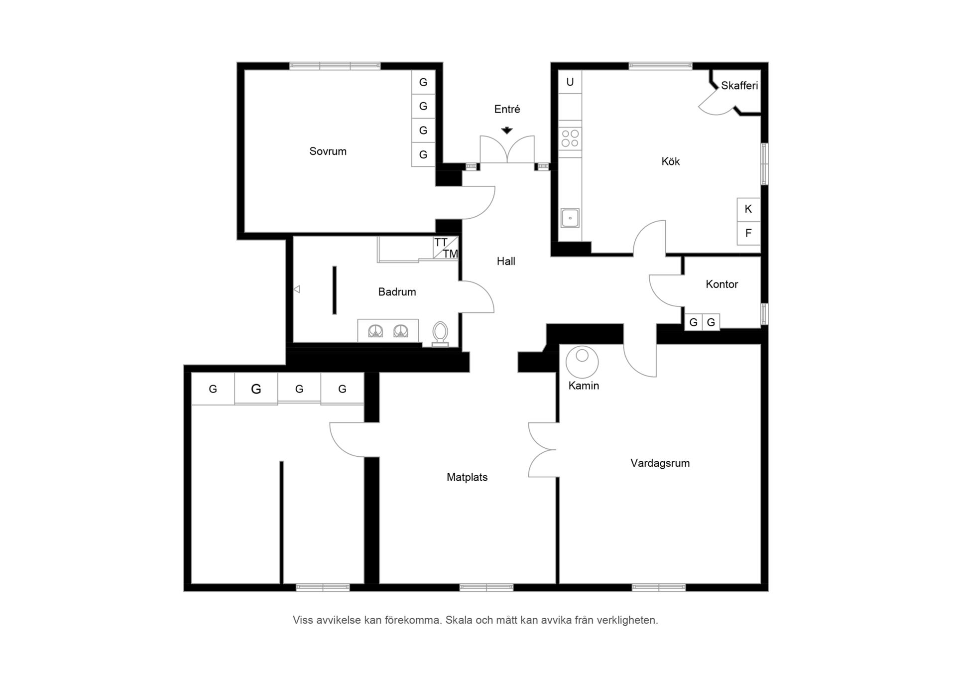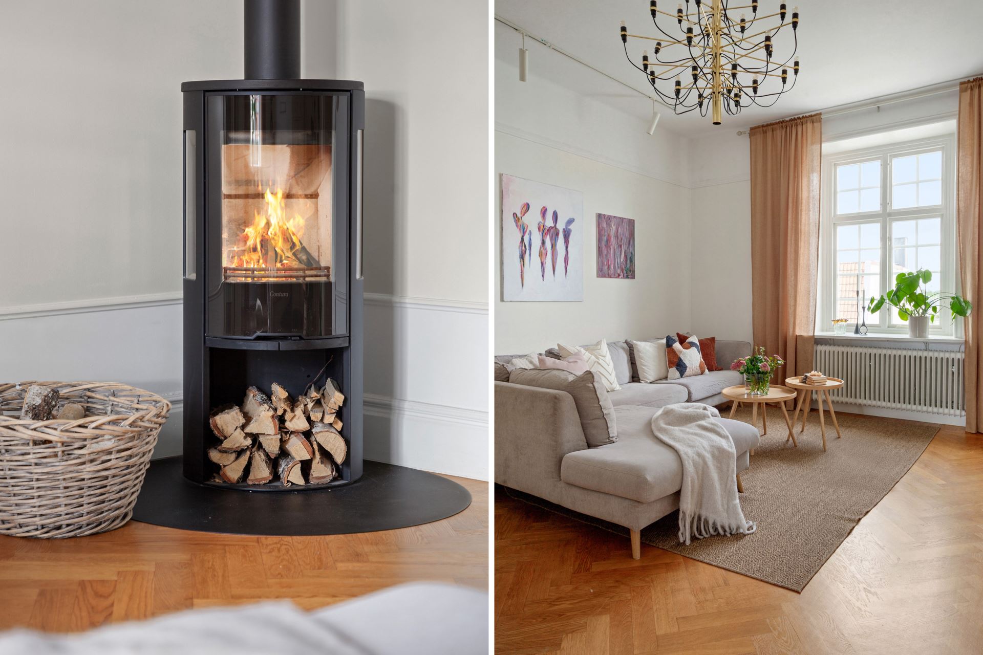 Detaljer: Braskamin som går att elda i. Stora moderna dubbeldörrar av glas.