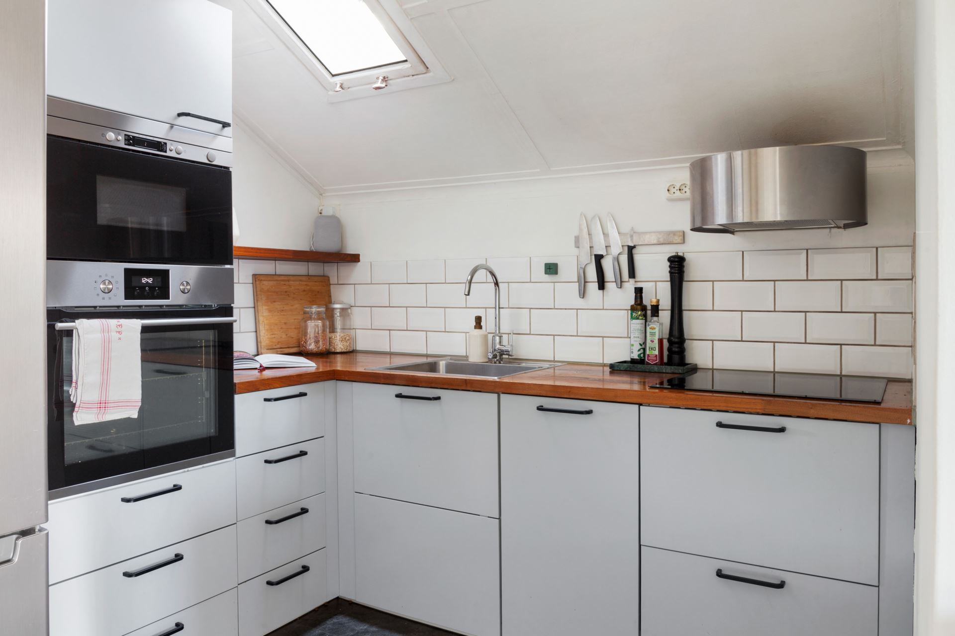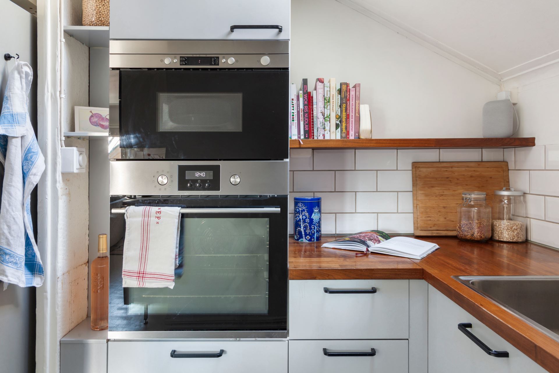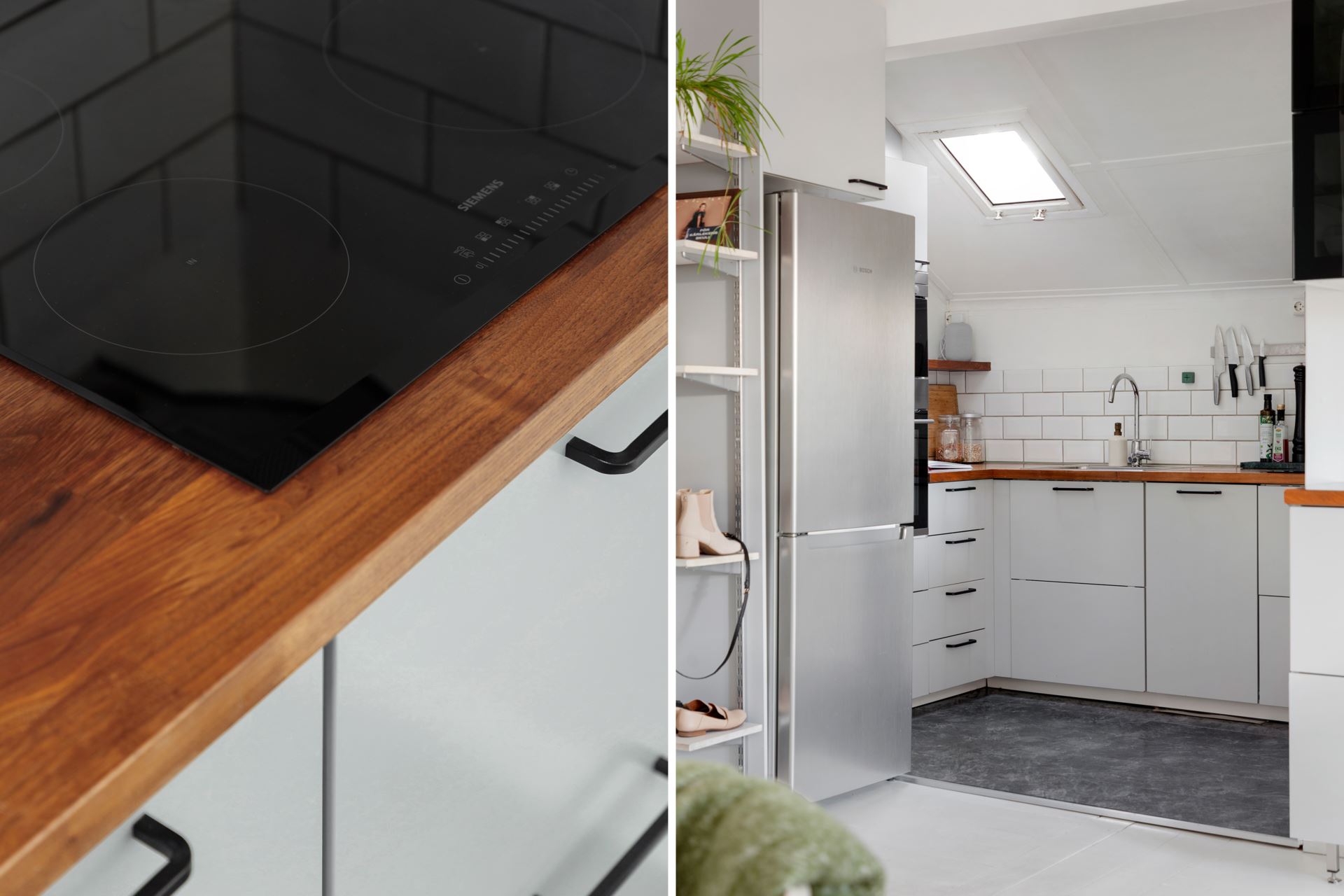 Inredning: Ljusgrått kök med svarta beslag. Inbyggnadsmicro- och ugn i rostfritt. Halvskåp kyl och frys i rostfritt från Bosch. Rostfri kolfilterfläkt. Integrerad diskmaskin. Bänkskivor i mörk ek.