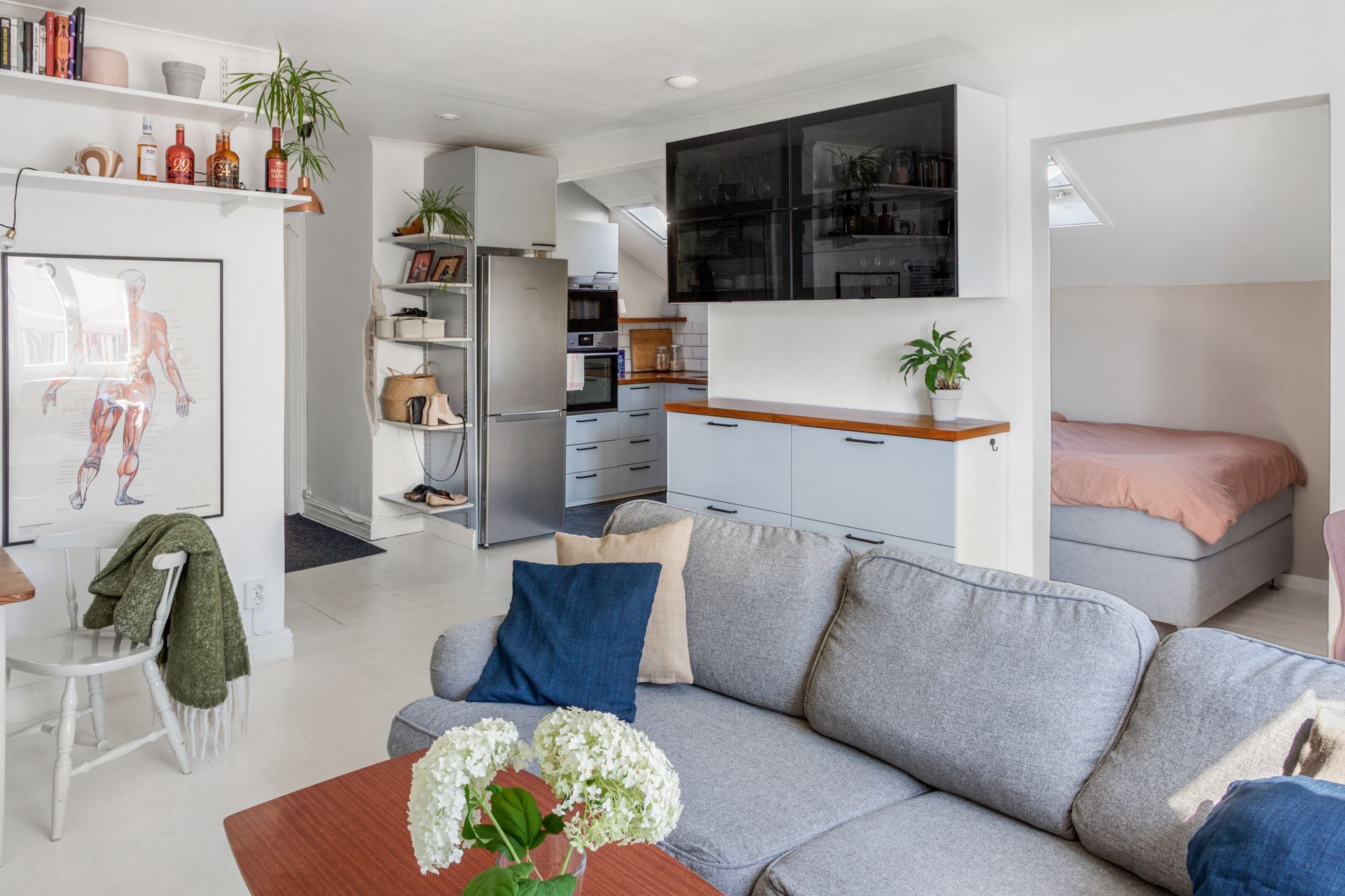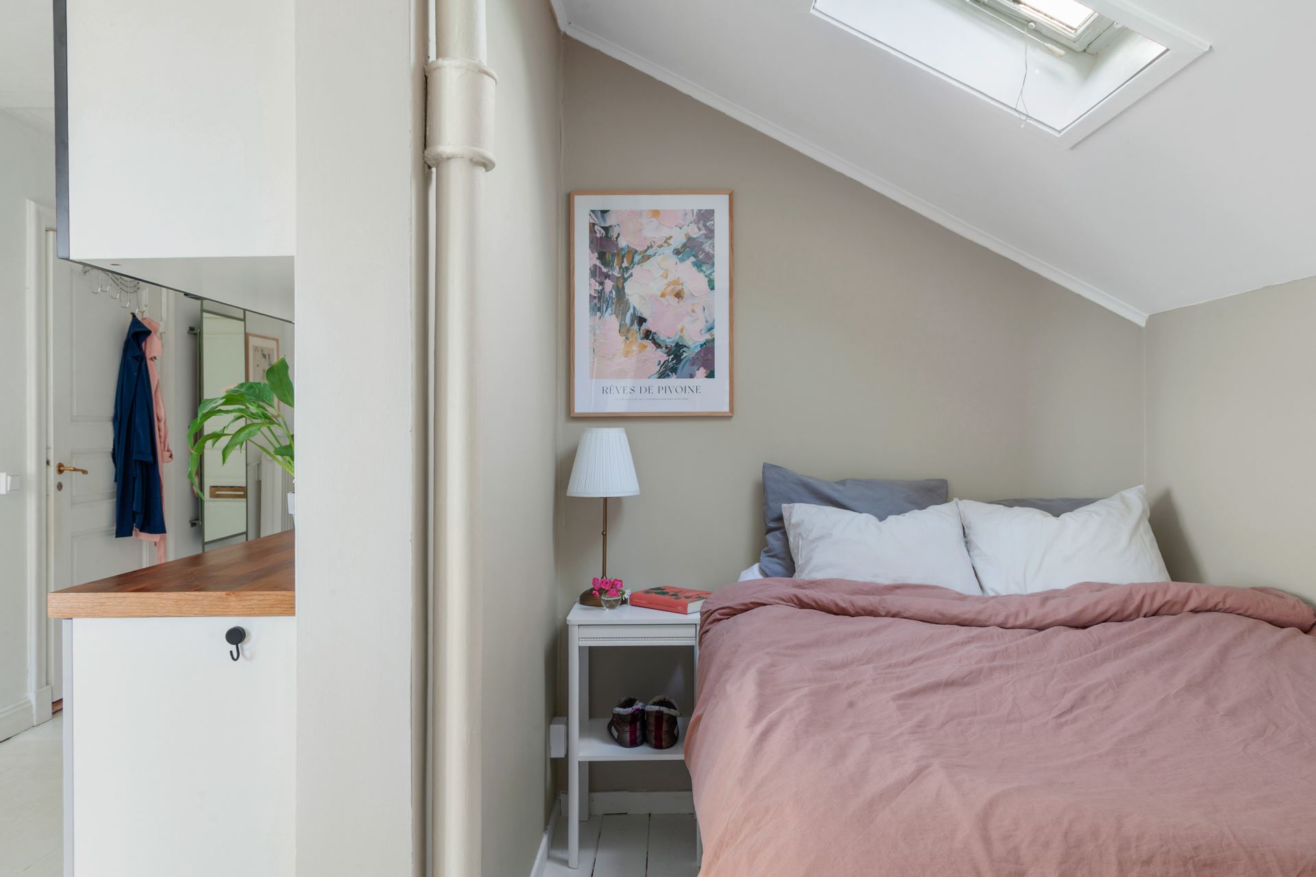 Välkommen till denna charmiga vindsvåning – en ljus och hemtrevlig etta med genomtänkt planlösning med ombonad karaktär. Bostaden erbjuder ett rofyllt hem med en rymlig sovalkov, separat kök och ett stilrent badrum – perfekt för dig som söker ett harmoniskt boende med det lilla extra. Lägenheten har snedtak och takfönster i ett väderstreck samt ett stort fönster mot ett annat väderstreck som skänker ett fint ljusinsläpp och skapar en ljust och luftig känsla. Det separata köket är utrustat med allt som behövs för både vardag- och helgmiddag. Sovalkoven är smart placerad och avskild från vardagsrummet vilket gör att bostaden upplevs som större än sina kvadratmeter. I anslutning till sovalkoven har man även byggt en mindre walk-in closet som optimerar bostadens förvaring. Badrummet har moderna ytskikt och en tidlös design. Här finns dusch, wc, handfat, förvaring samt behaglig golvvärme.