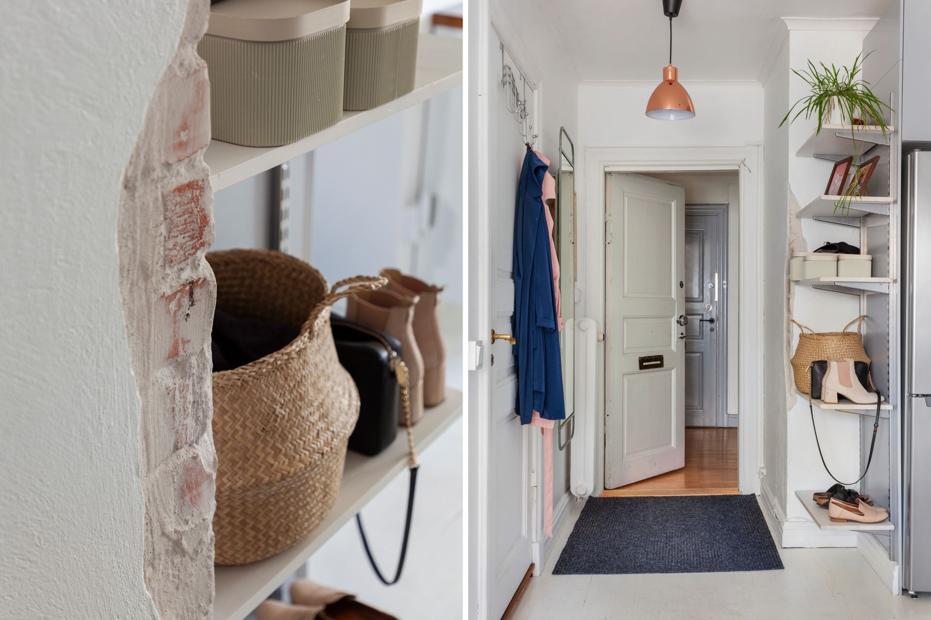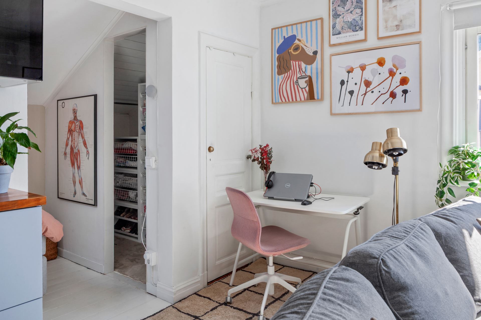 Inredning: Praktisk walk in-closet med såväl hängade som hyllförvaring. Öppning från sovrum vilket optimerar utrymme i vardagsrummet