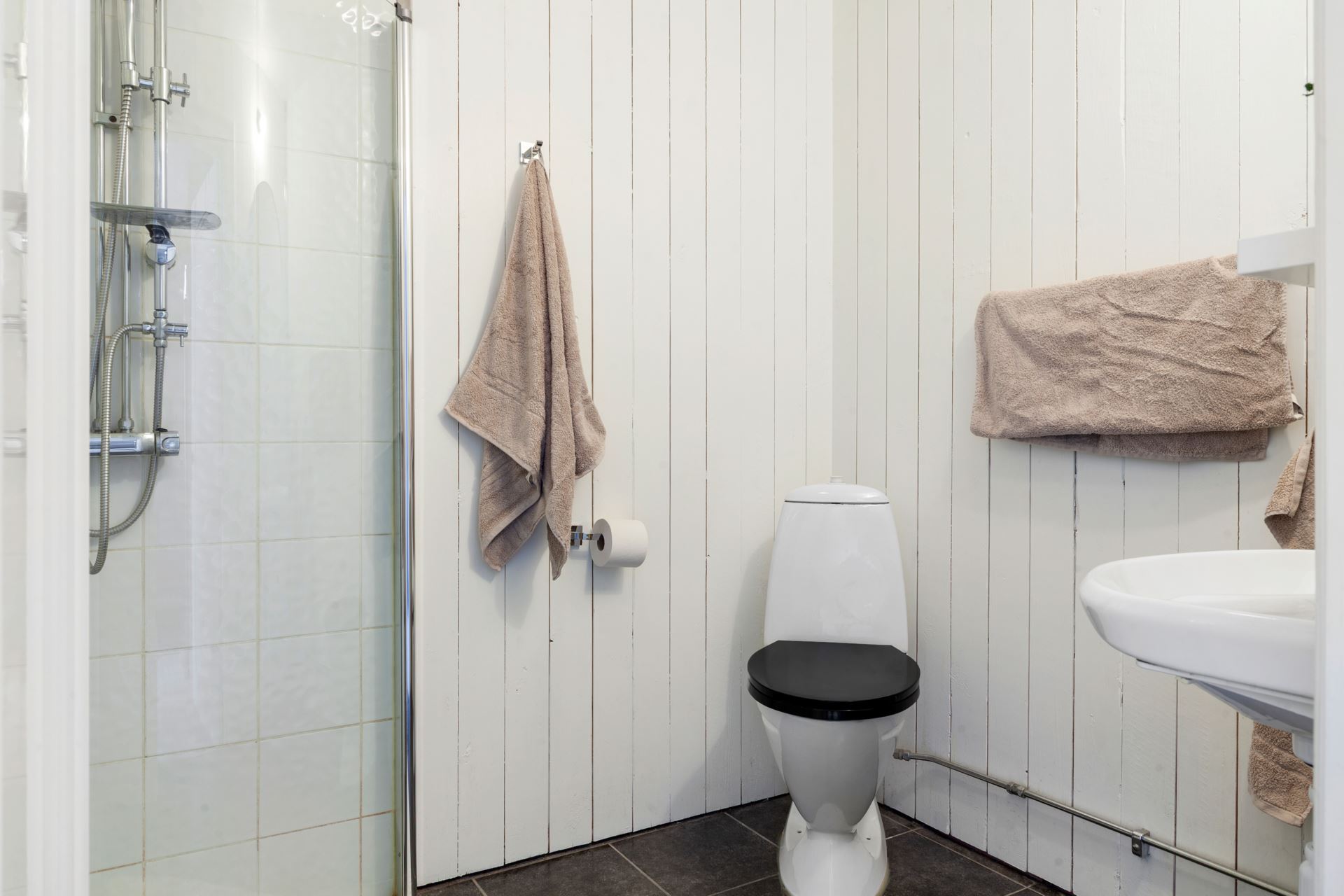 Väggar: Träpanel samt kakel i våtzon