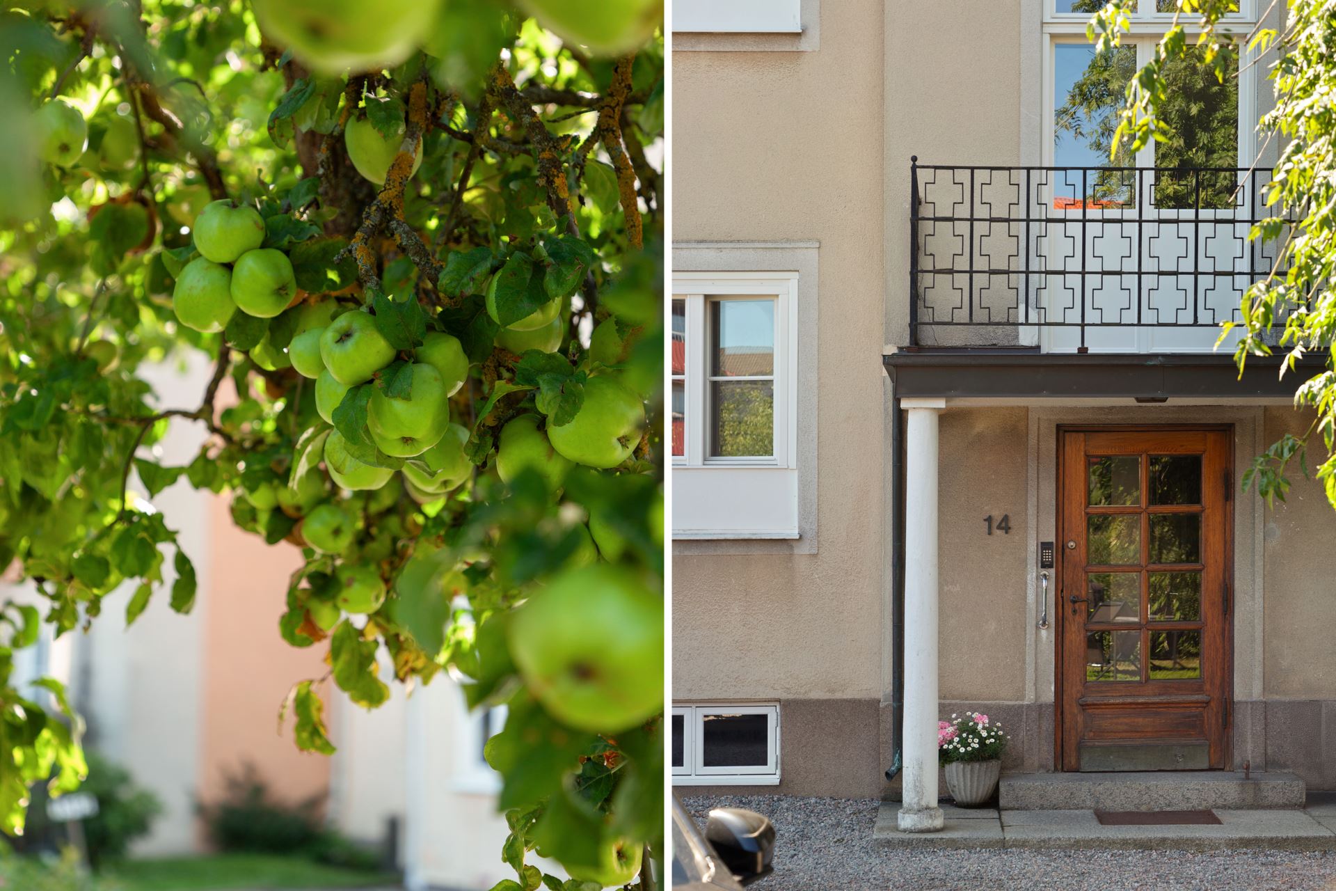 Stor uppvuxen trädgård med fruktträd, gräsmatta samt gemensamma trädgårdsmöbler. Lekyta med studsmatta