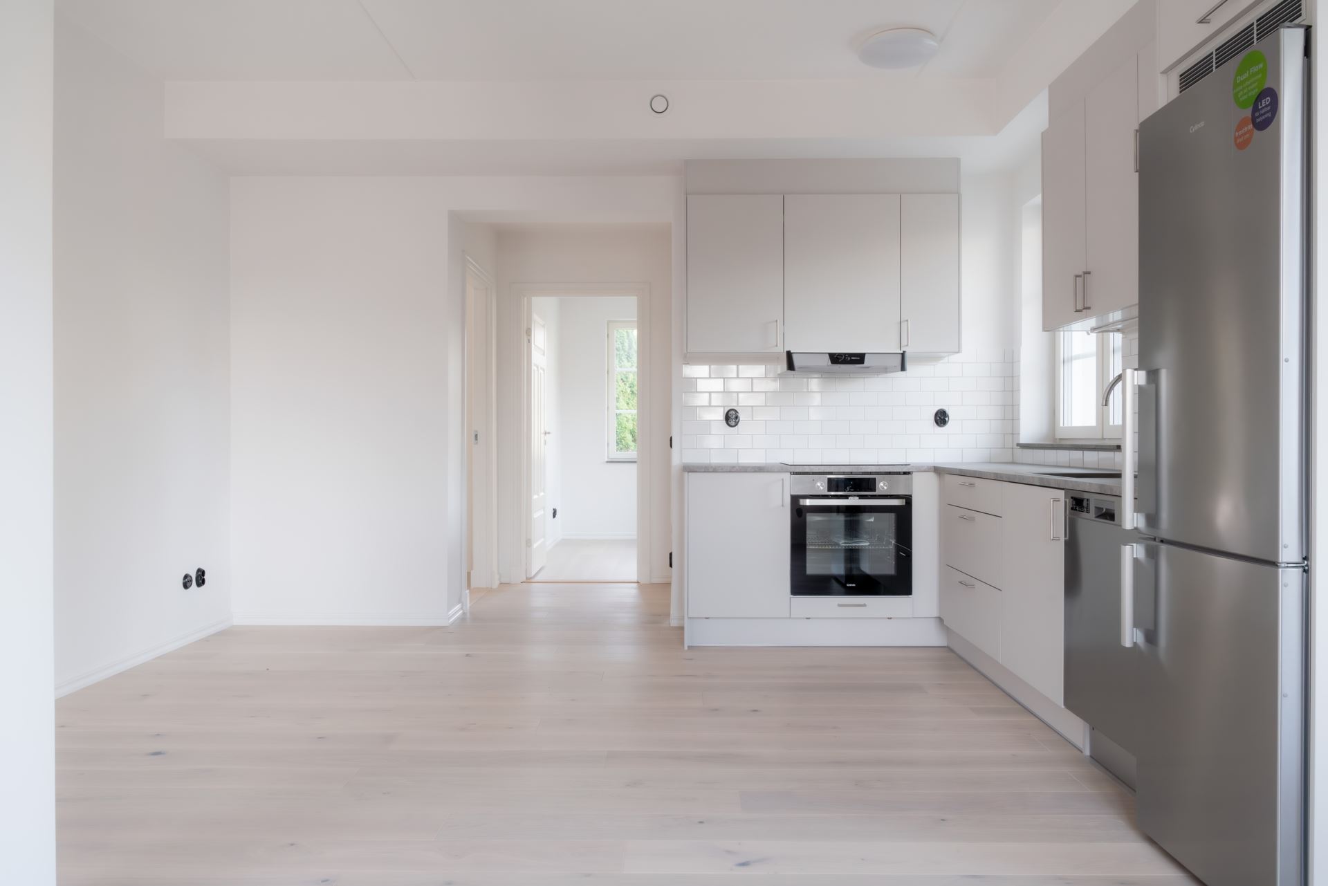 Utrustning: Puustellikök med vitvaror från Cylinda, bänkskiva i laminat, stänkskydd vitt blankt kakel.
