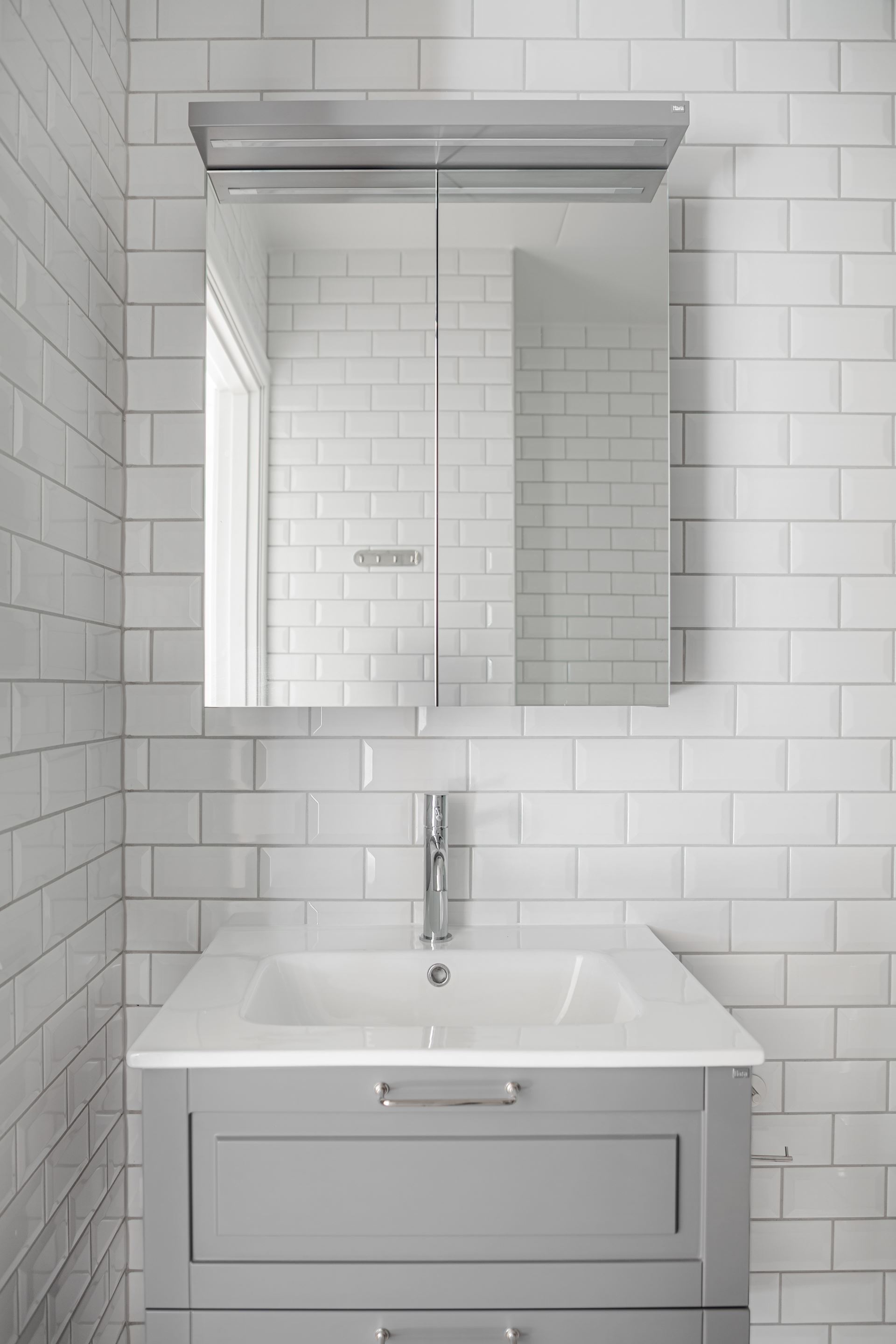 Utrustning: Puustellikök med vitvaror från Cylinda, bänkskiva i laminat, stänkskydd vitt blankt kakel.