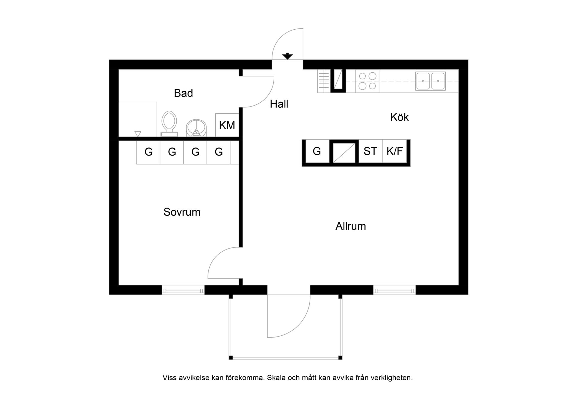 Utrustning: Puustellikök med vitvaror från Cylinda, bänkskiva i laminat, stänkskydd vitt blankt kakel.