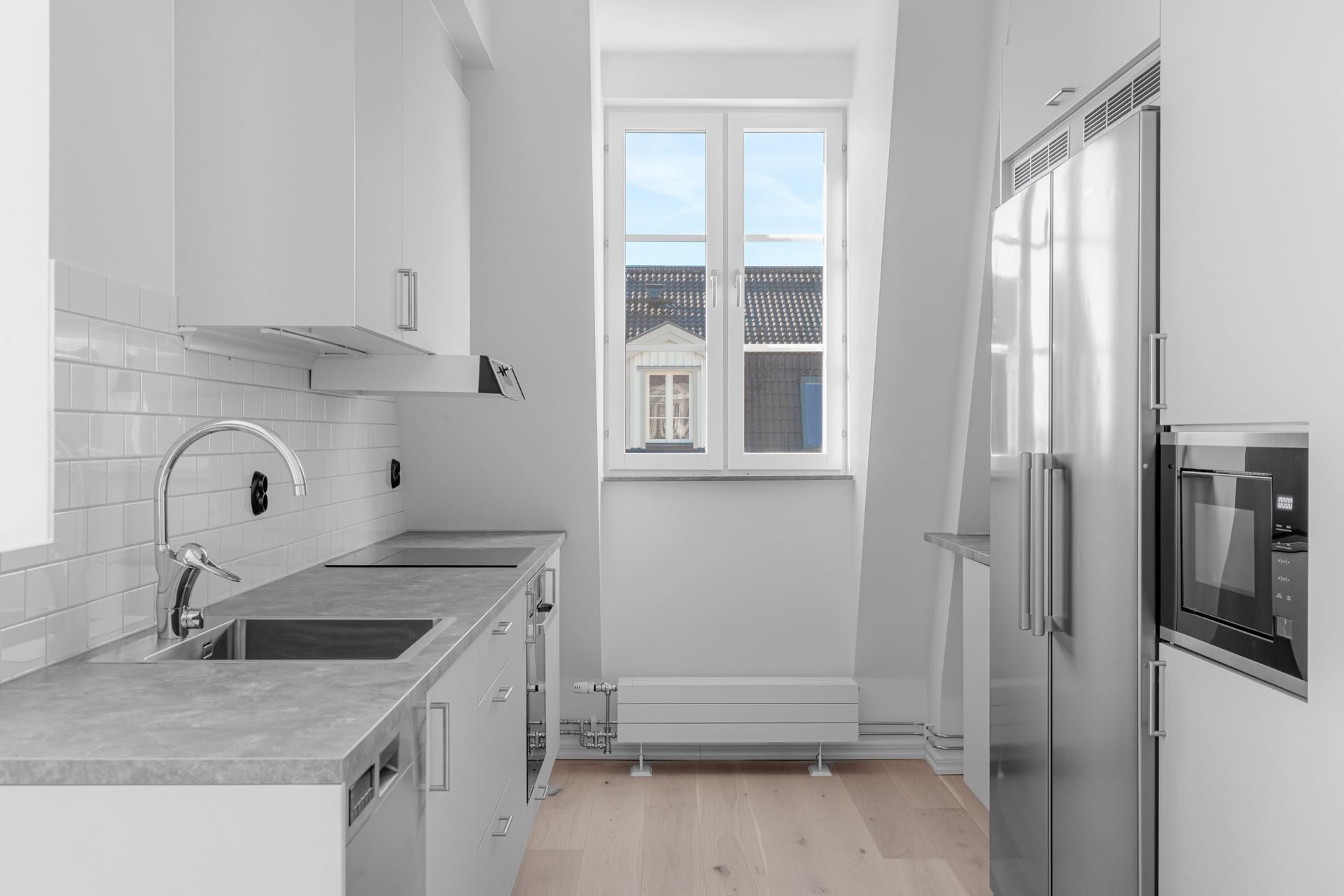 Utrustning: Puustellikök med vitvaror från Cylinda, bänkskiva i laminat, stänkskydd vitt blankt kakel.