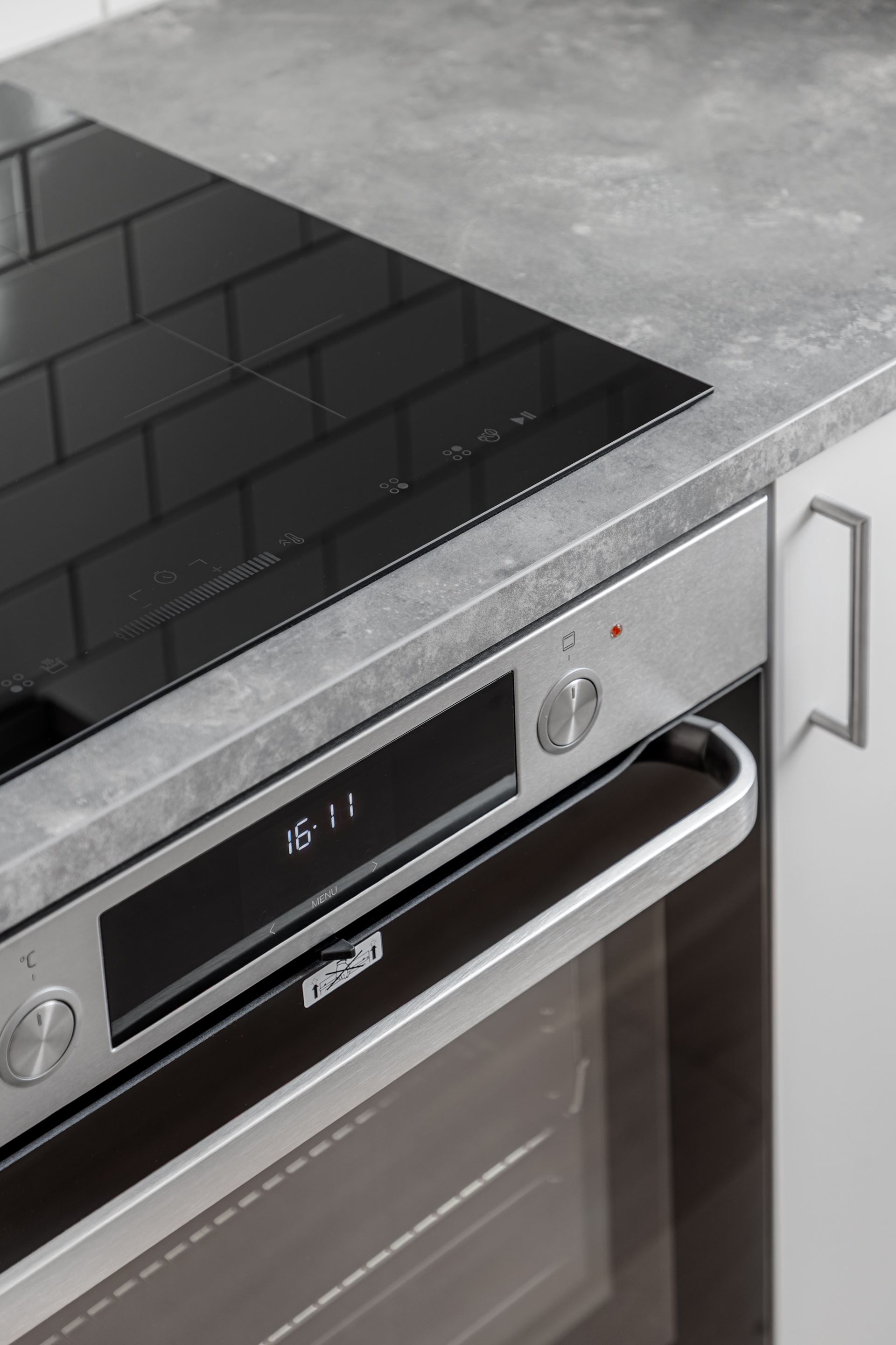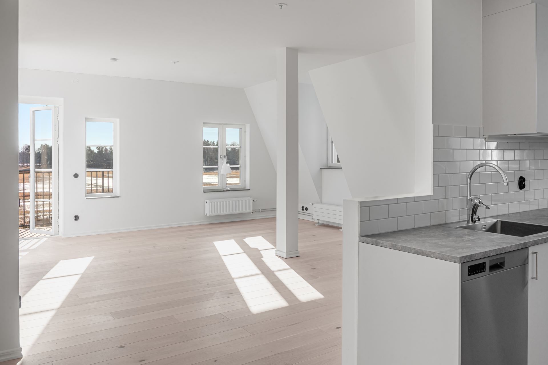 Utrustning: Puustellikök med vitvaror från Cylinda, bänkskiva i laminat, stänkskydd vitt blankt kakel.