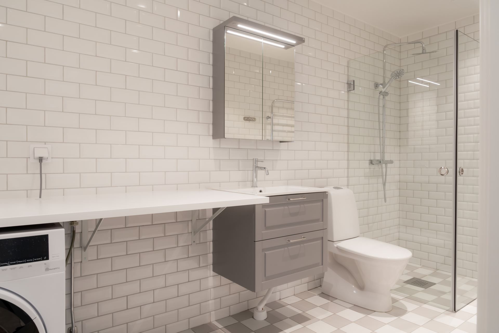 Golvvärme, kombinationstvättmaskin, glasduschväggar och takspotlights.
