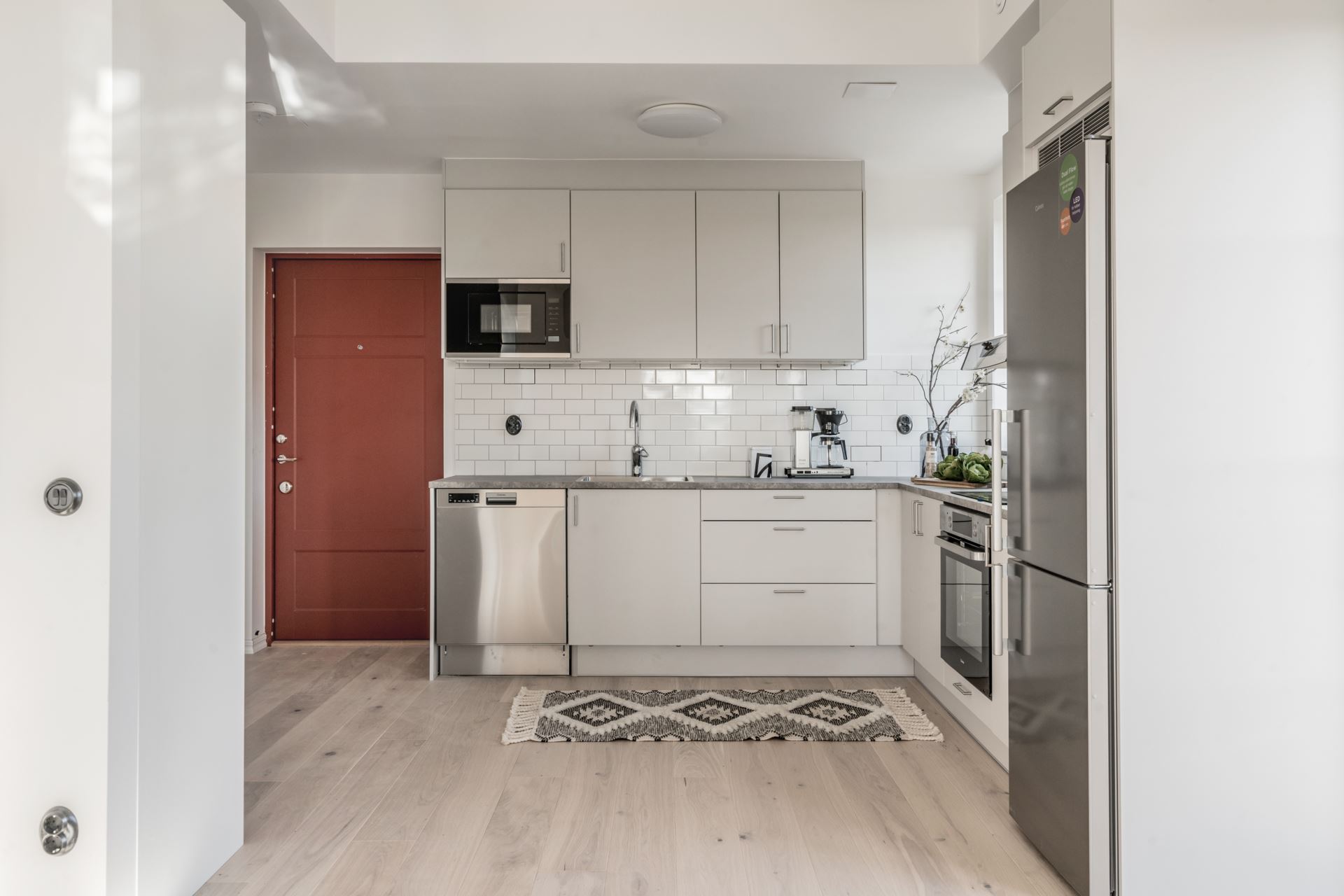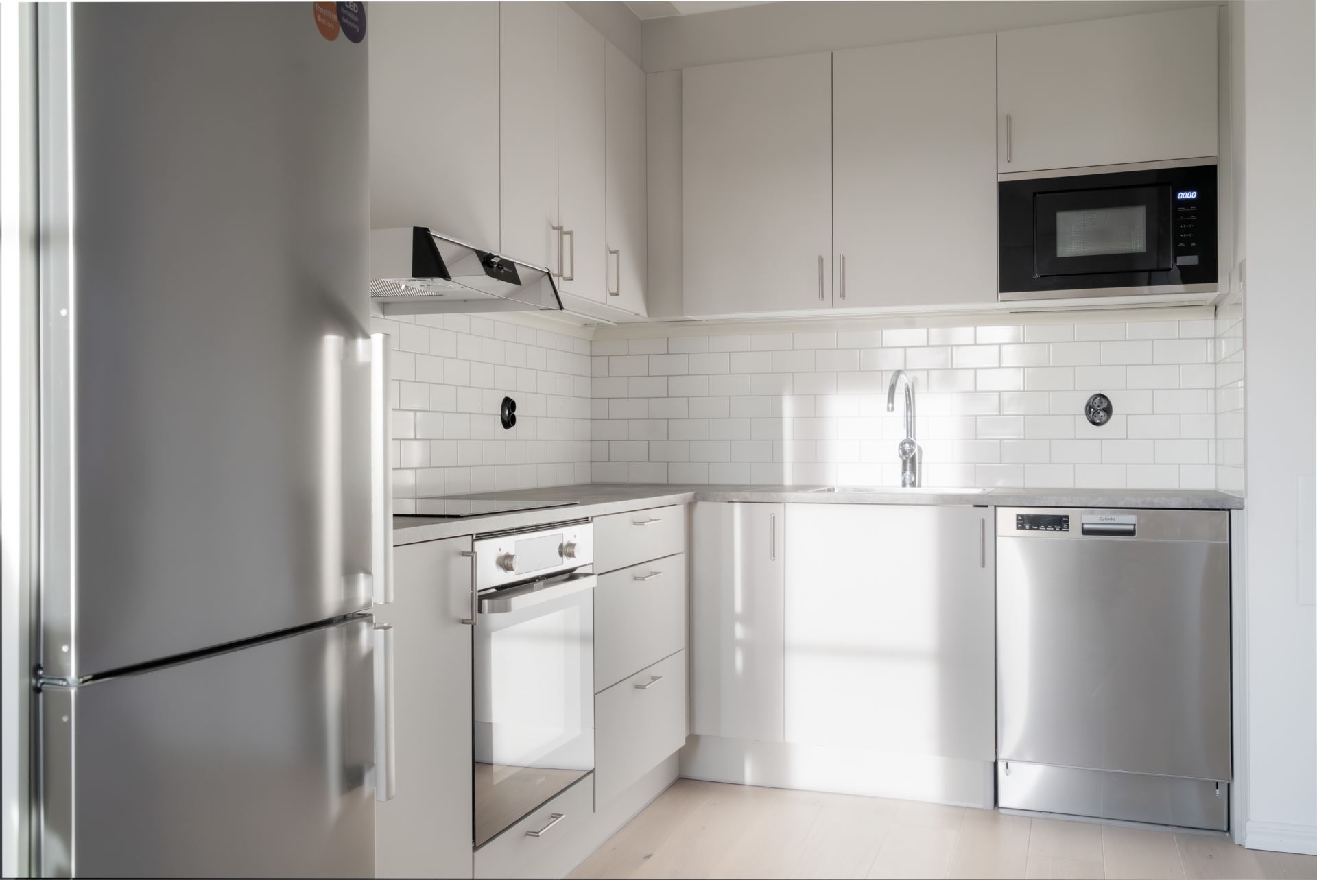 Utrustning: Puustellikök med vitvaror från Cylinda, bänkskiva i laminat, stänkskydd vitt blankt kakel.