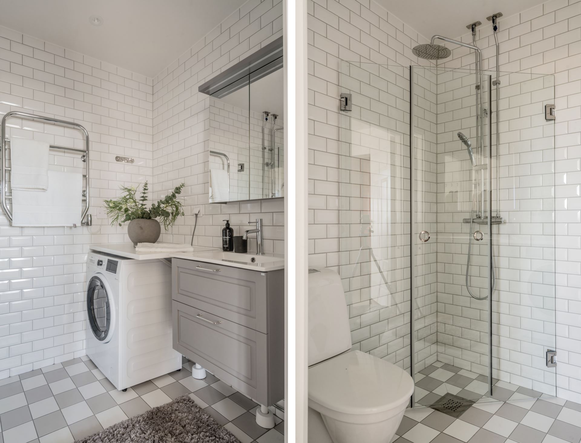 Golvvärme, kombinationstvättmaskin, glasduschväggar och takspotlights.