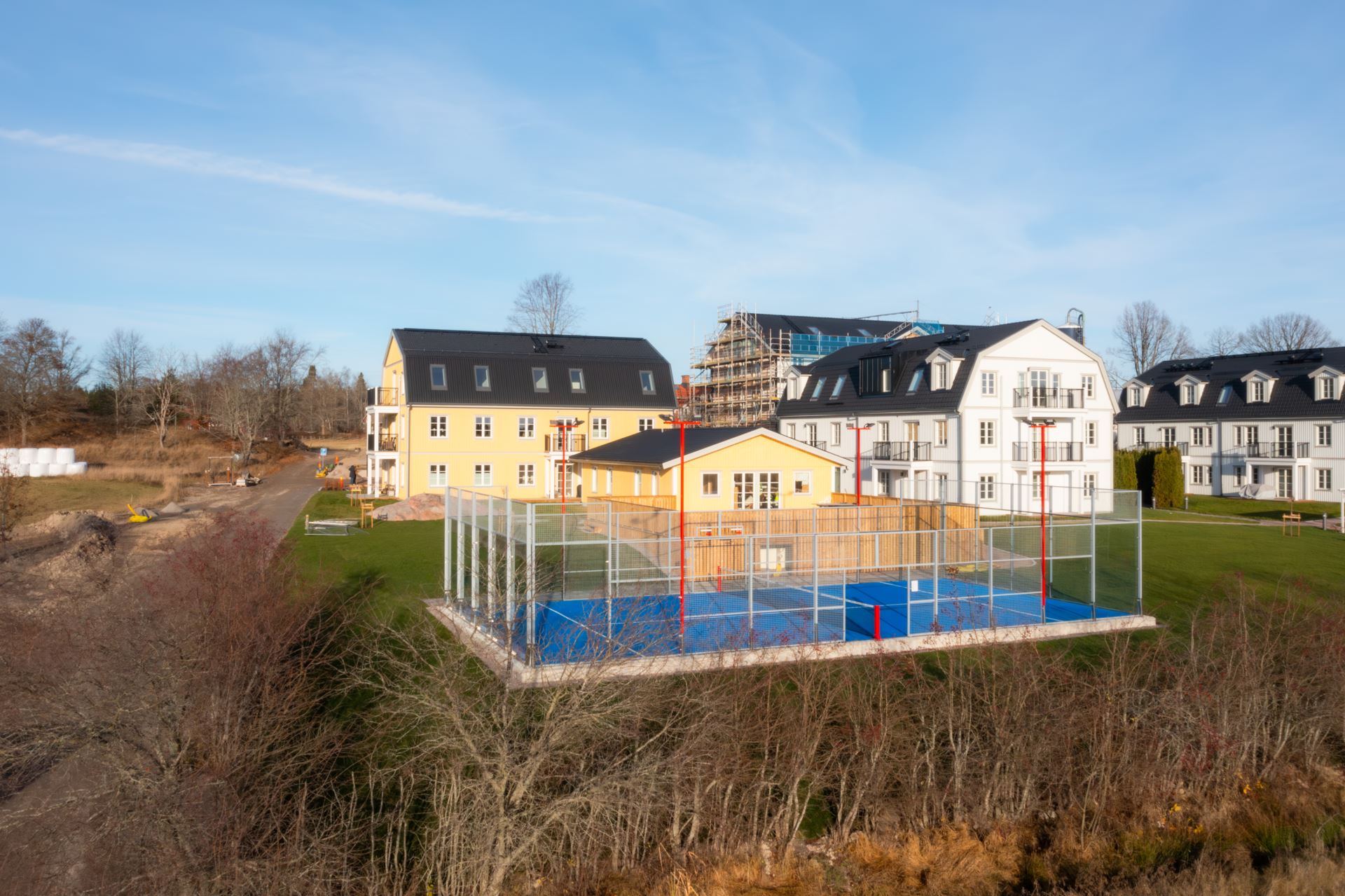 Cykelförråd, lägenhetsförråd, gym, pool, padelbana, parkliknande tomt samt mark, bastu och brygga vid Marsviken.
