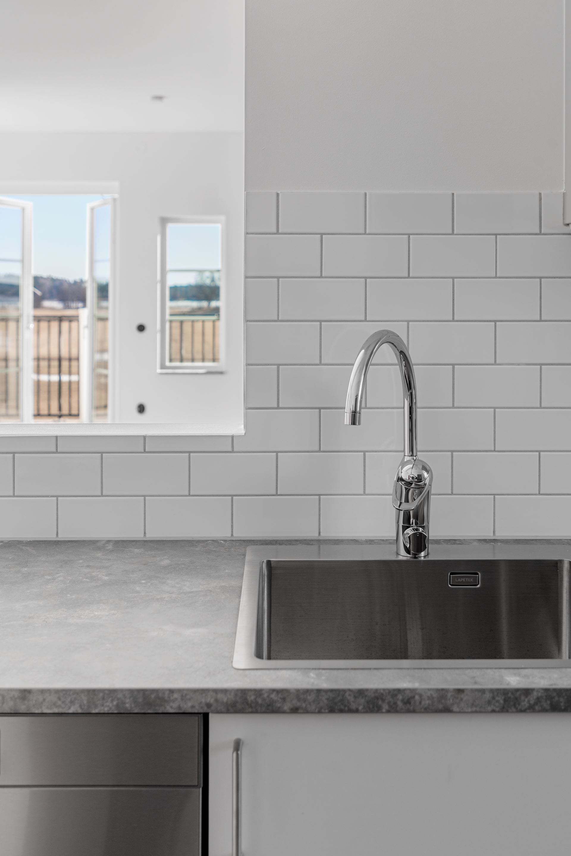 Utrustning: Puustellikök med vitvaror från Cylinda, bänkskiva i laminat, stänkskydd vitt blankt kakel.