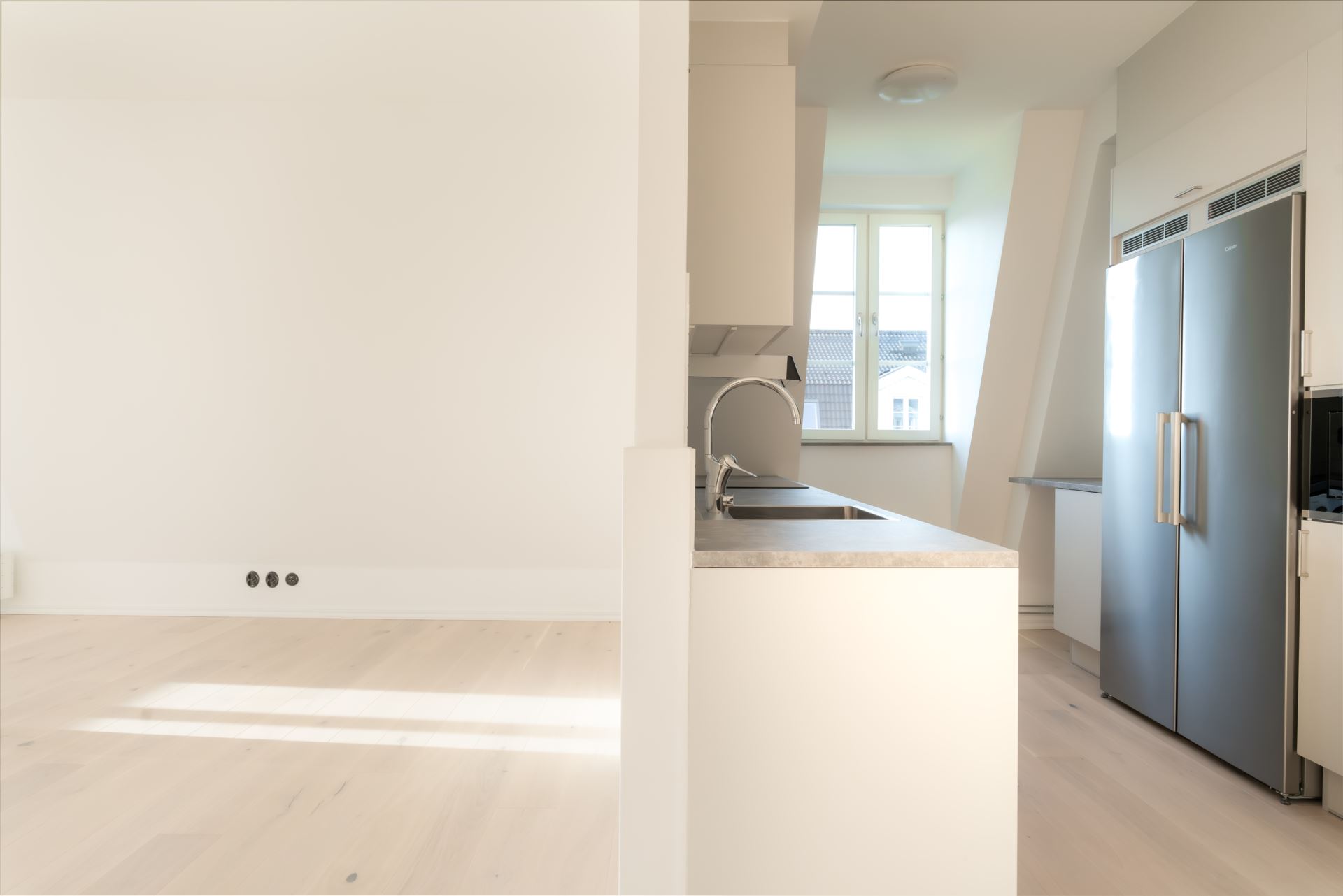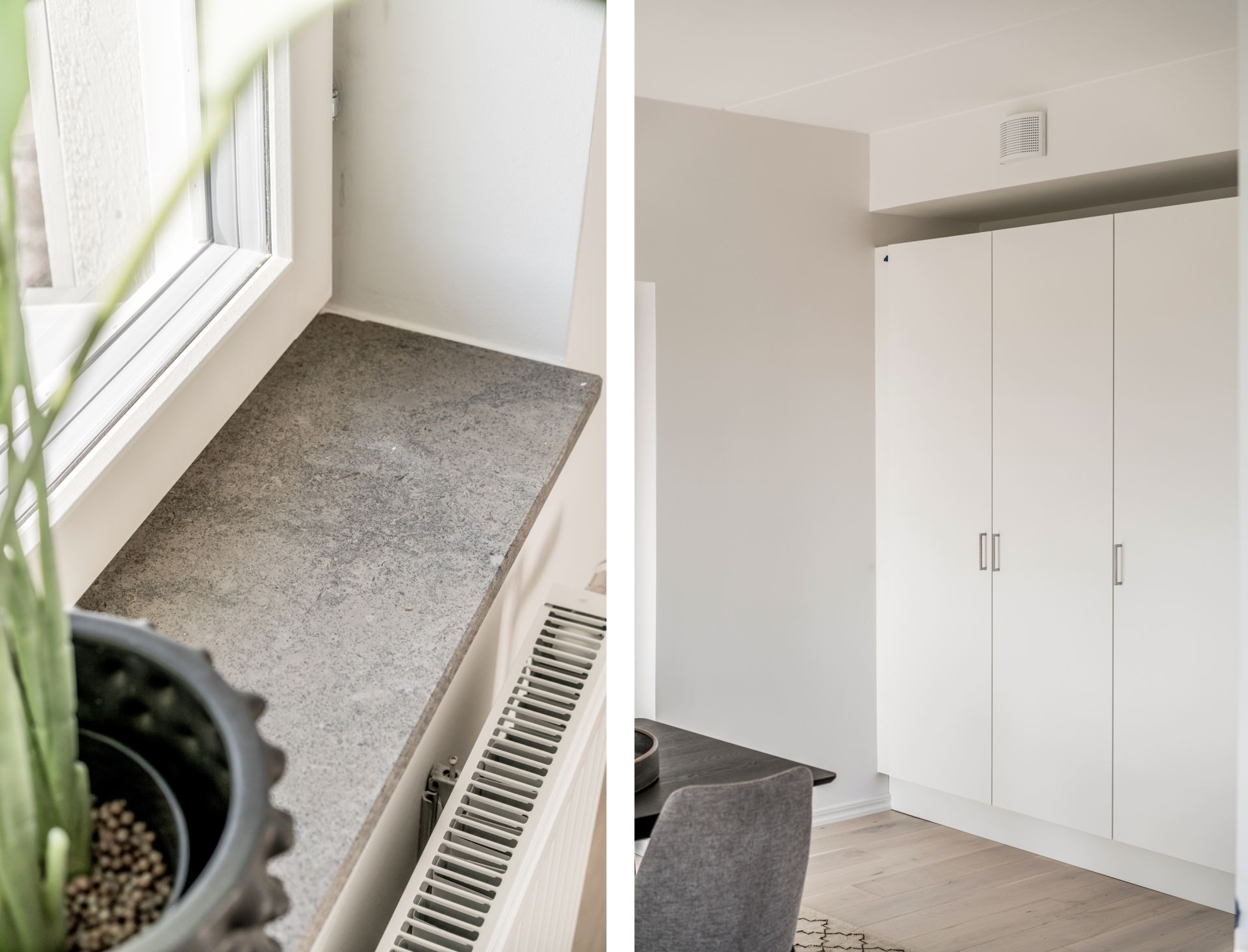 Utrustning: Puustellikök med vitvaror från Cylinda, bänkskiva i laminat, stänkskydd vitt blankt kakel.