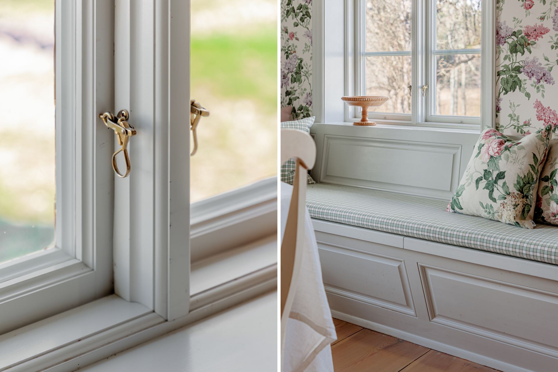 Detaljer: Välarbetade snickerier och vackra beslag på fönster och dörrar.