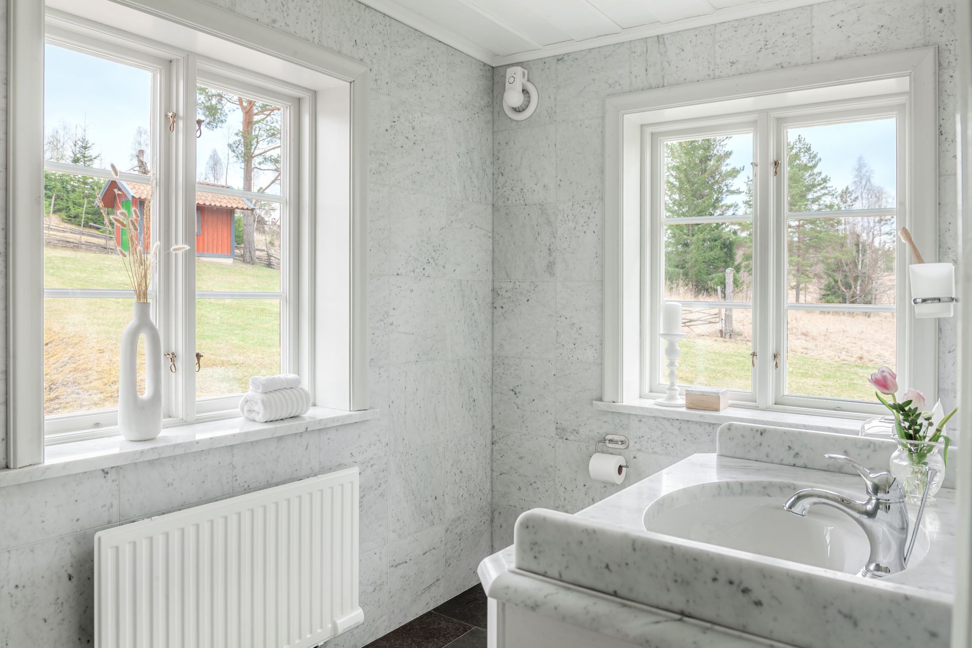 Detaljer: Två stora spröjsade fönster till badrummet ger ett generöst ljusinsläpp.