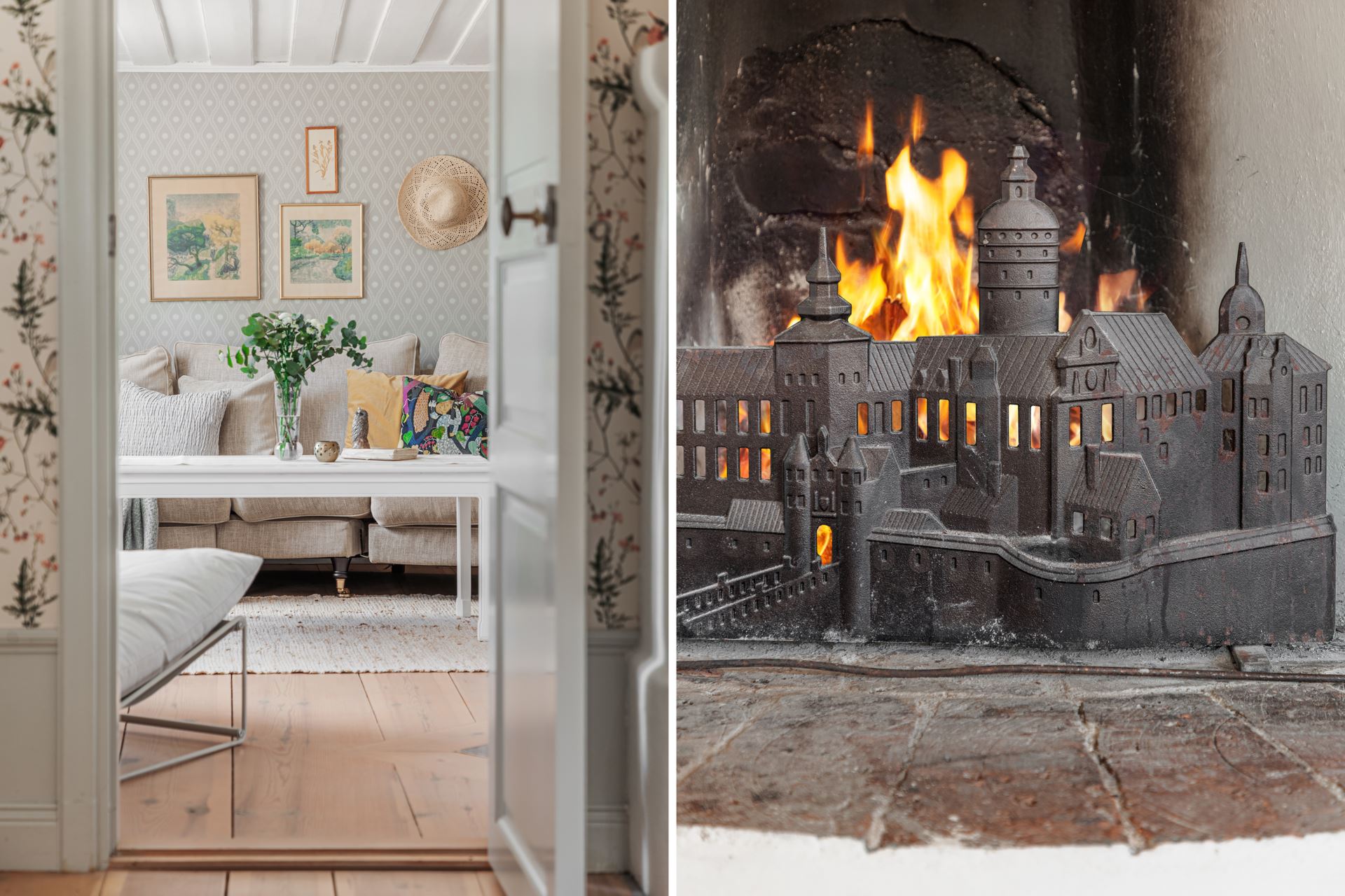 Inredning: Öppen spis med Kolmårdsmarmor framför.