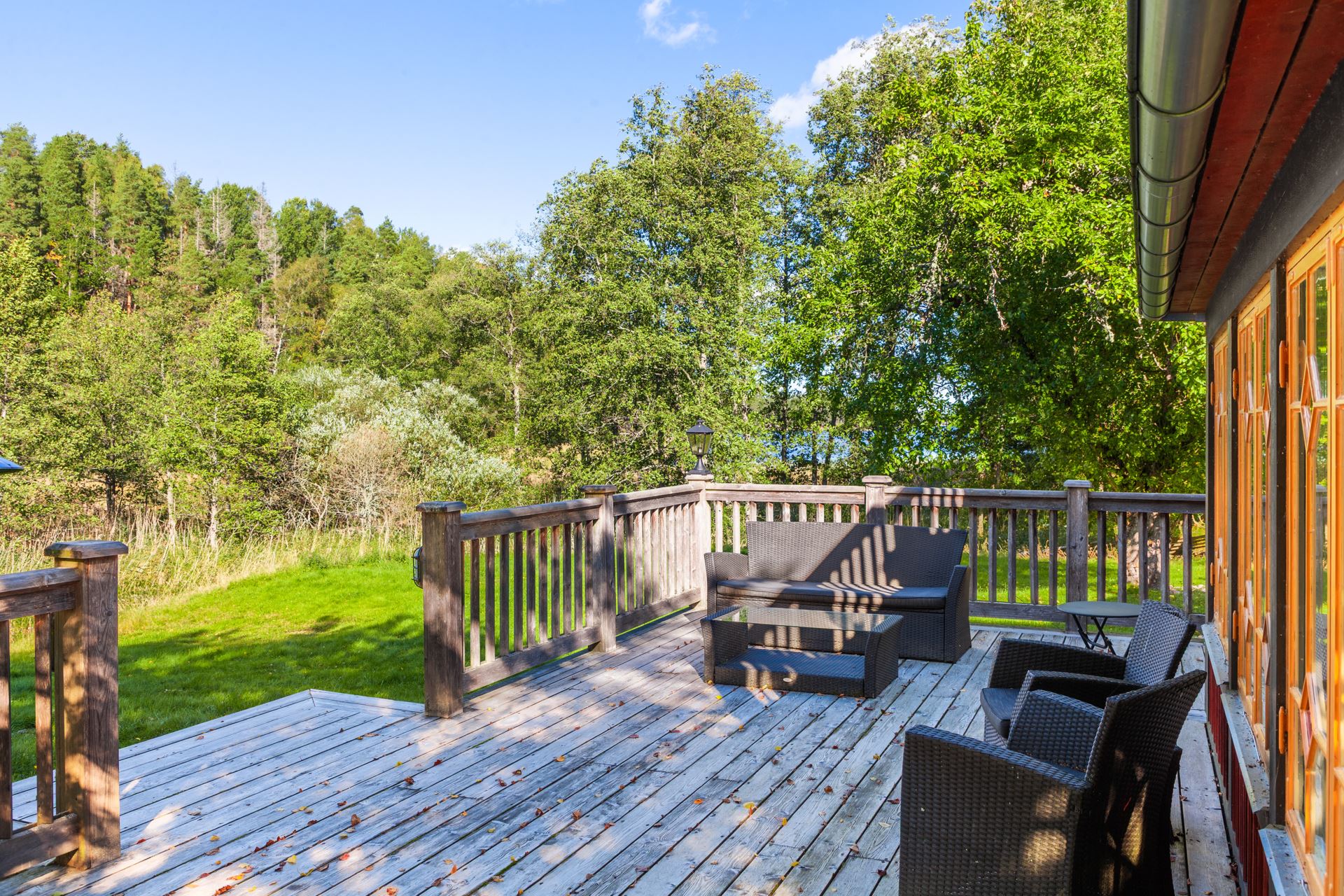 Detaljer: Här njuter du av utsikt över veranda ner mot sjön och husets brygga.