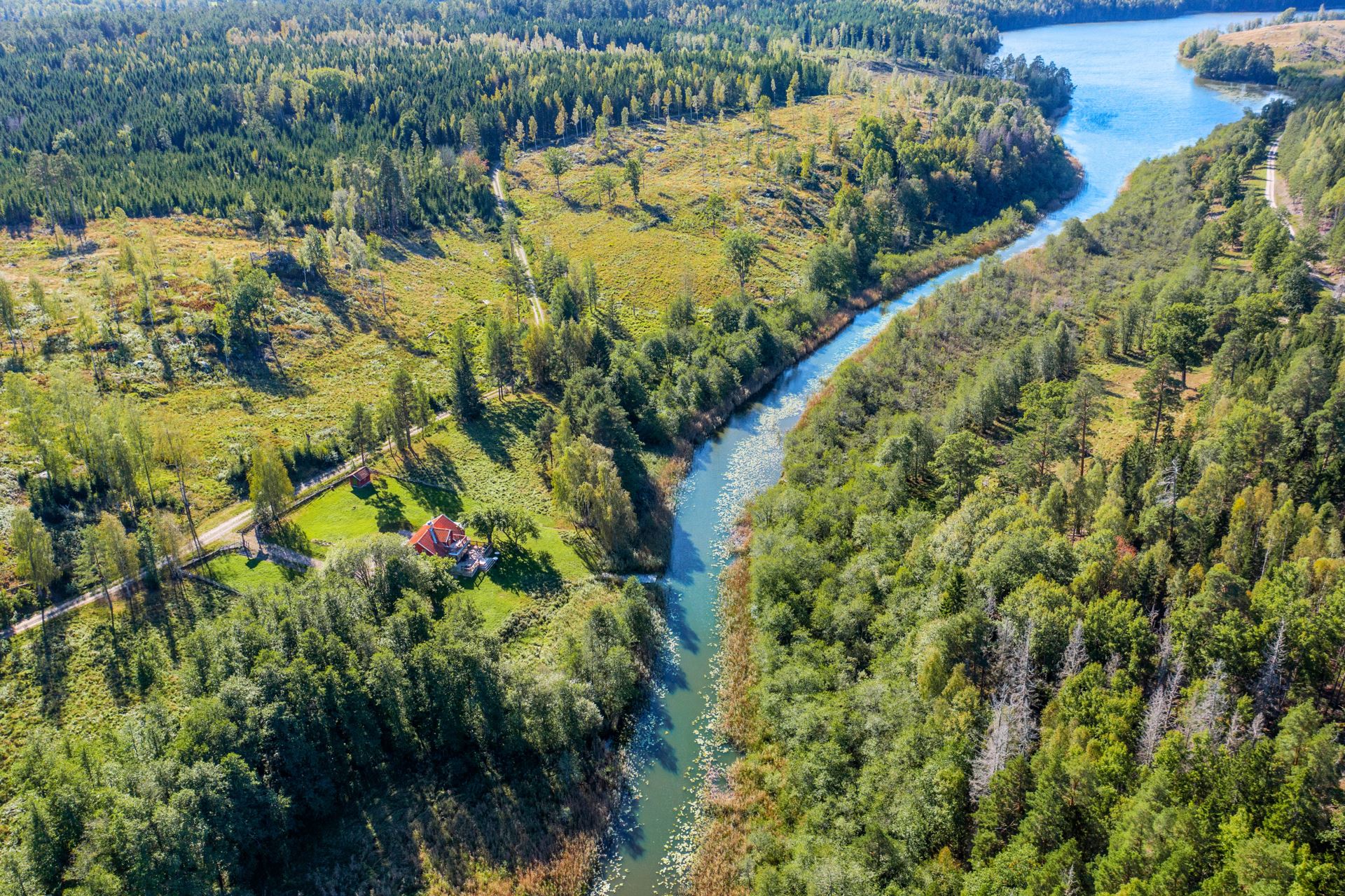 Veranda med plats för möblemang mot kanal som mynnar ut i Båven