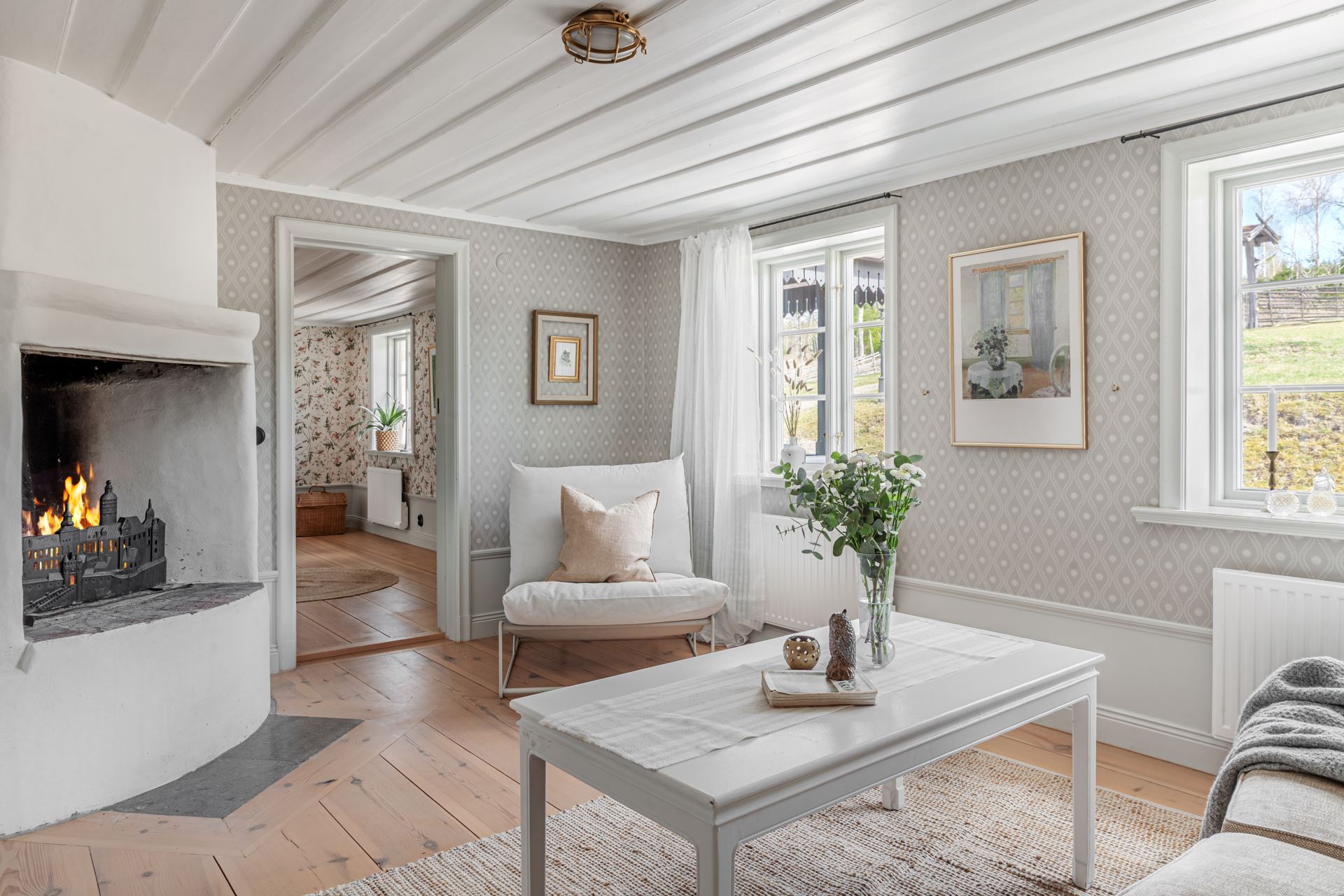 Väl tillbaka i torpets kök tar du dig vidare till ett genomgångsrum med öppen spis, detta rum skulle likväl kunna användas som sällskapsrum som till matsal. Rummet angränsar till ett vardagsrum, även det med öppen spis, samt till ett sovrum med tillhörande badrum. Även i badrummet har man valt stilsäker och exklusiv marmor. Badrummet är mycket ljust tack vare flera fönster.