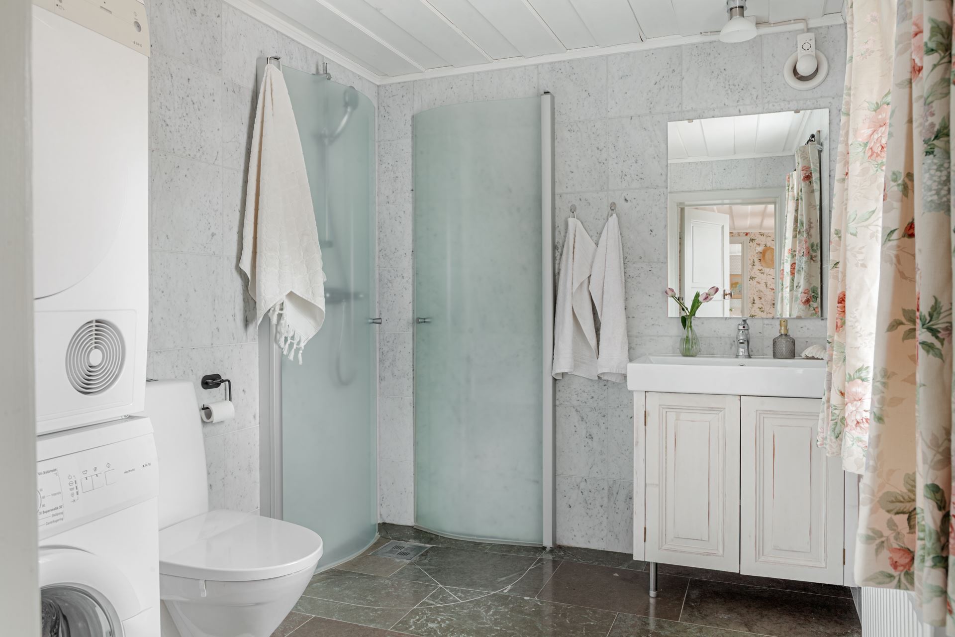 Från bostadens hall finner man ytterligare ett badrum med tvättmaskin och torktumlare, dusch, wc och kommod med förvaring. Även här med påkostade material.