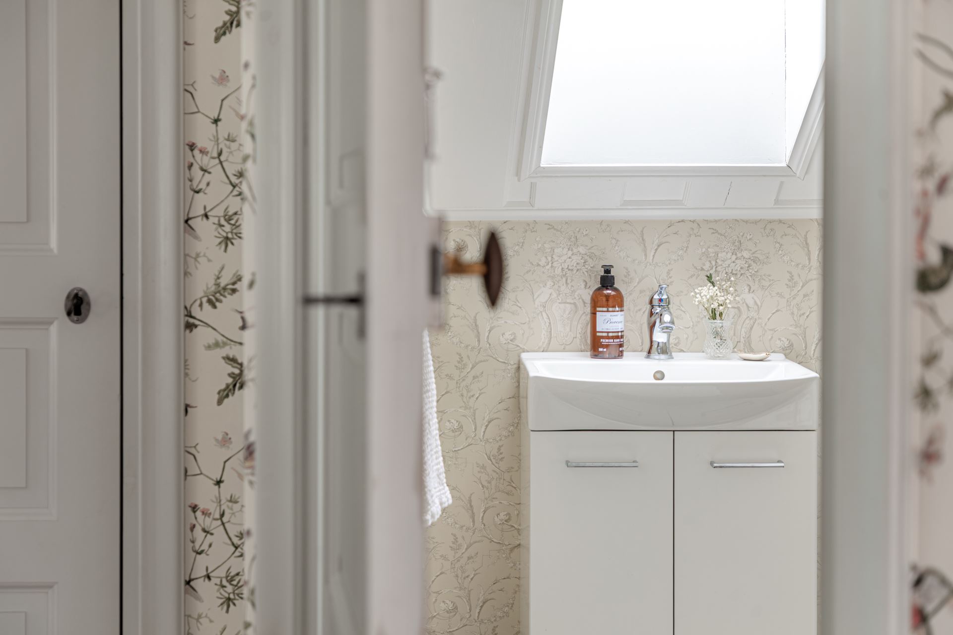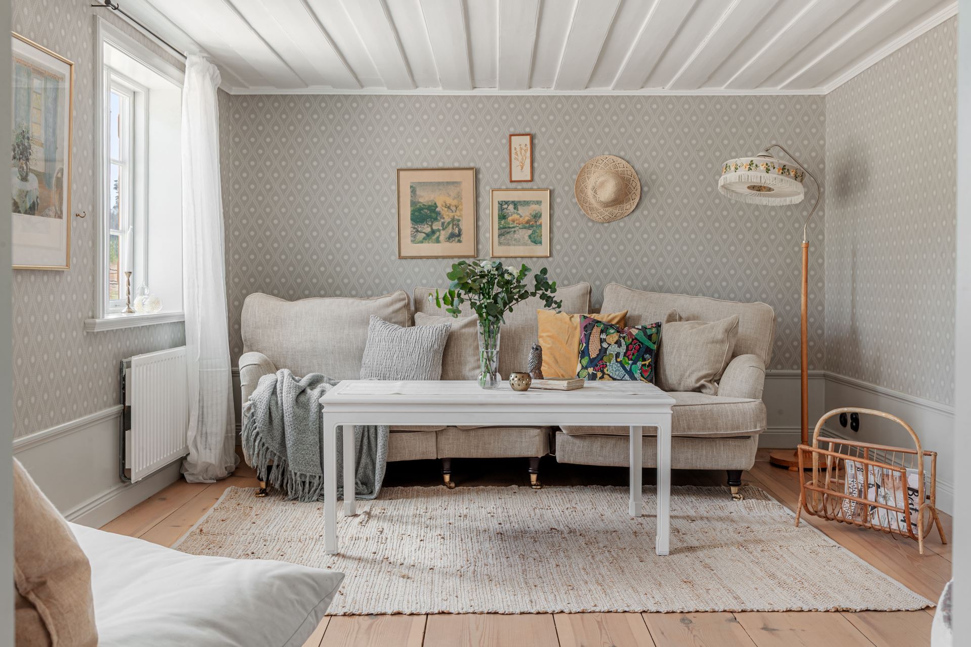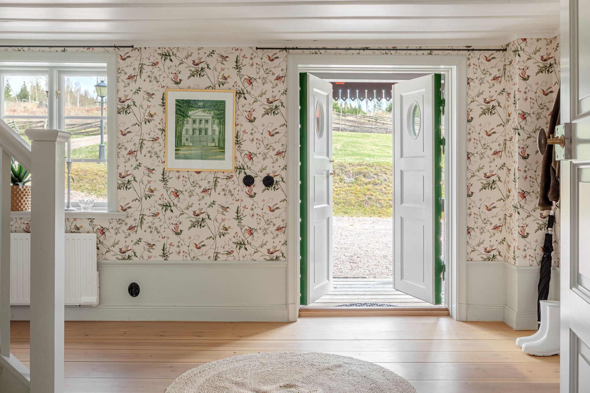 Väggar: Höga målade socklar och ljus blommig tapet.