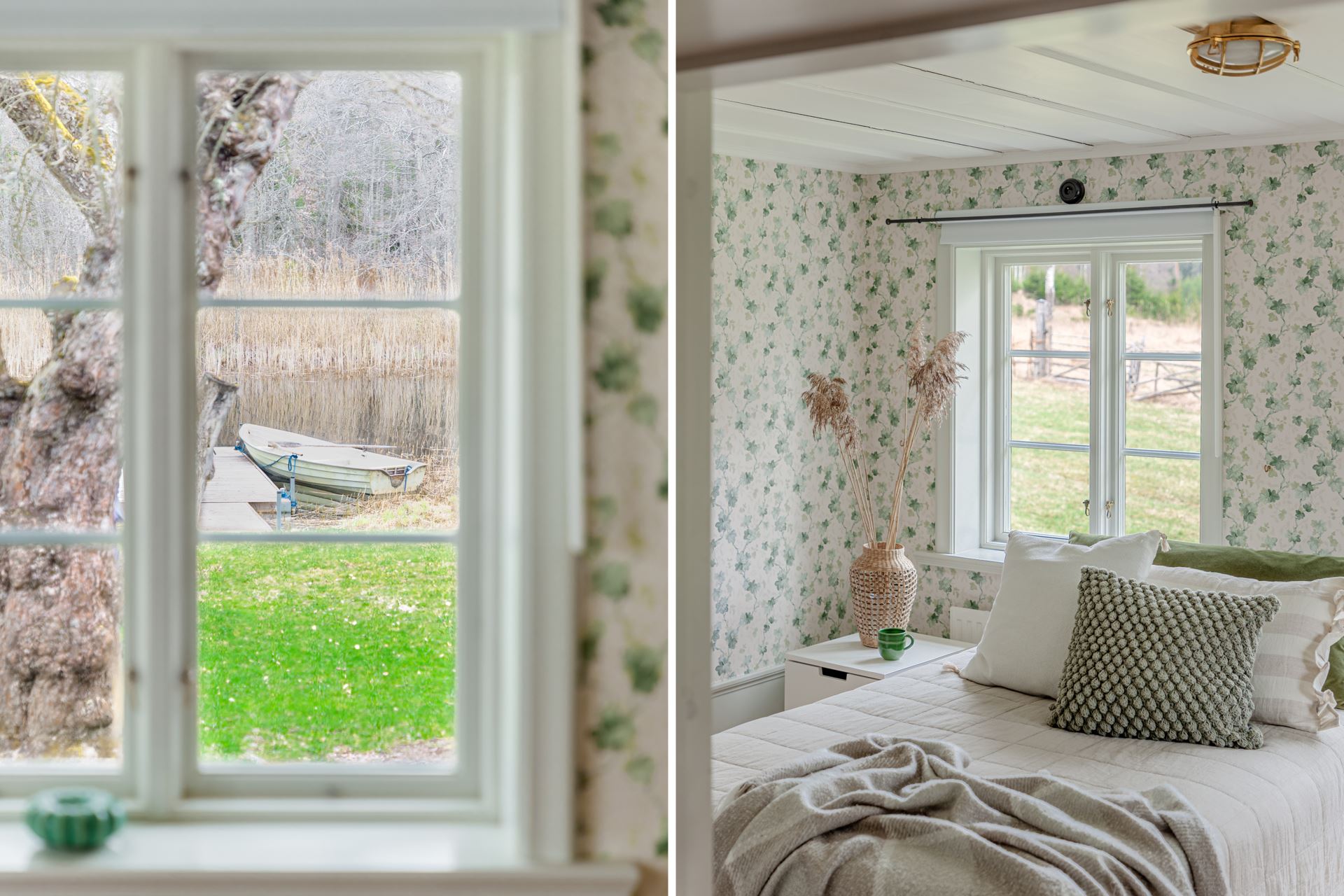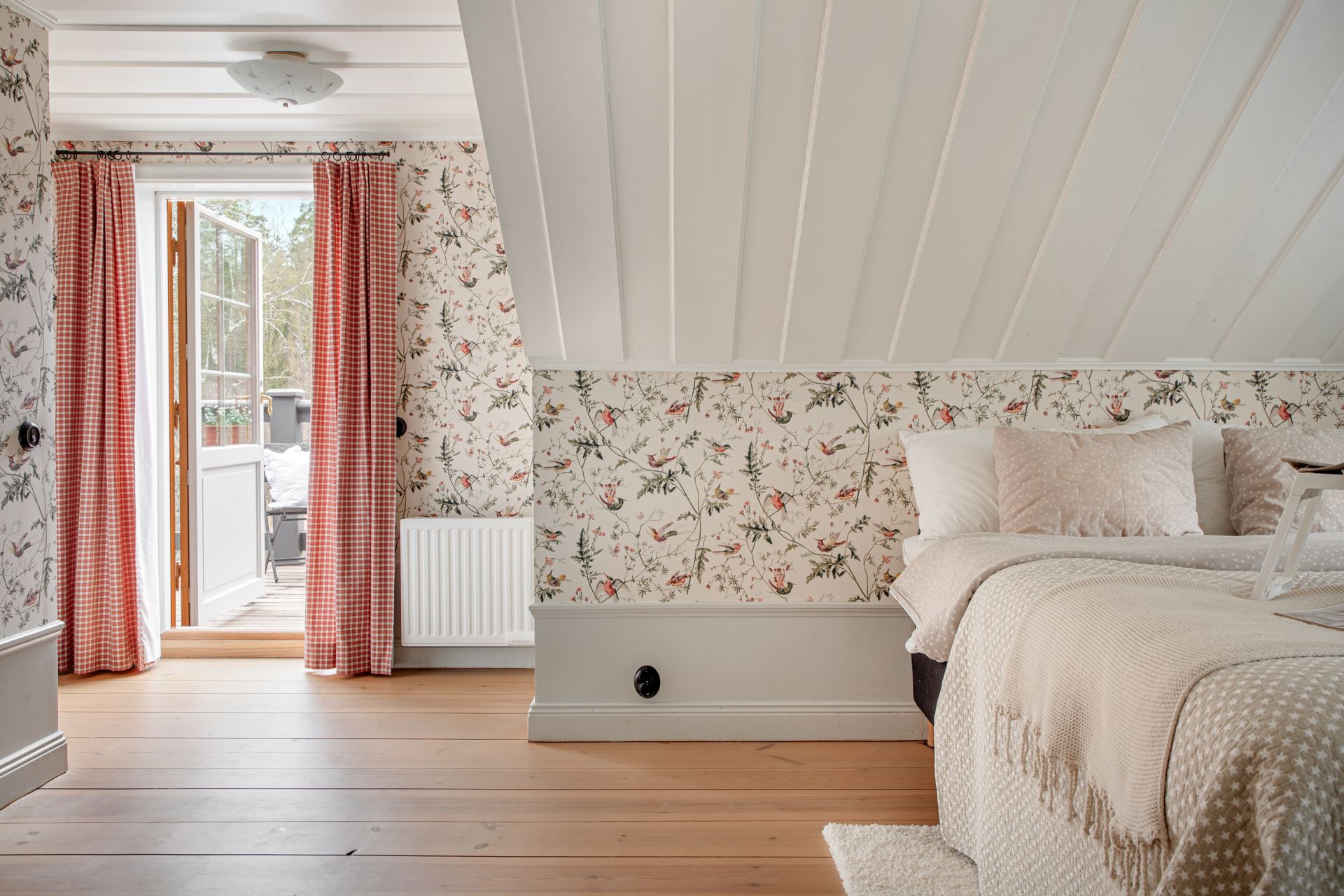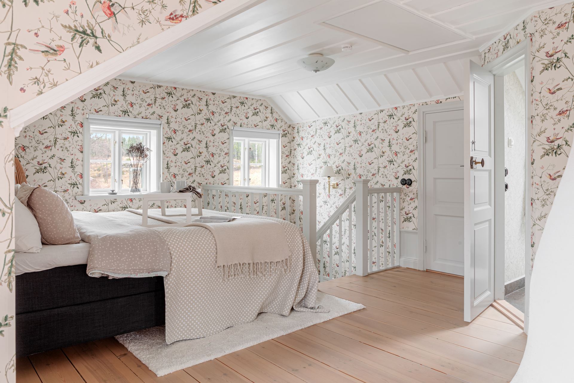 Detaljer: Snedtak och en generösare takhöjd. Utgång till balkong som vetter ner mot brygga.